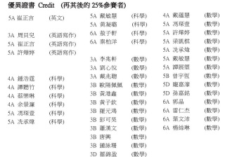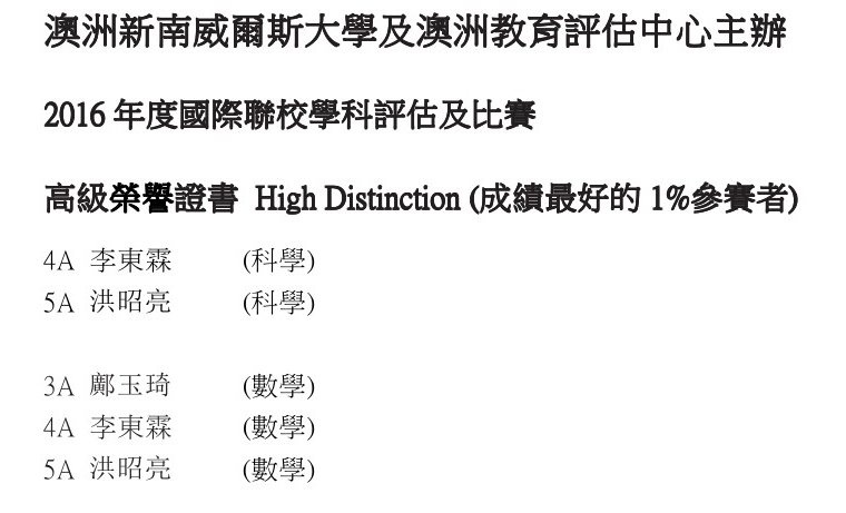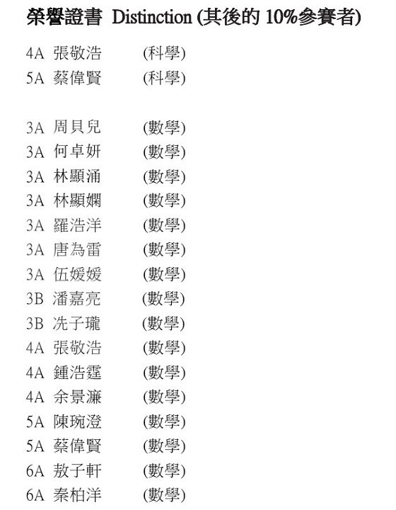 4A 張敬浩 (科學) 5A 蔡偉賢 (科學) 3A 周貝兒 (數學) 3A 何卓妍 (數學) 3A 林顯涌 (數學) 3A 林顯嫻 (數學) 3A 羅浩洋 (數學) 3A 唐為雷 (數學) 3A 伍媛媛 (數學) 3B 潘嘉亮 (數學) 3B 冼子瓏 (數學) 4A 張敬浩 (數學) 4A 鍾浩霆 (數學) 4A 余景濂 (數學) 5A 陳琬澄 (數學) 5A 蔡偉賢 (數學) 6A 敖子軒 (數學) 6A 秦柏洋 (數學)