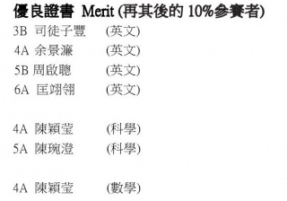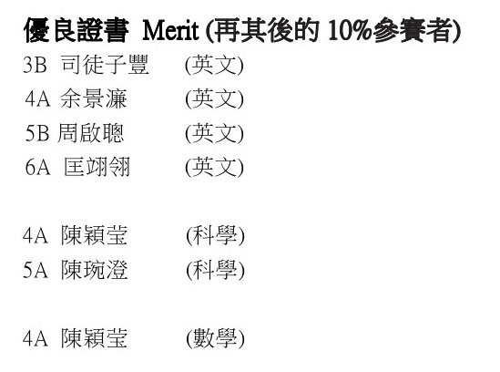 3B 司徒子豐 (英文) 4A 余景濂 (英文) 5B 周啟聰 (英文) 6A 匡翊翎 (英文) 4A 陳穎莹 (科學) 5A 陳琬澄 (科學) 4A 陳穎莹 (數學)