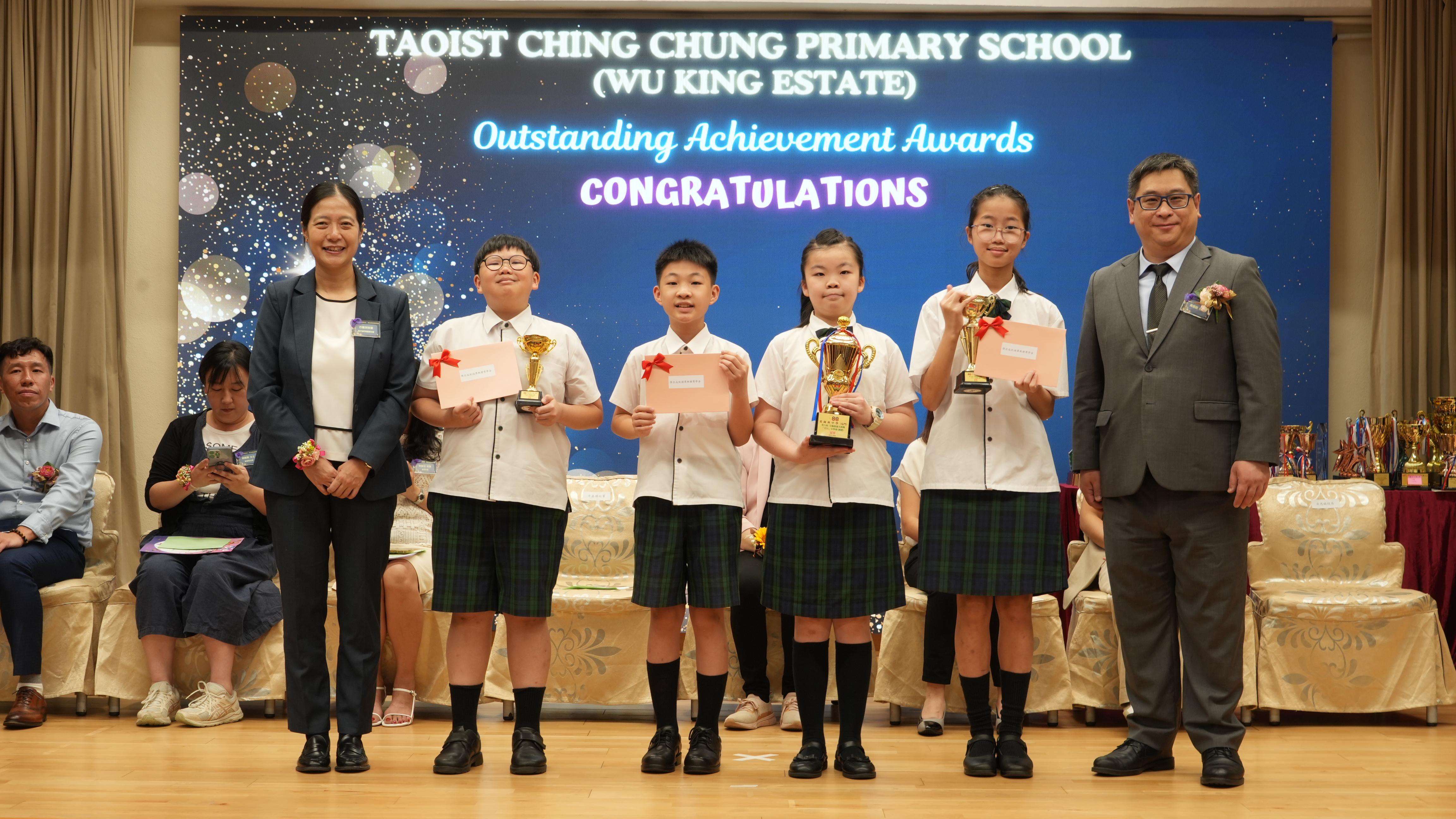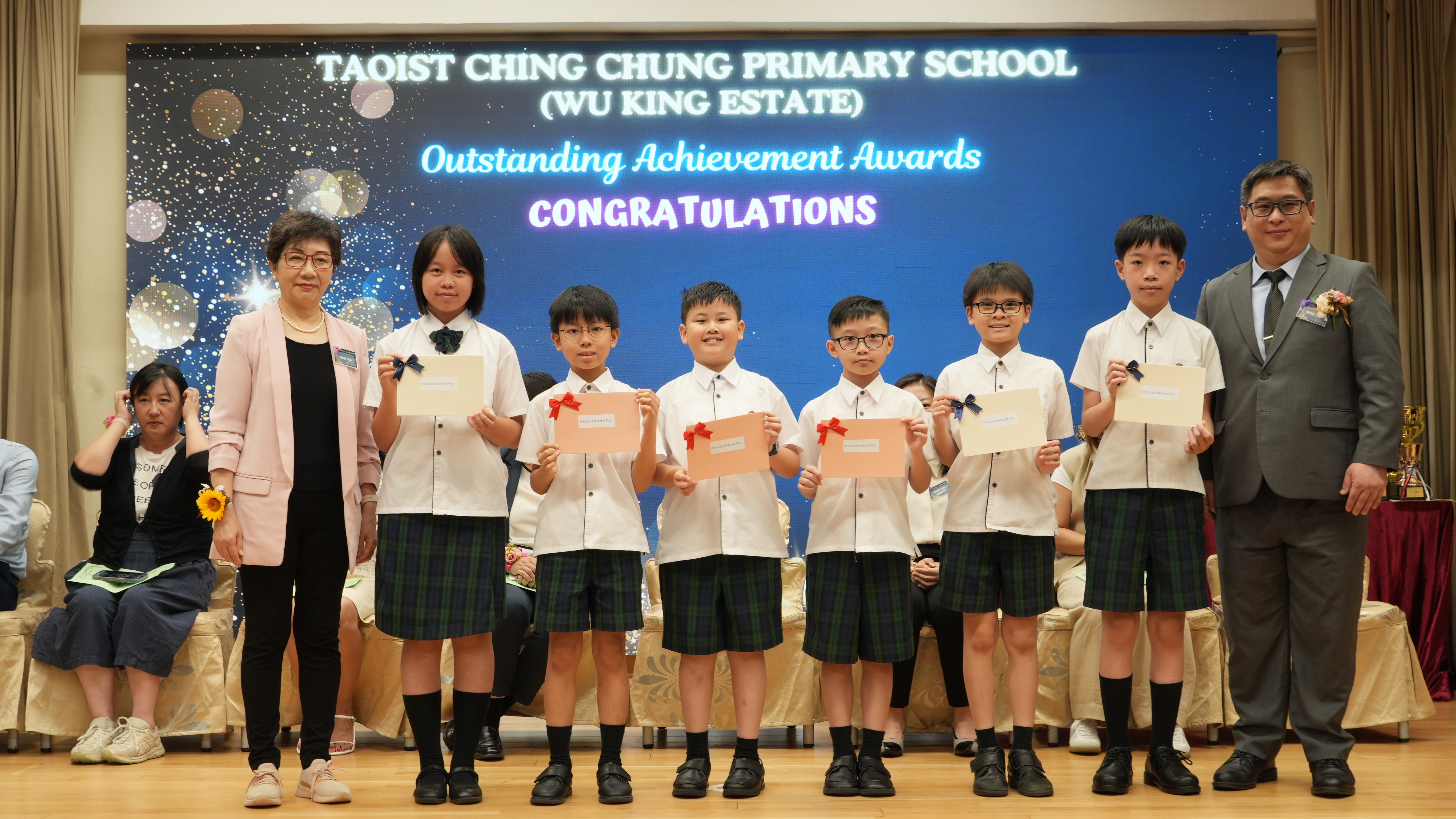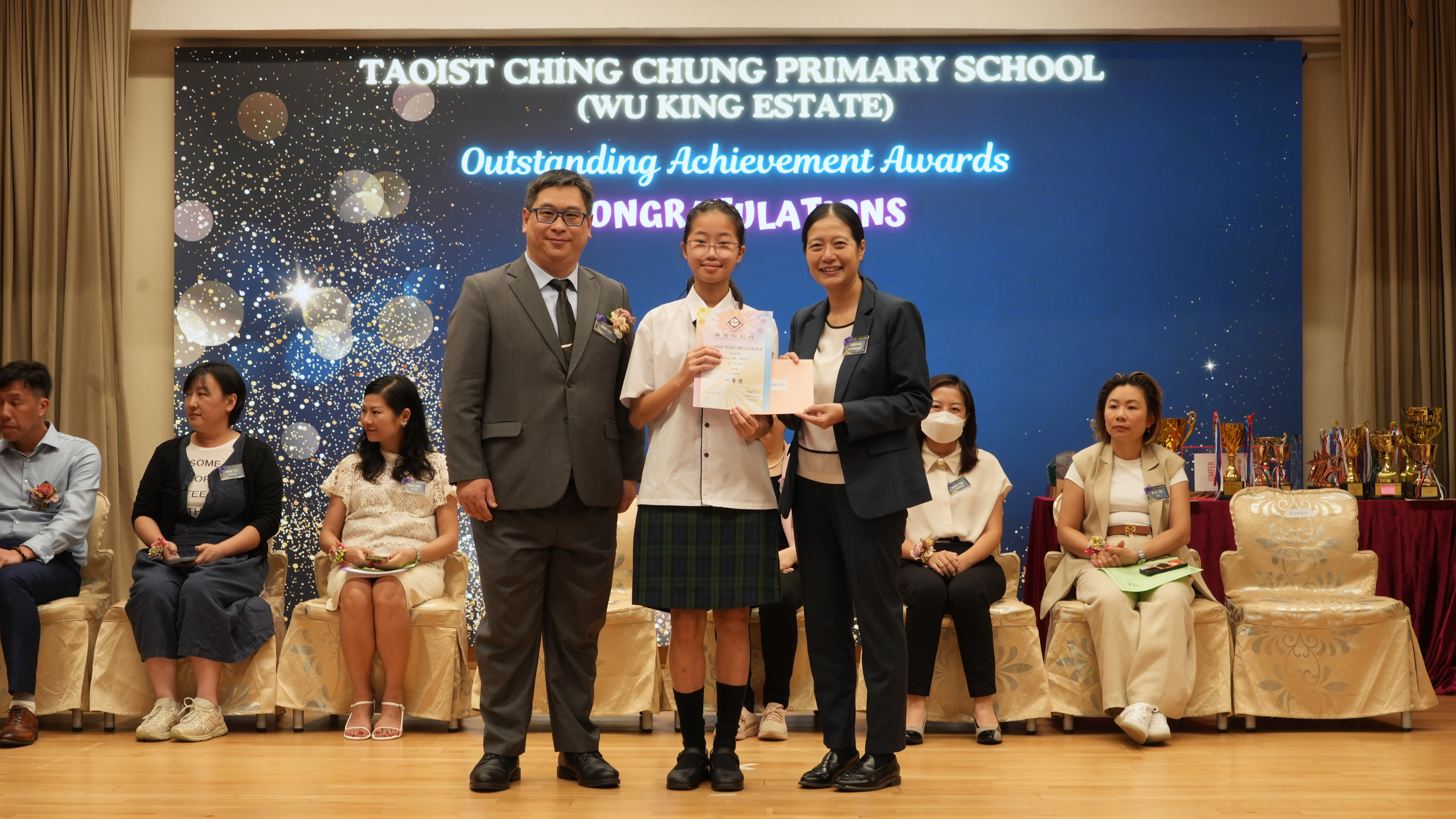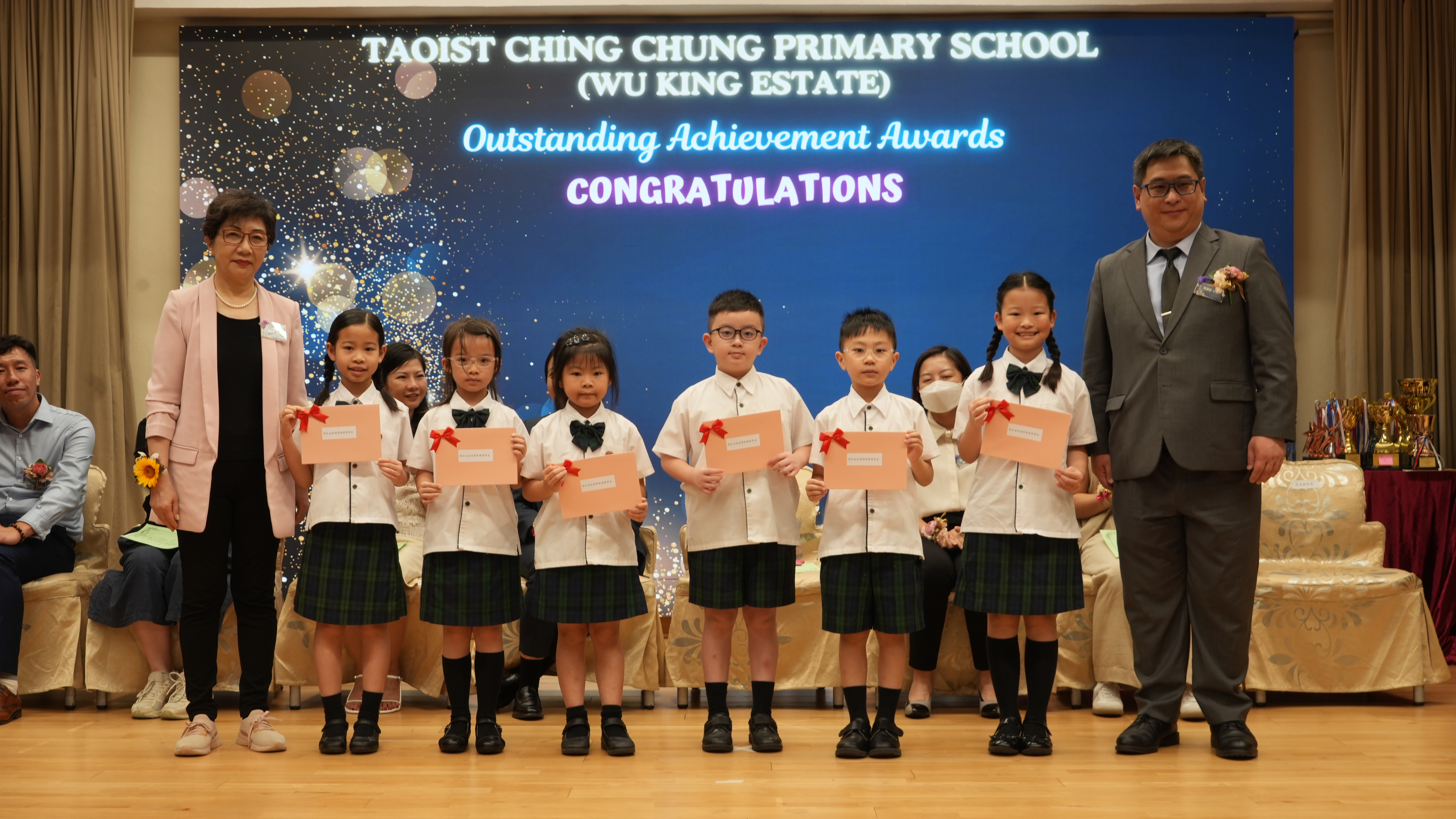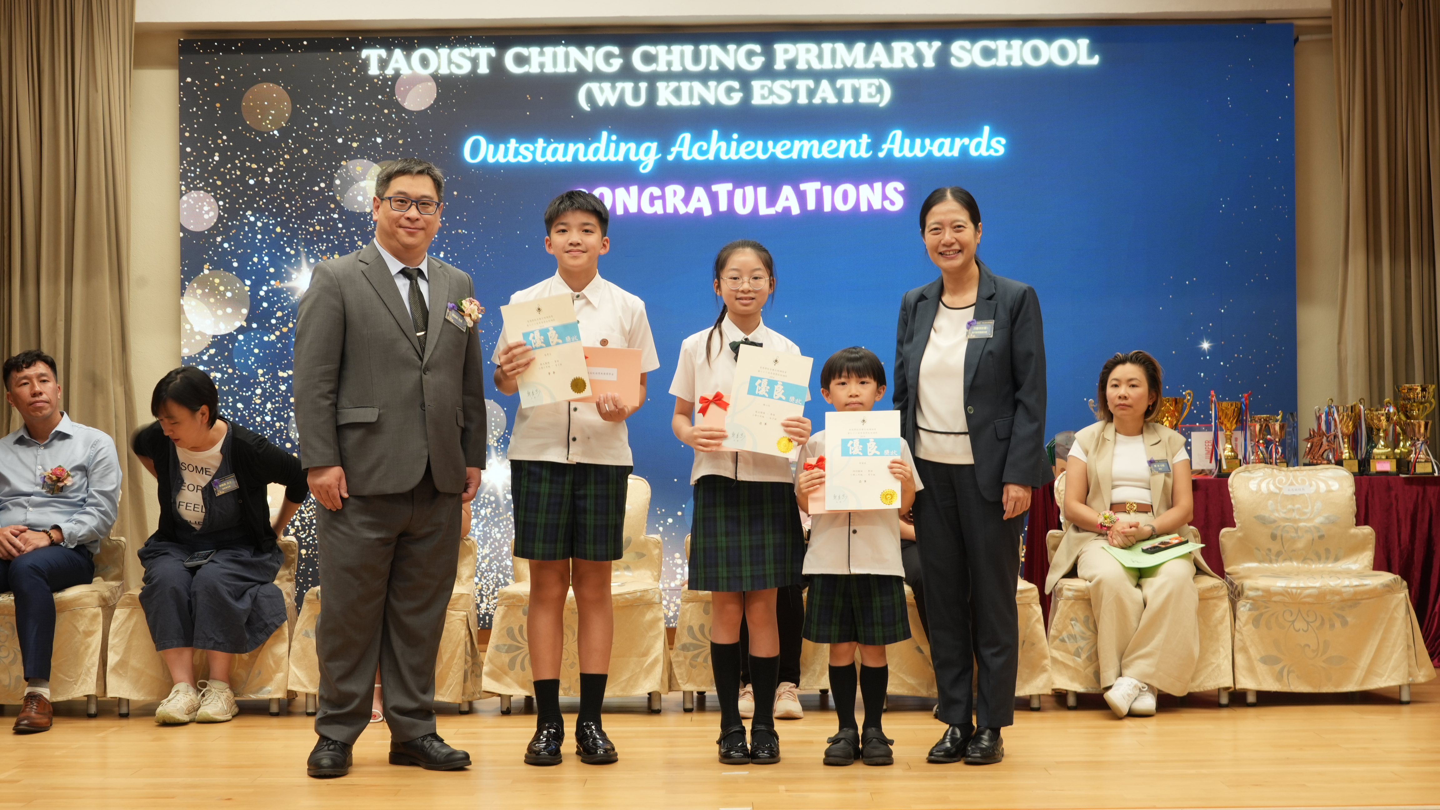 本年度傑出成就頒獎典禮,由校監趙淑儀女士、辦學團體校董趙卓敏女士、辦學團體校董方嘉琪女士、家長校董陳栩淨女士、校友校董凌紹球先生、家教會主席承曉燕女士、校友韓冰女士為頒獎嘉賓。是次典禮頒獎項目高達一百多項,再次祝賀獲獎的同學和家長,期望同學繼續努力,超越自我,再創高峰!