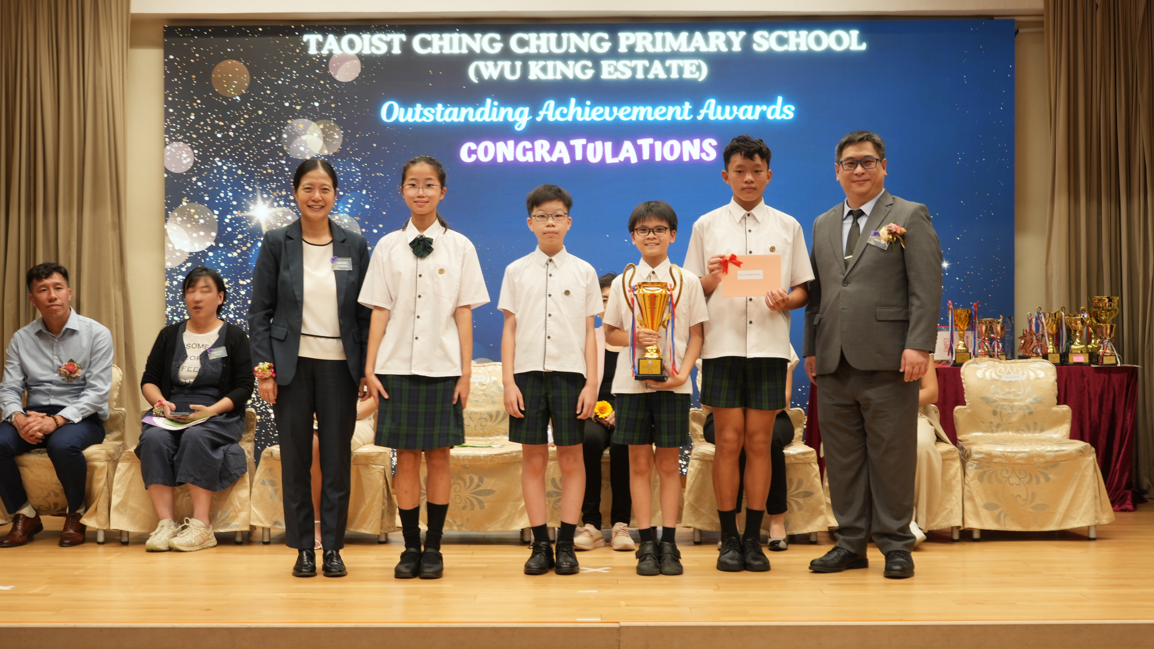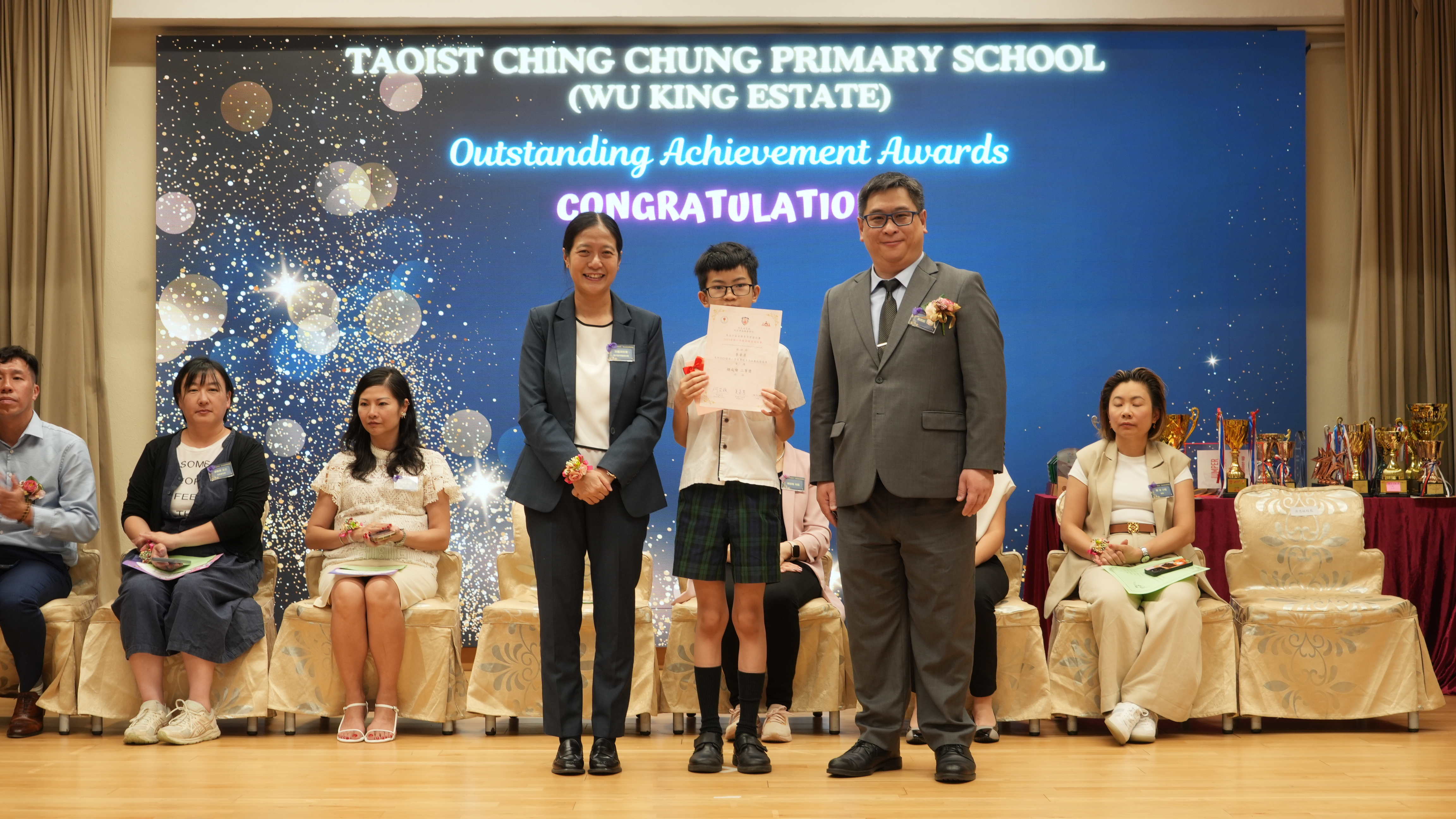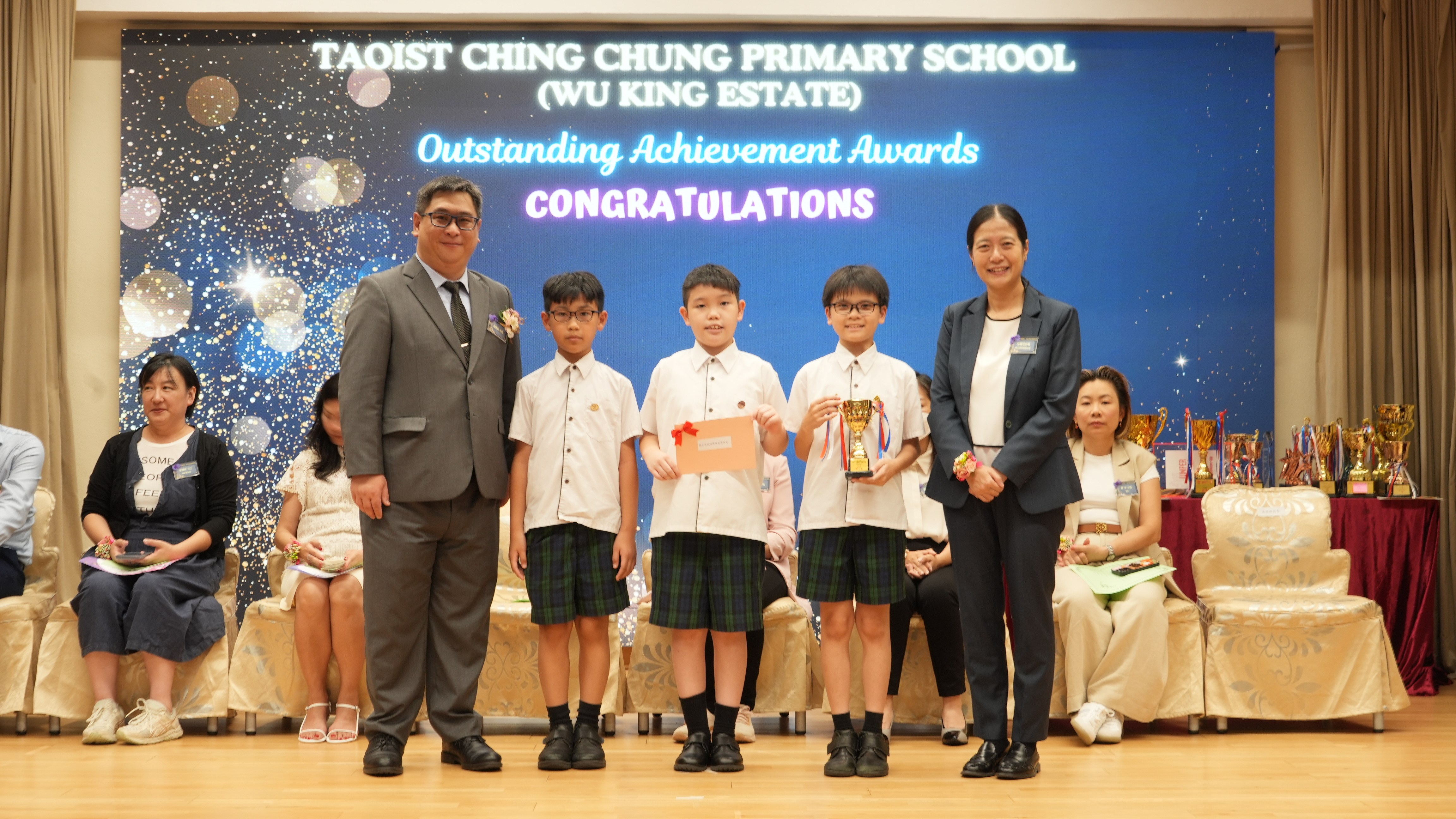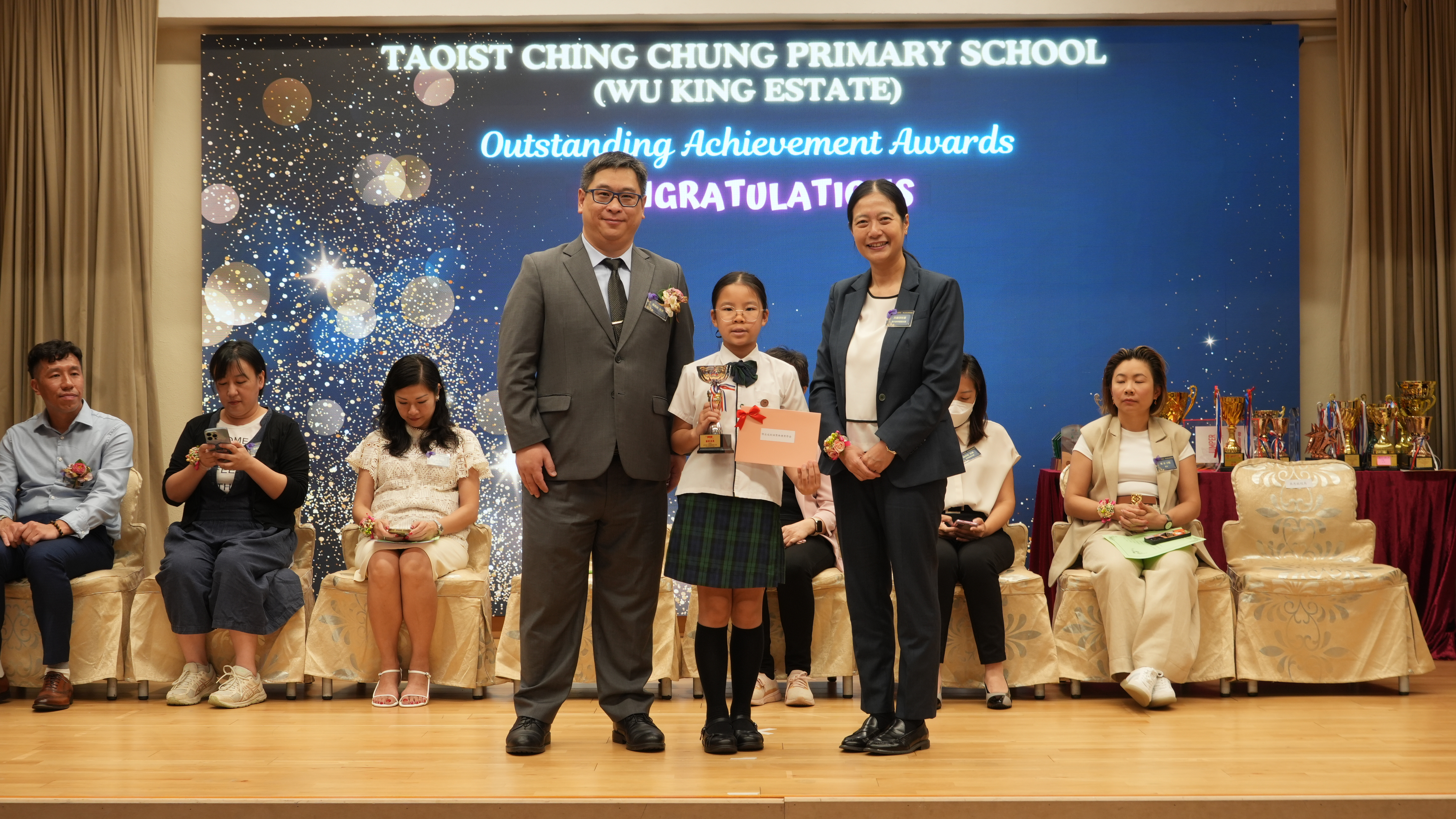 本年度傑出成就頒獎典禮,由校監趙淑儀女士、辦學團體校董趙卓敏女士、辦學團體校董方嘉琪女士、家長校董陳栩淨女士、校友校董凌紹球先生、家教會主席承曉燕女士、校友韓冰女士為頒獎嘉賓。是次典禮頒獎項目高達一百多項,再次祝賀獲獎的同學和家長,期望同學繼續努力,超越自我,再創高峰!