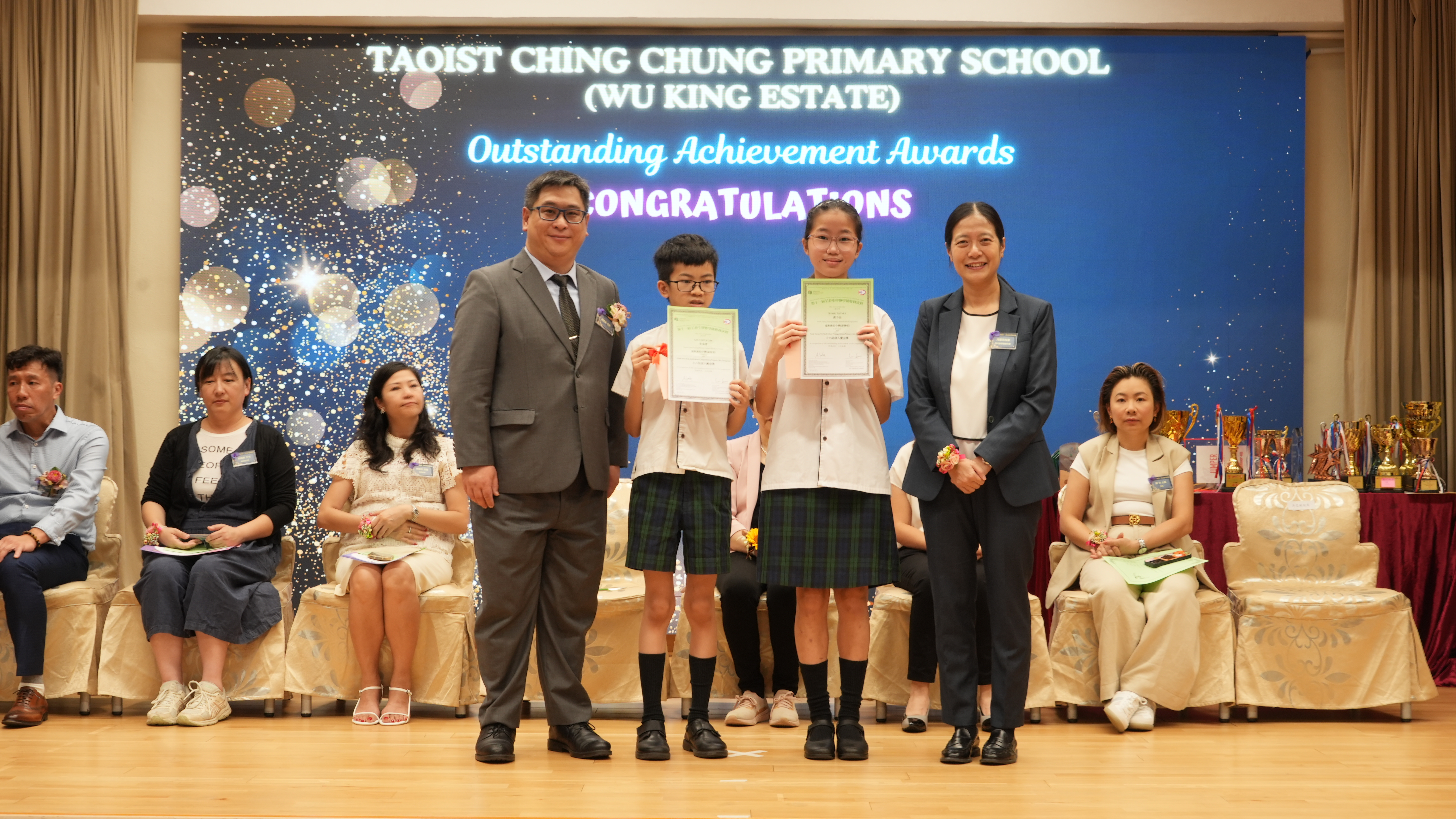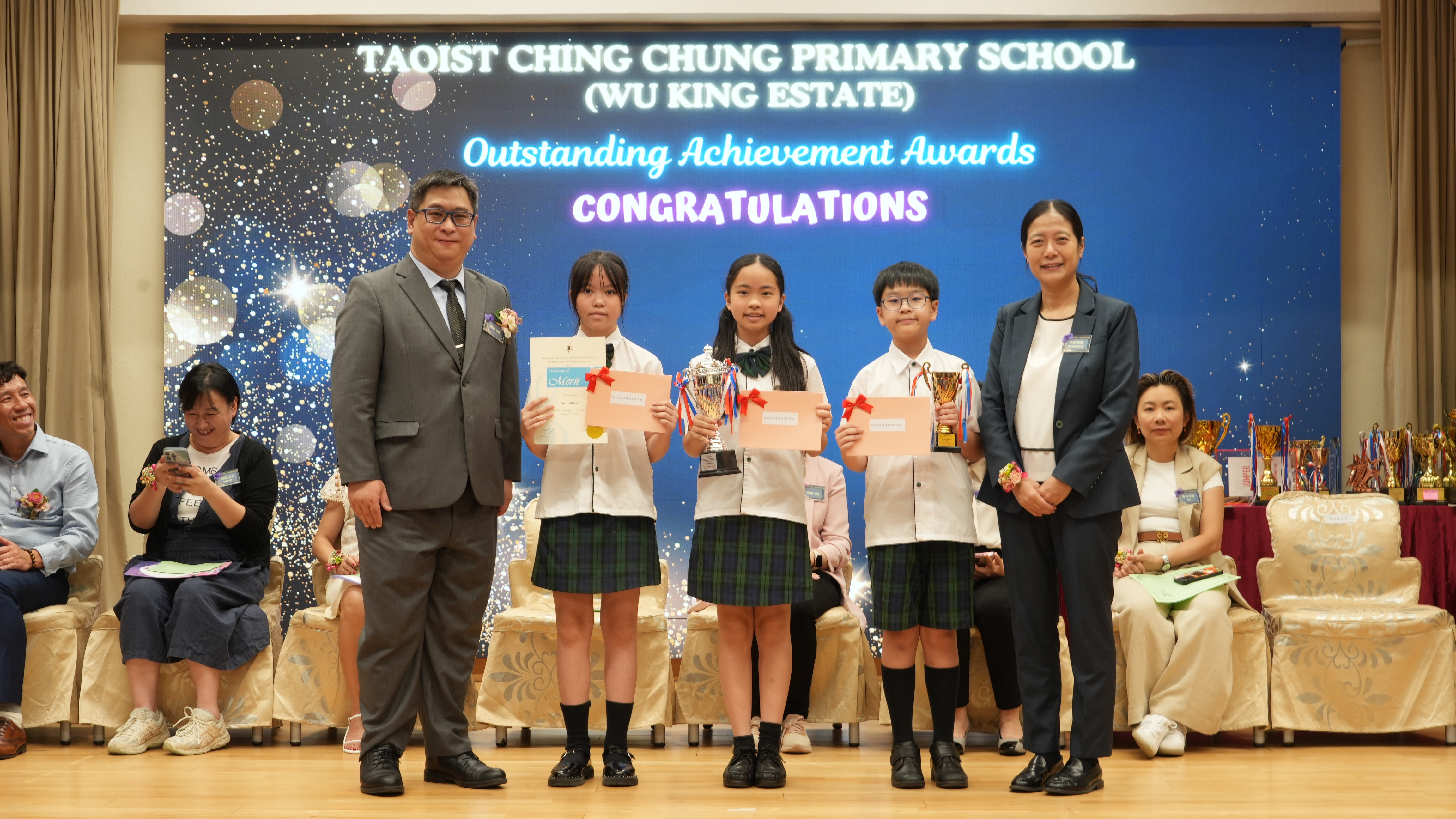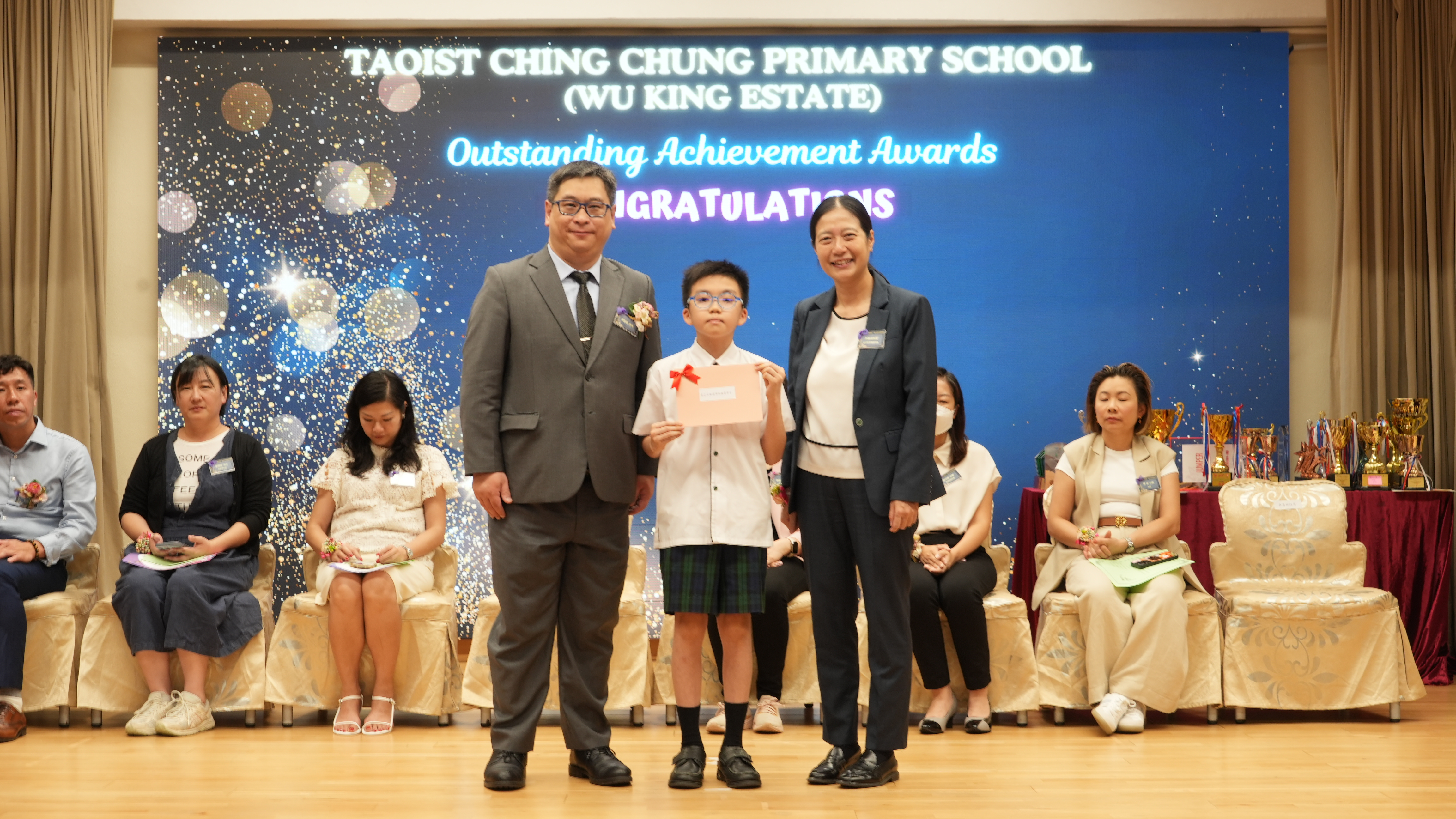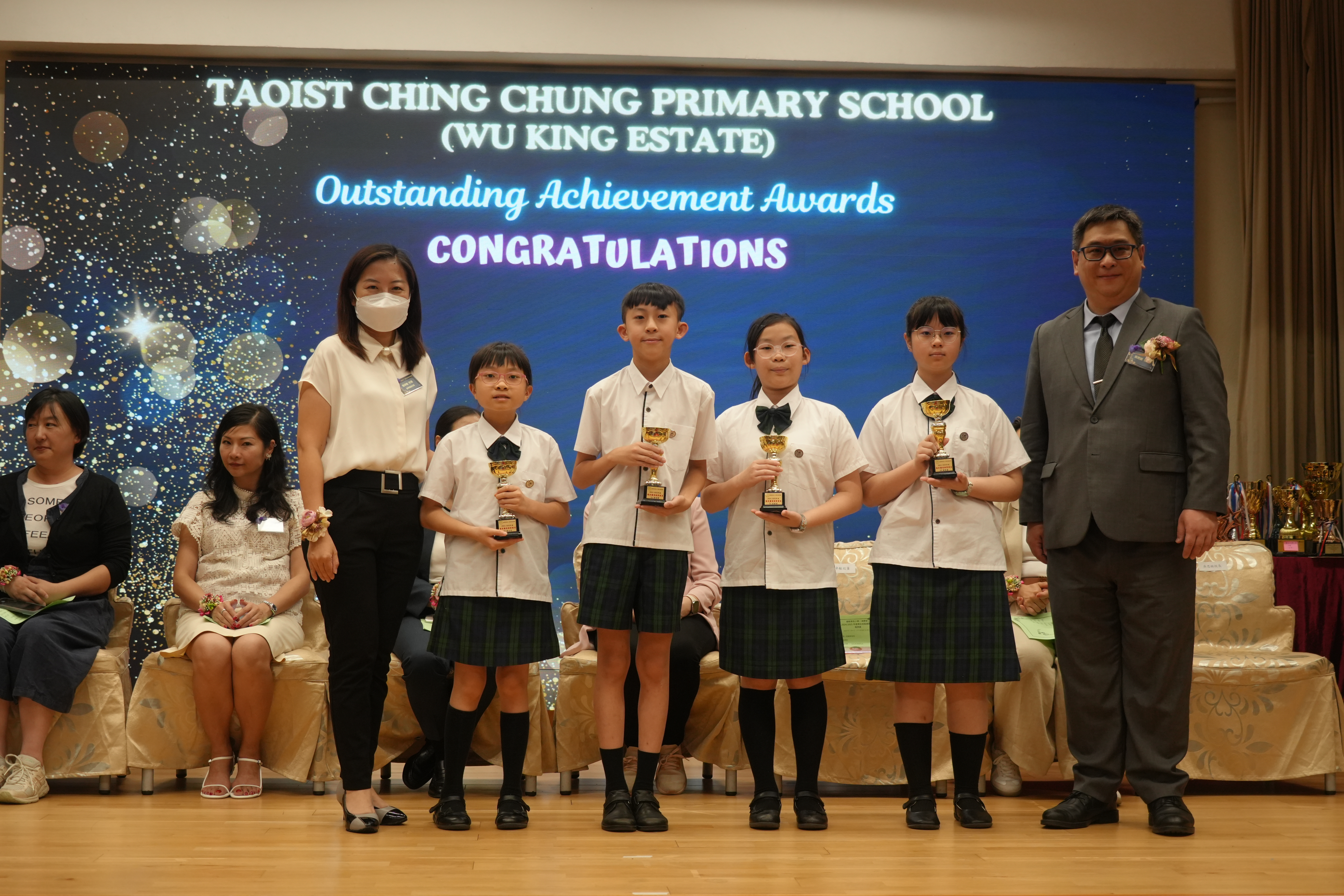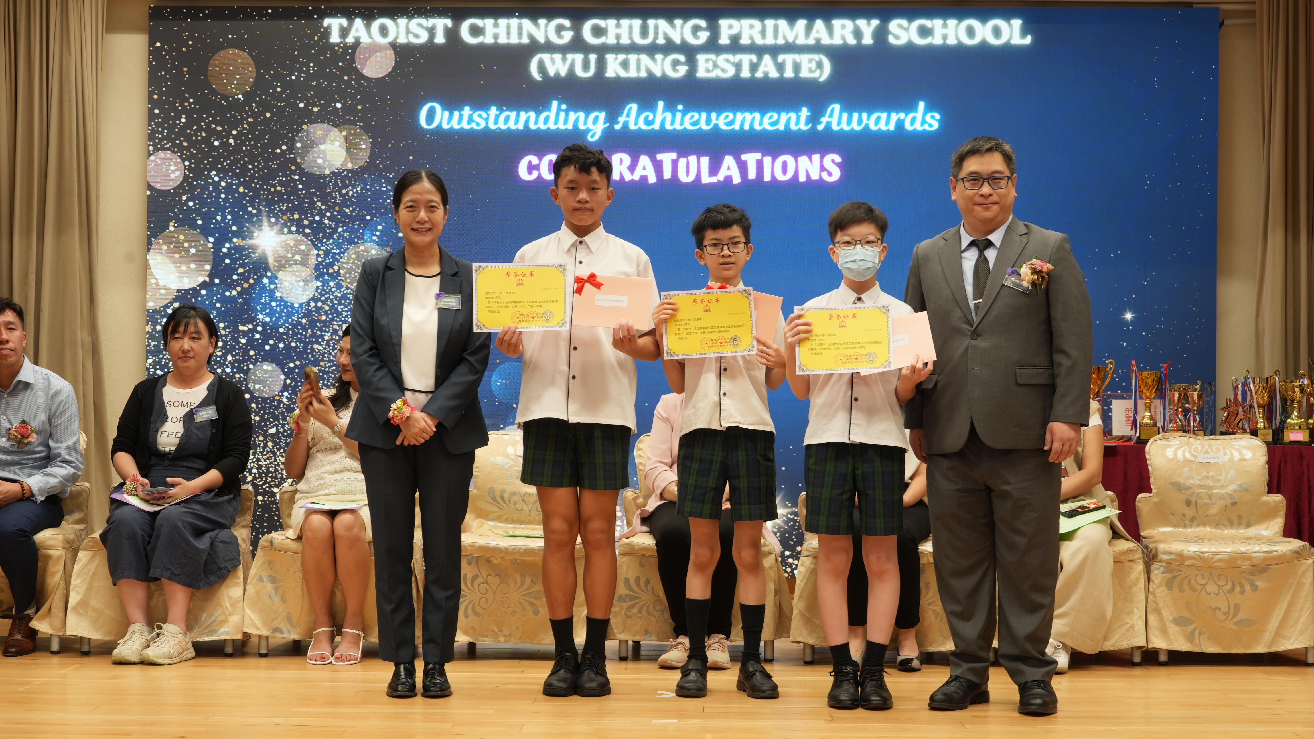 本年度傑出成就頒獎典禮,由校監趙淑儀女士、辦學團體校董趙卓敏女士、辦學團體校董方嘉琪女士、家長校董陳栩淨女士、校友校董凌紹球先生、家教會主席承曉燕女士、校友韓冰女士為頒獎嘉賓。是次典禮頒獎項目高達一百多項,再次祝賀獲獎的同學和家長,期望同學繼續努力,超越自我,再創高峰!
