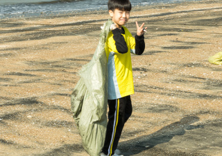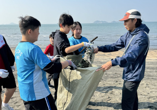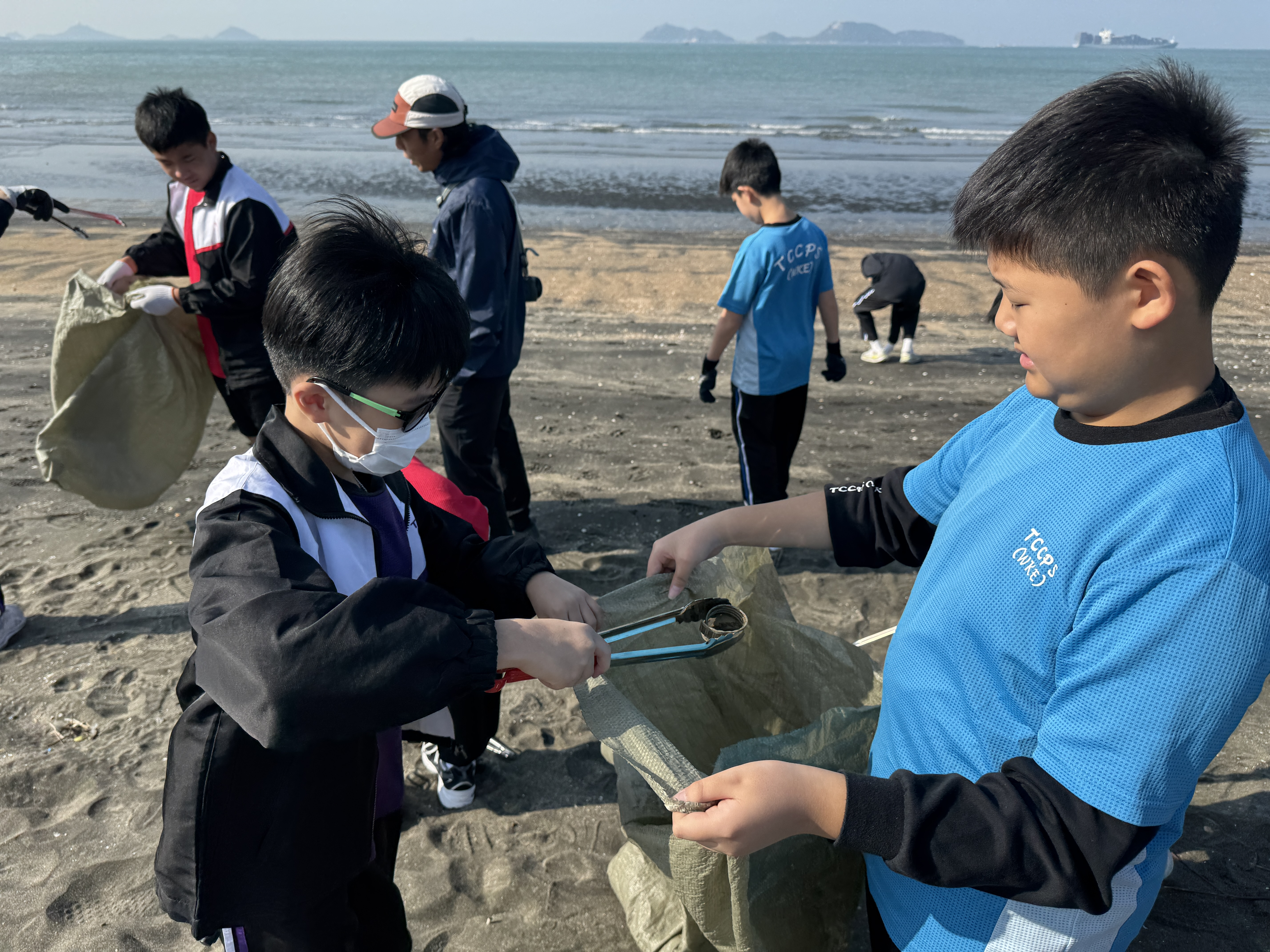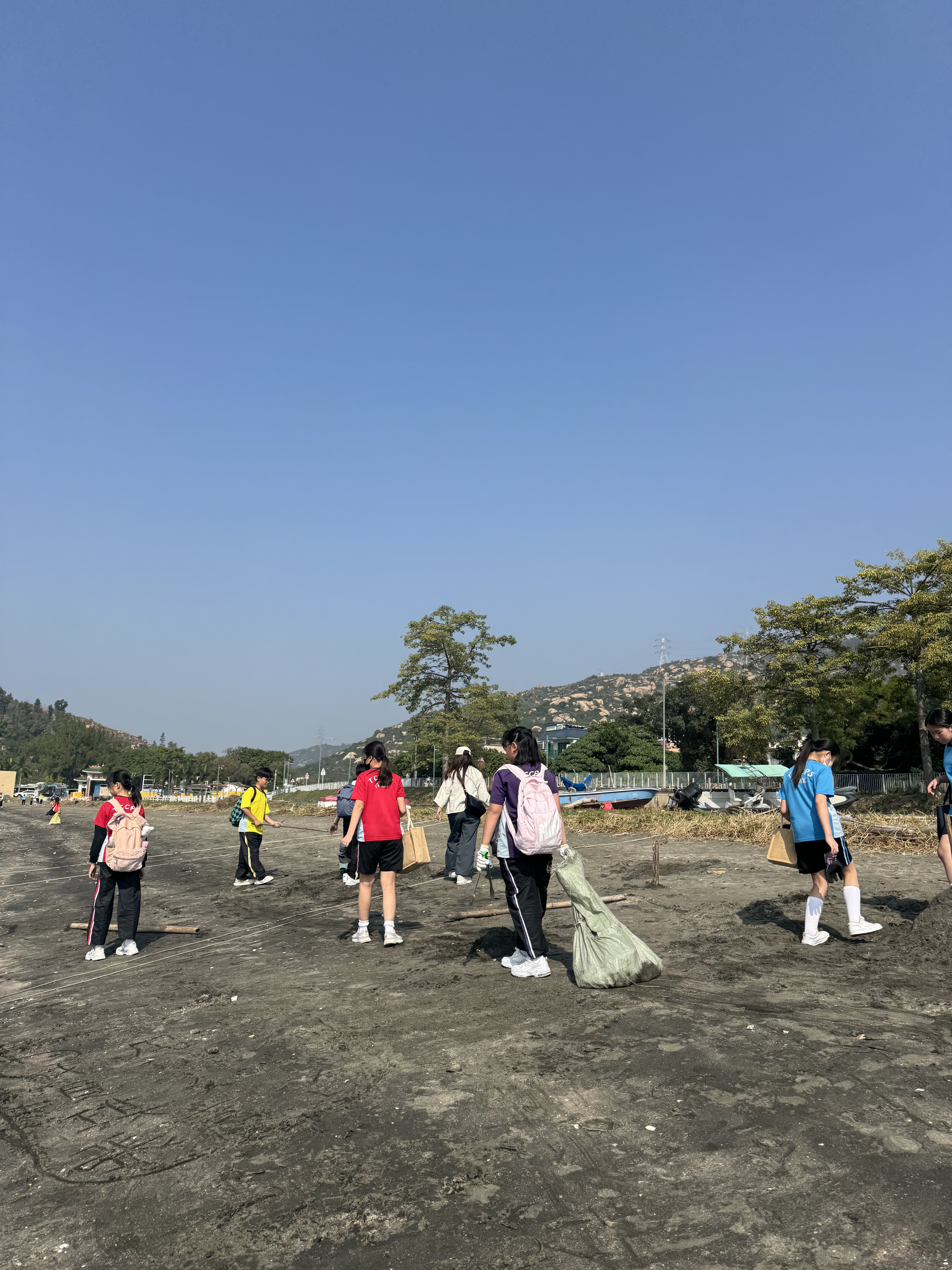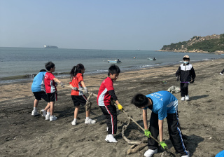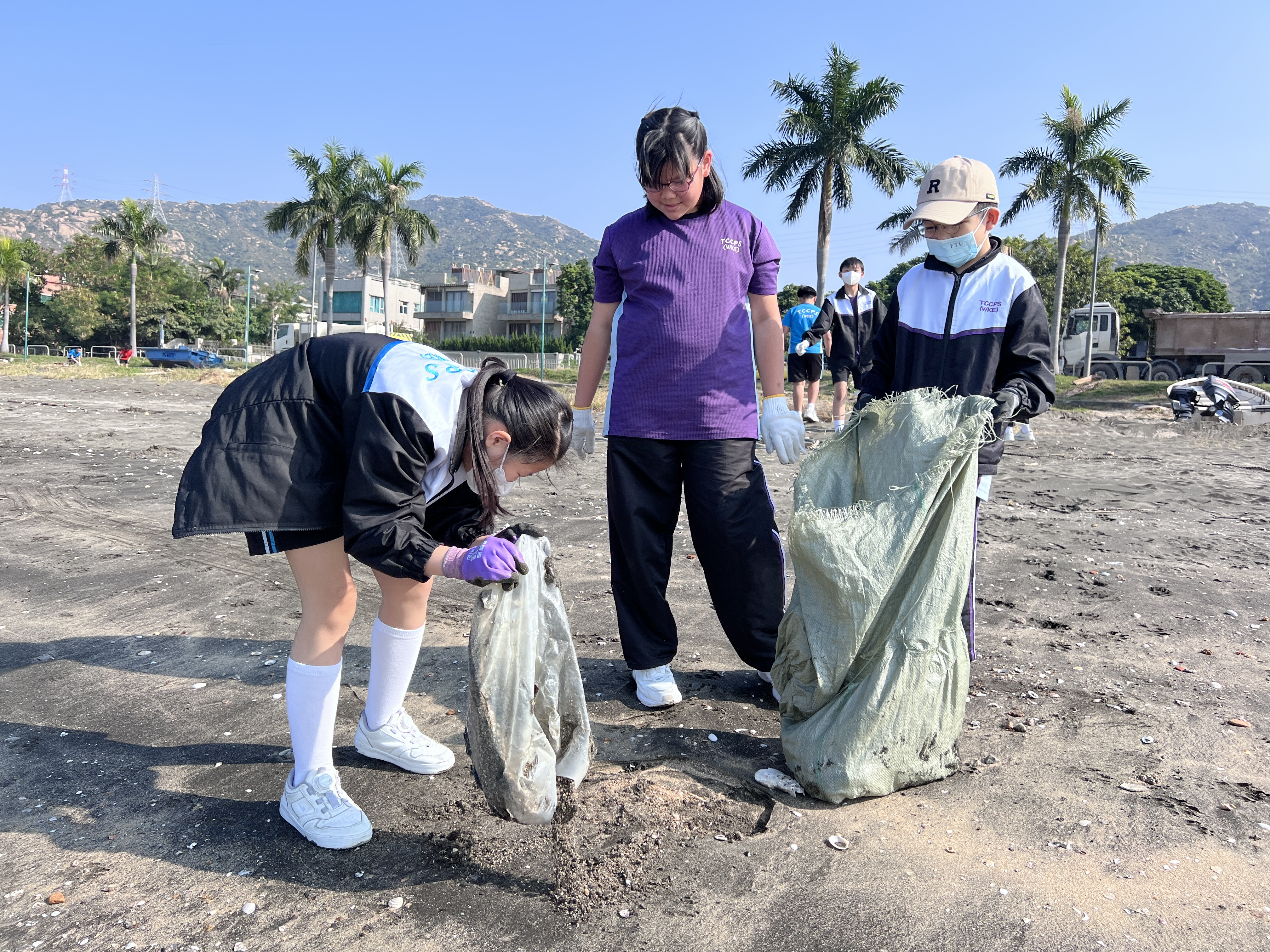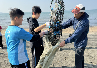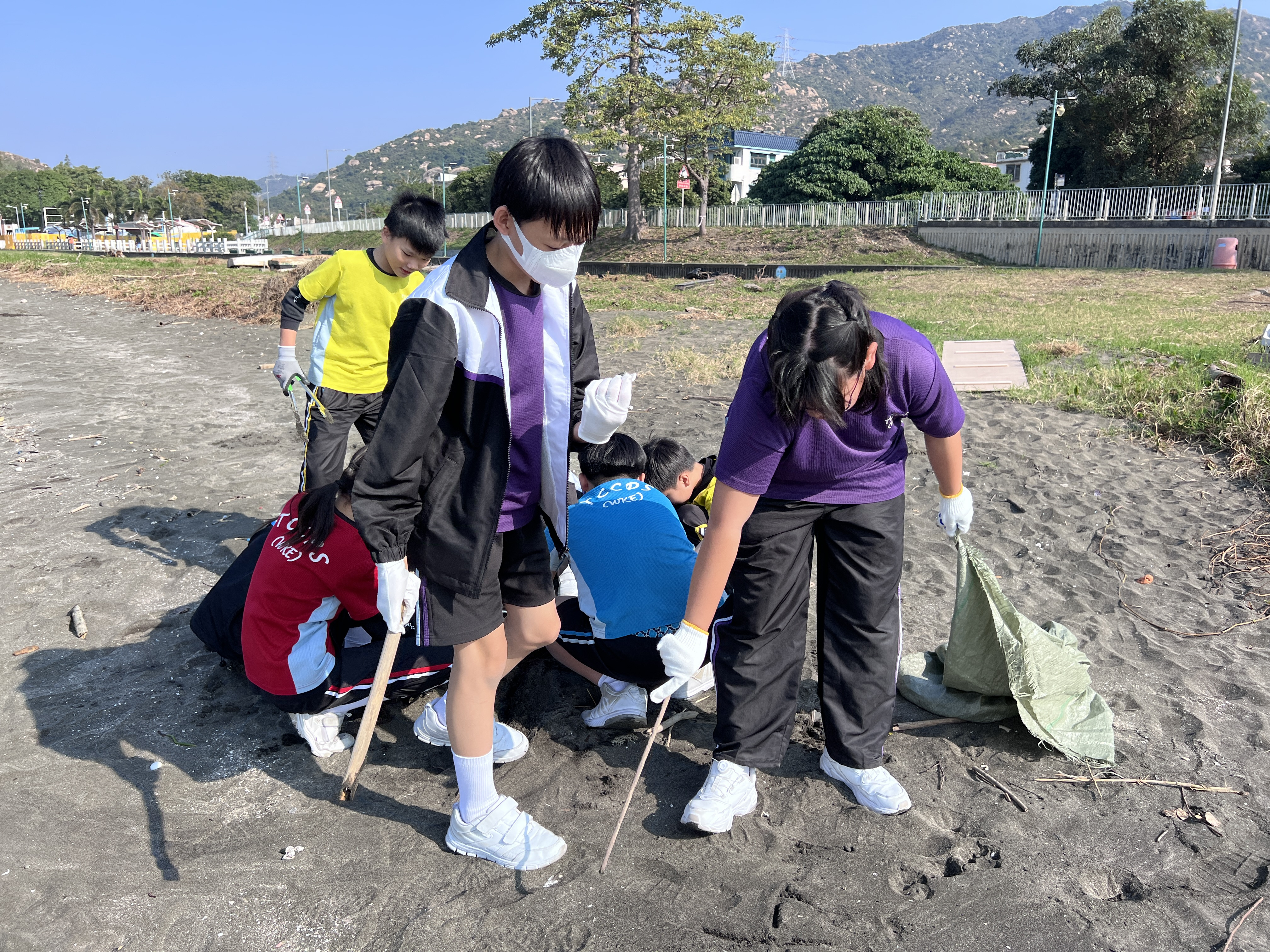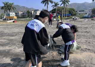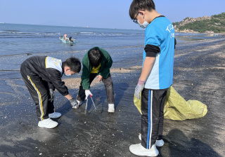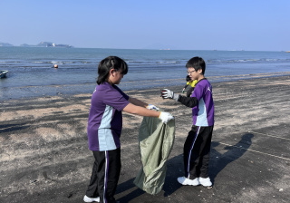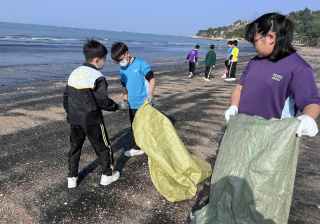 一眾學生身體力行在龍鼓灘參與清潔沙灘活動,為保護環境出一分力。
