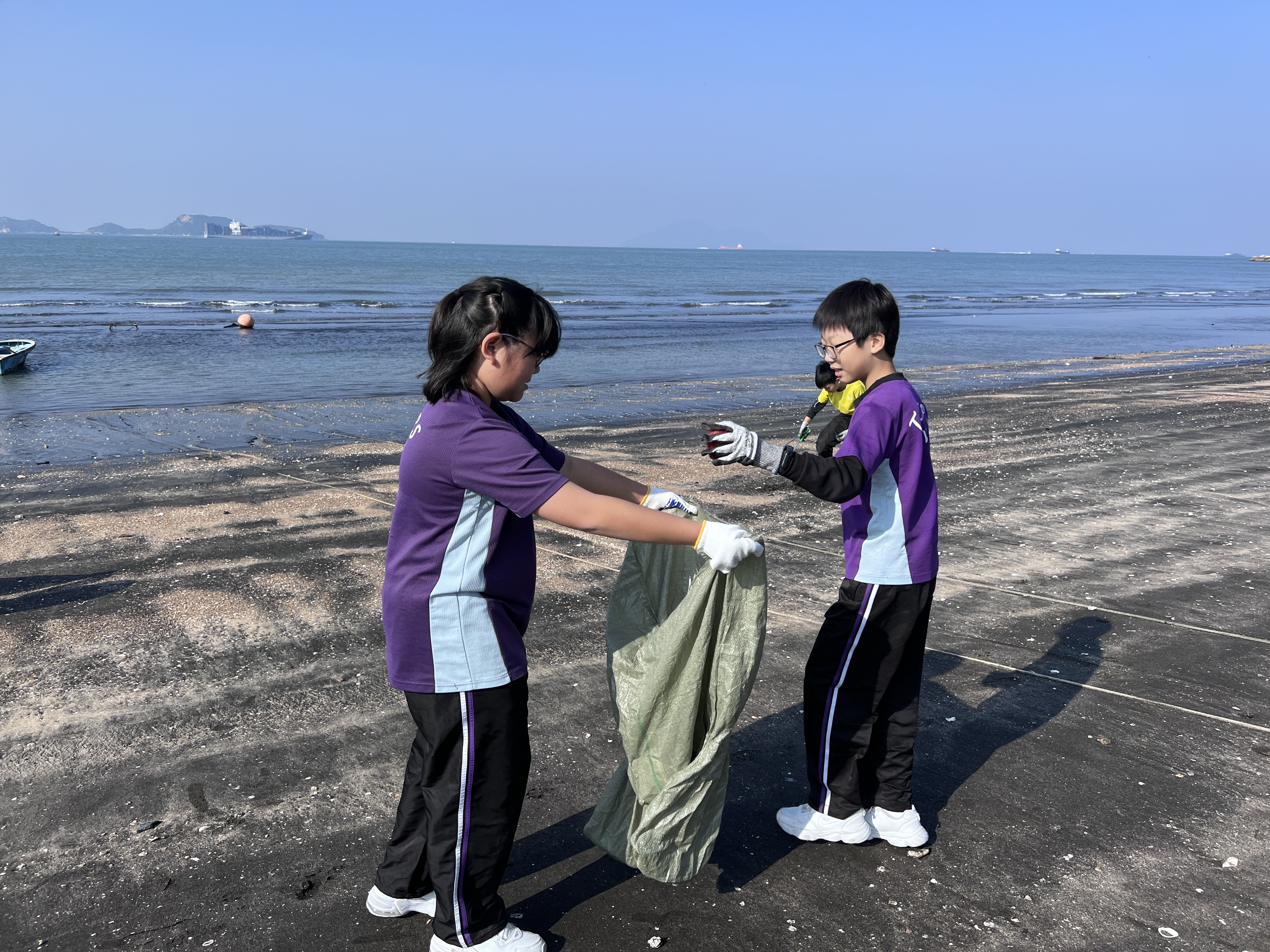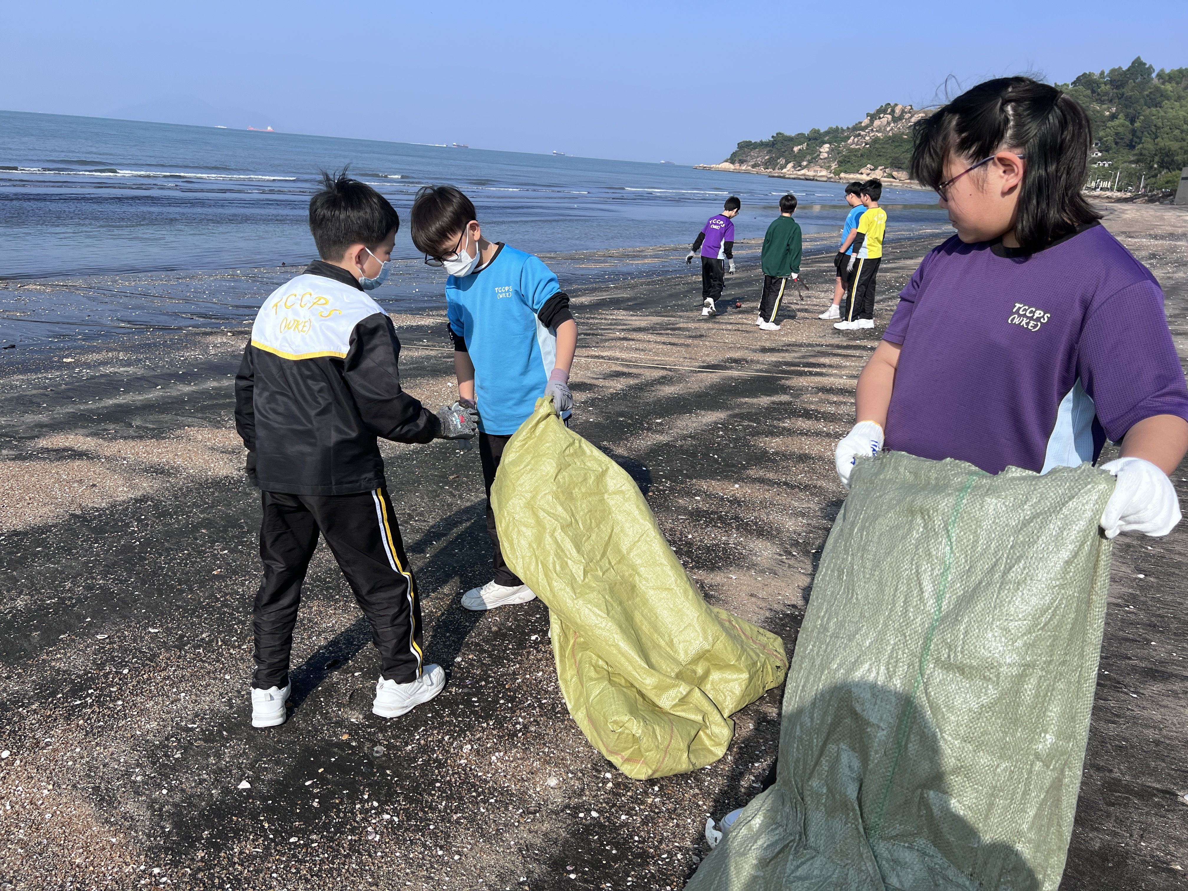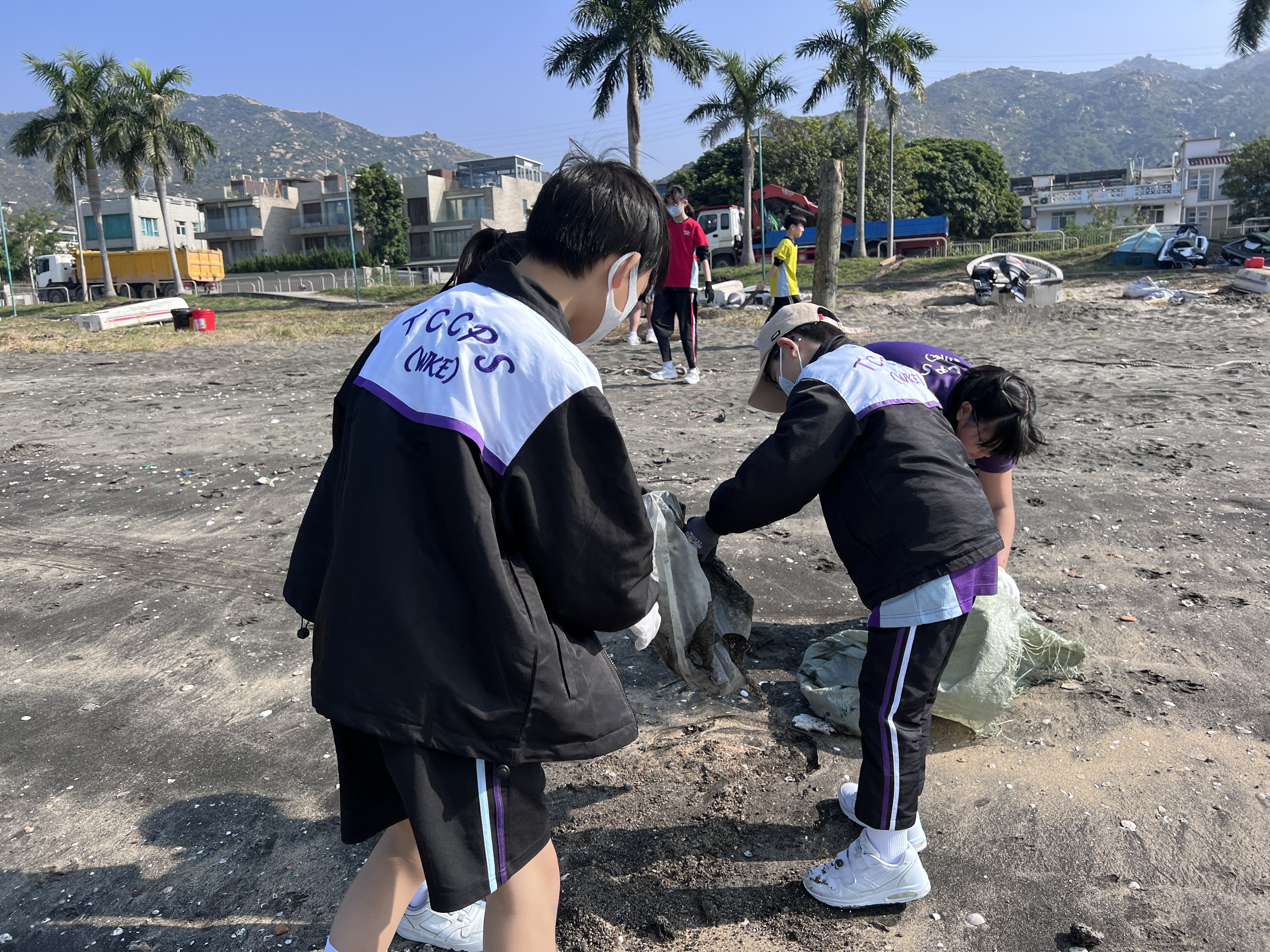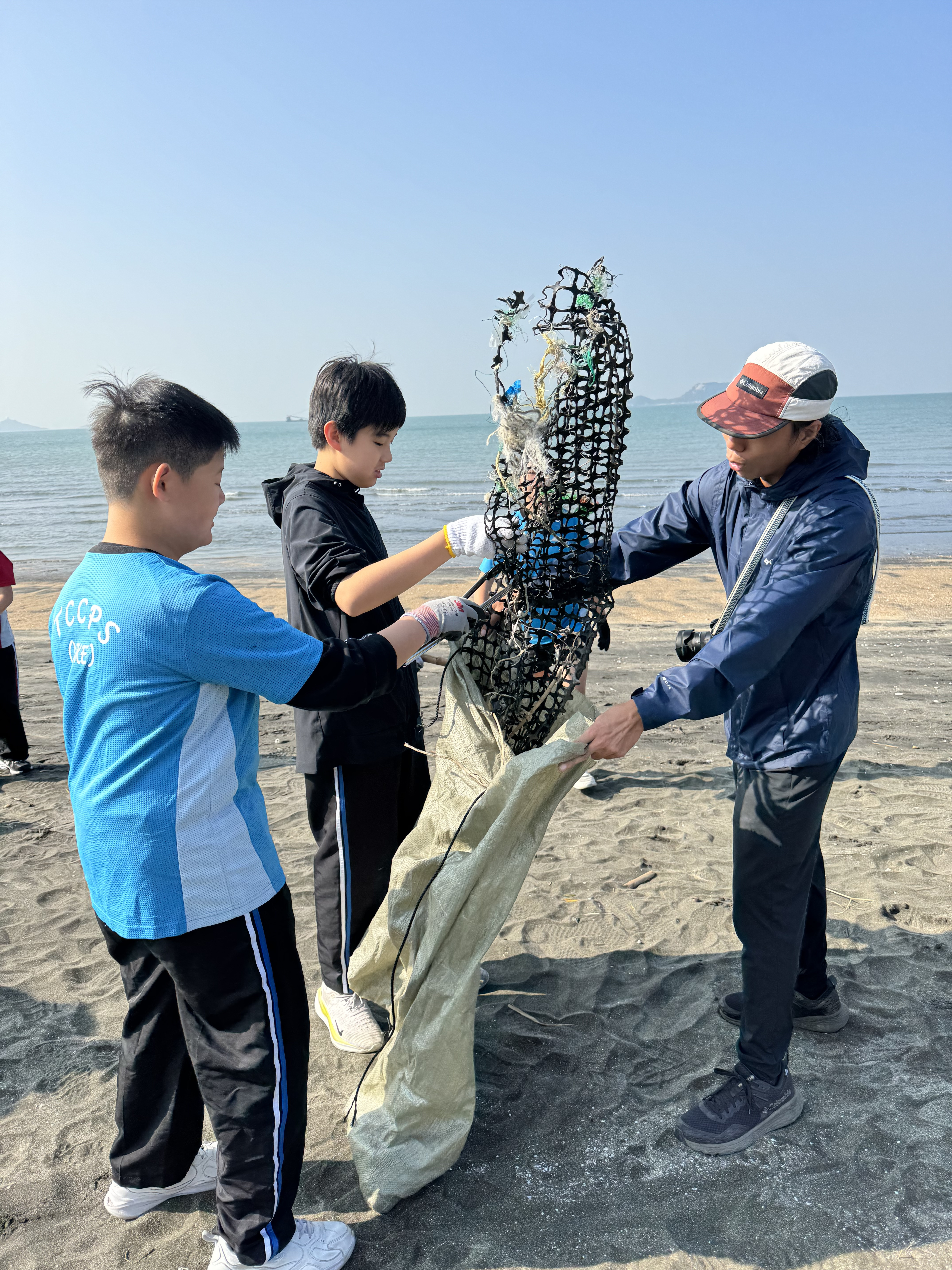 一眾學生身體力行在龍鼓灘參與清潔沙灘活動,為保護環境出一分力。
