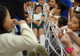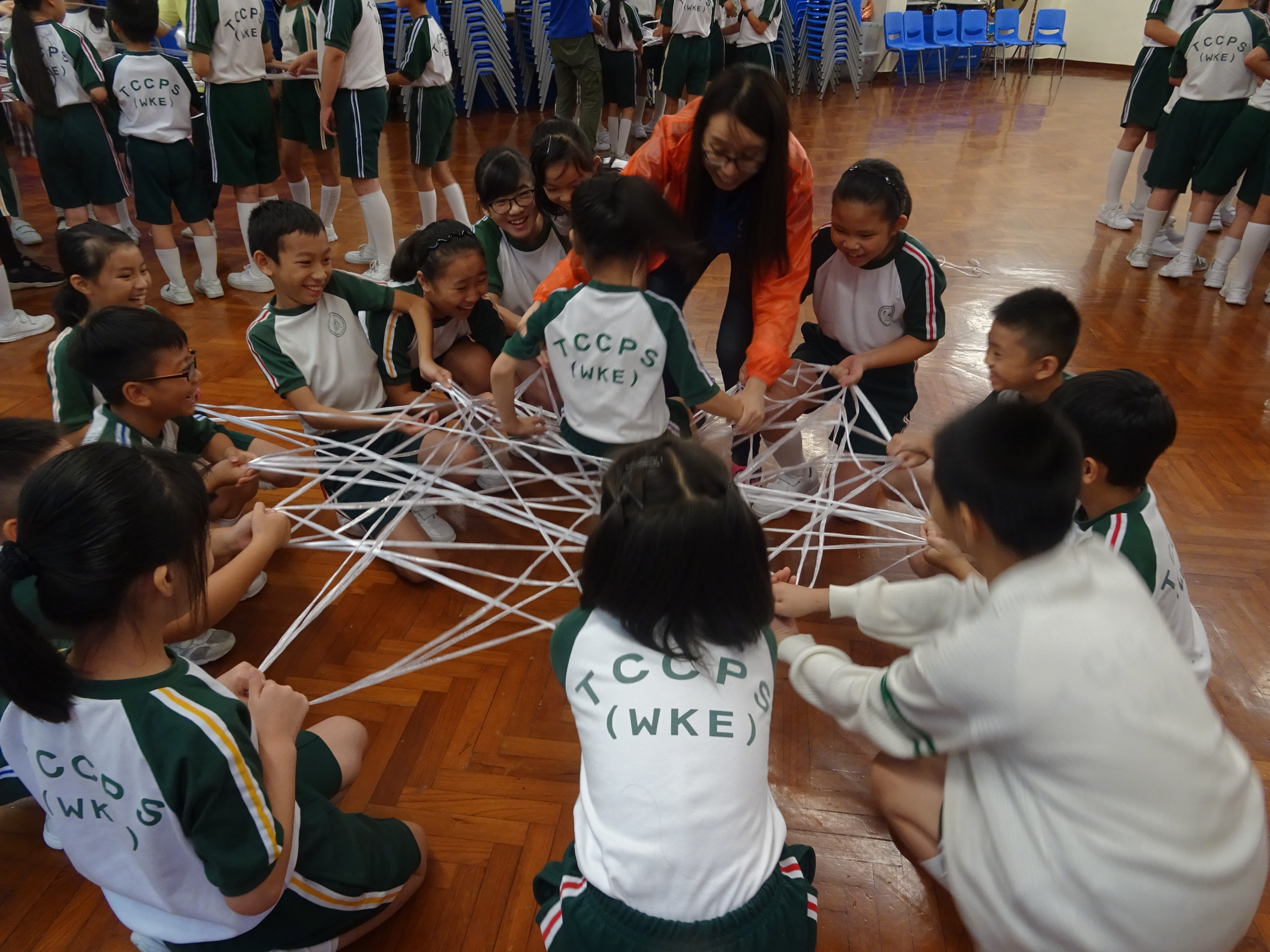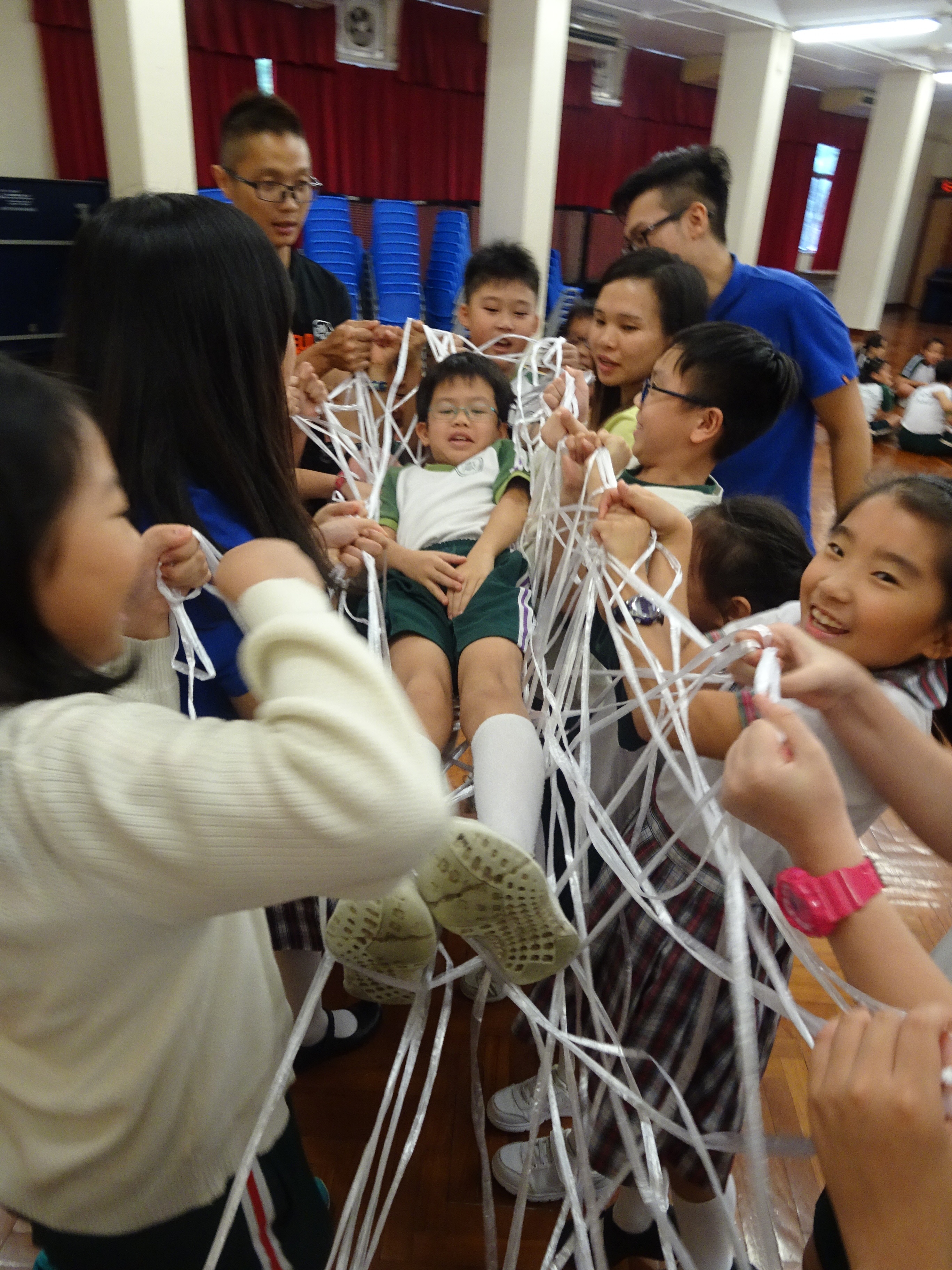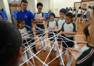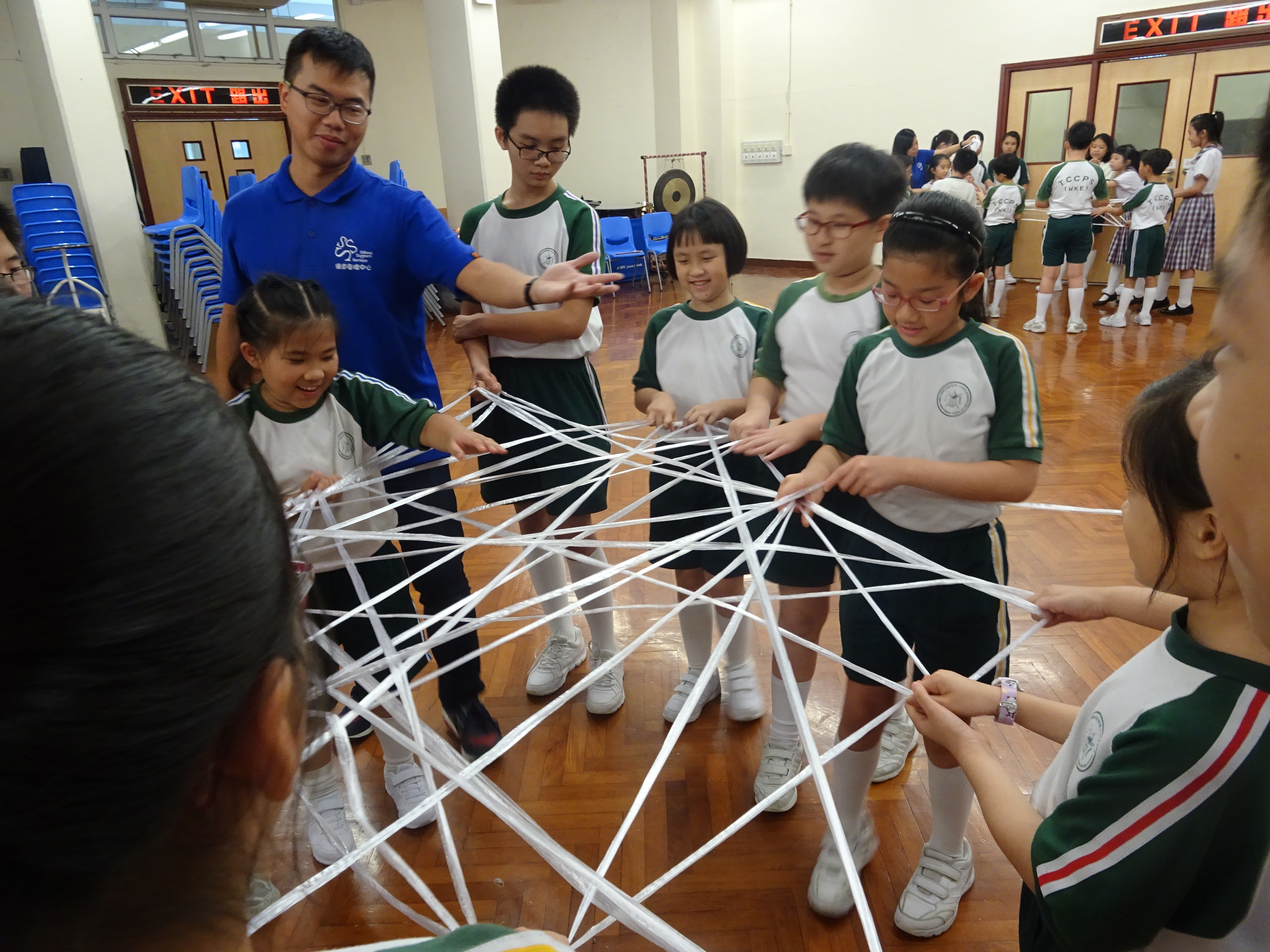 「蜘蛛網載人」活動要求十多位隊員用尼龍繩製造蜘蛛網,然後讓隊員坐在網上,其他隊員合力將其托起,