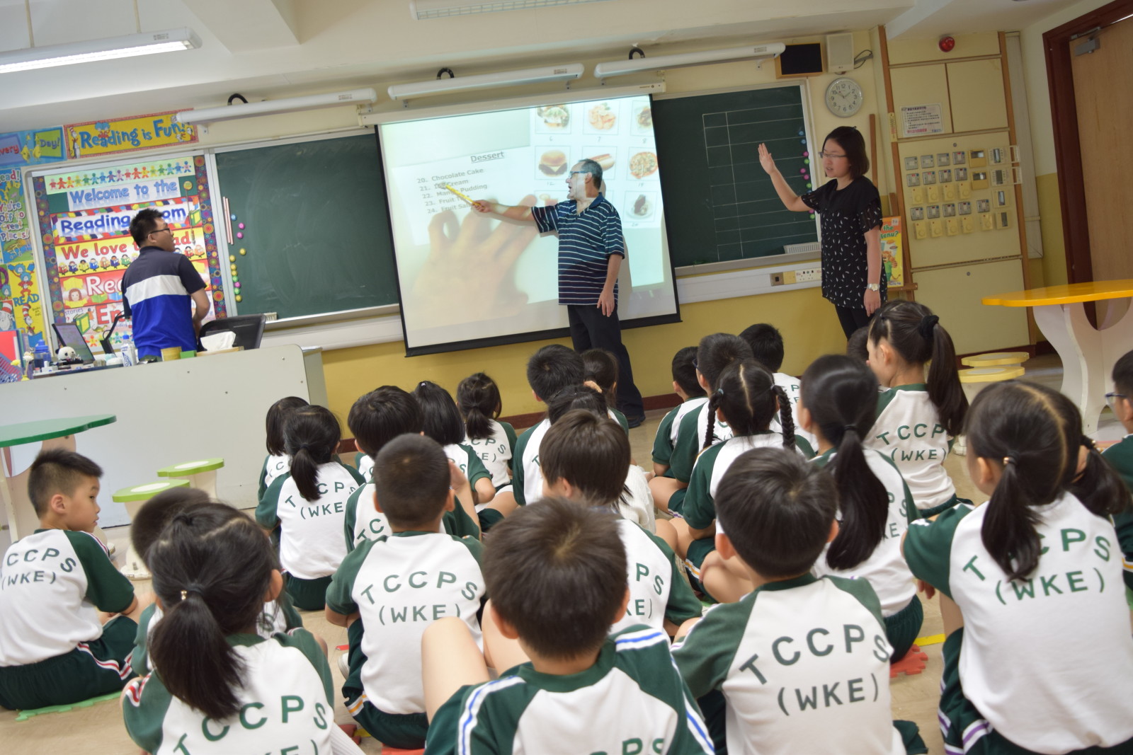 In order to enhance the reading ability of P.1 and P.2 students, our school implements ‘Read and Sing Programme’ this year. Core teachers select some information books which the topics of the books are related to students’ textbooks. Subject teachers read them with the kids in reading lessons. Reading skills are also taught through reading across curriculum. Besides, core teachers rewrite the lyrics for some popular songs. It can help students in learning target vocabulary items and sentence patterns.