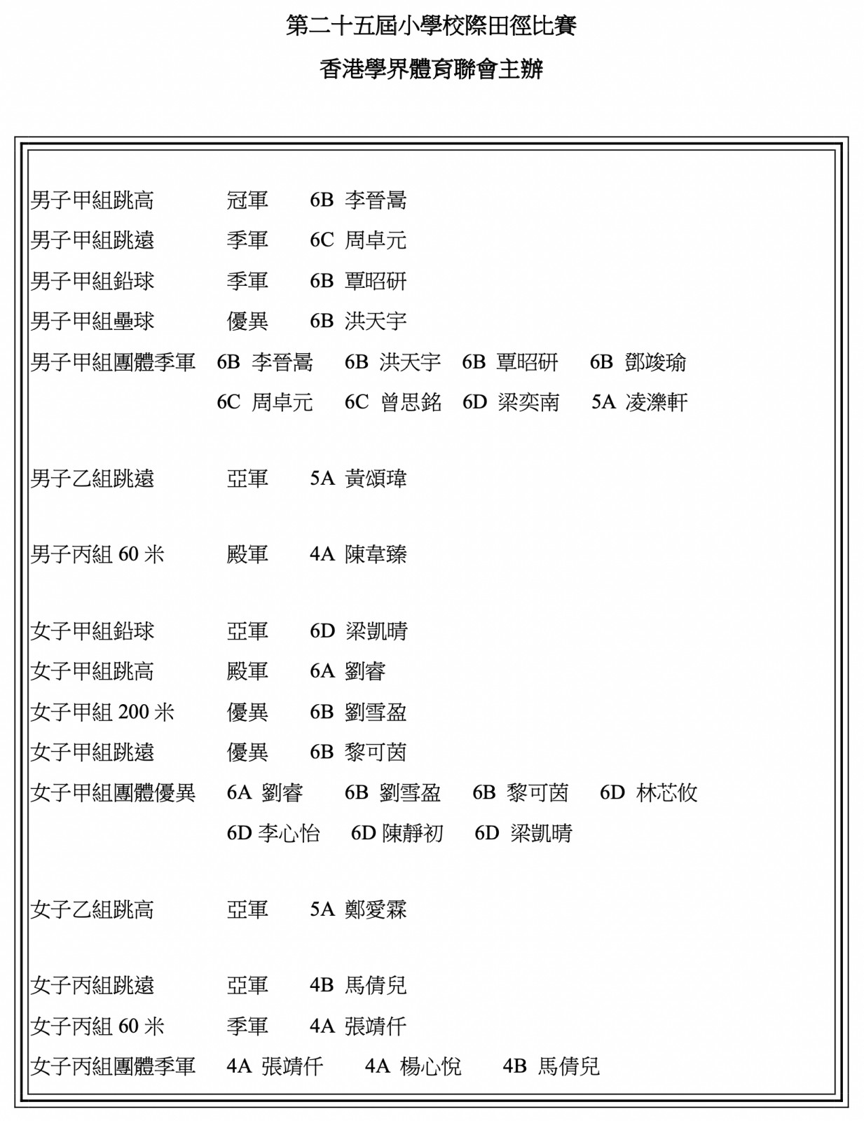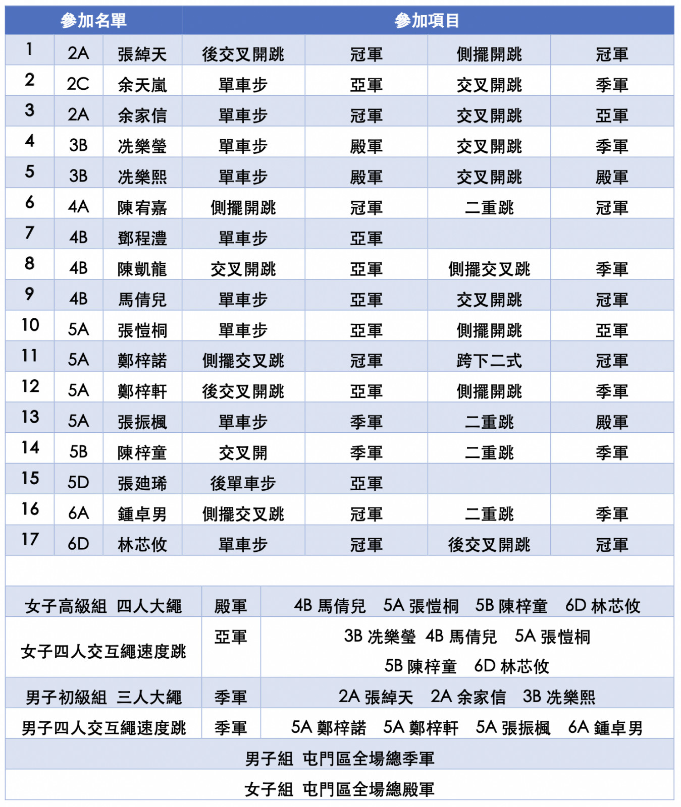 冠軍 3B 楊皓迦 6B 楊皓森 優異 2A 林銳翹 2B 潘煒皓 3A 胡梓謙