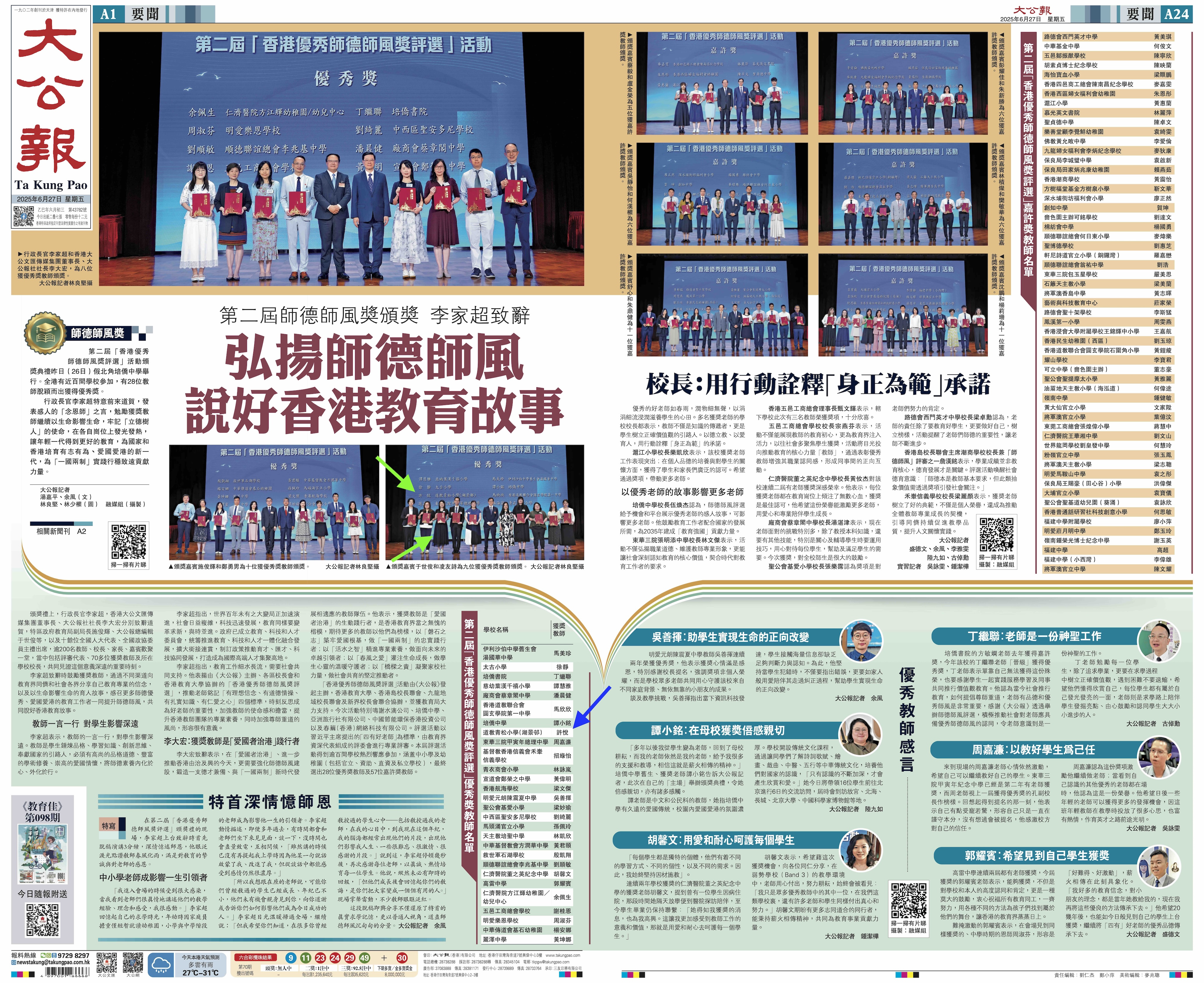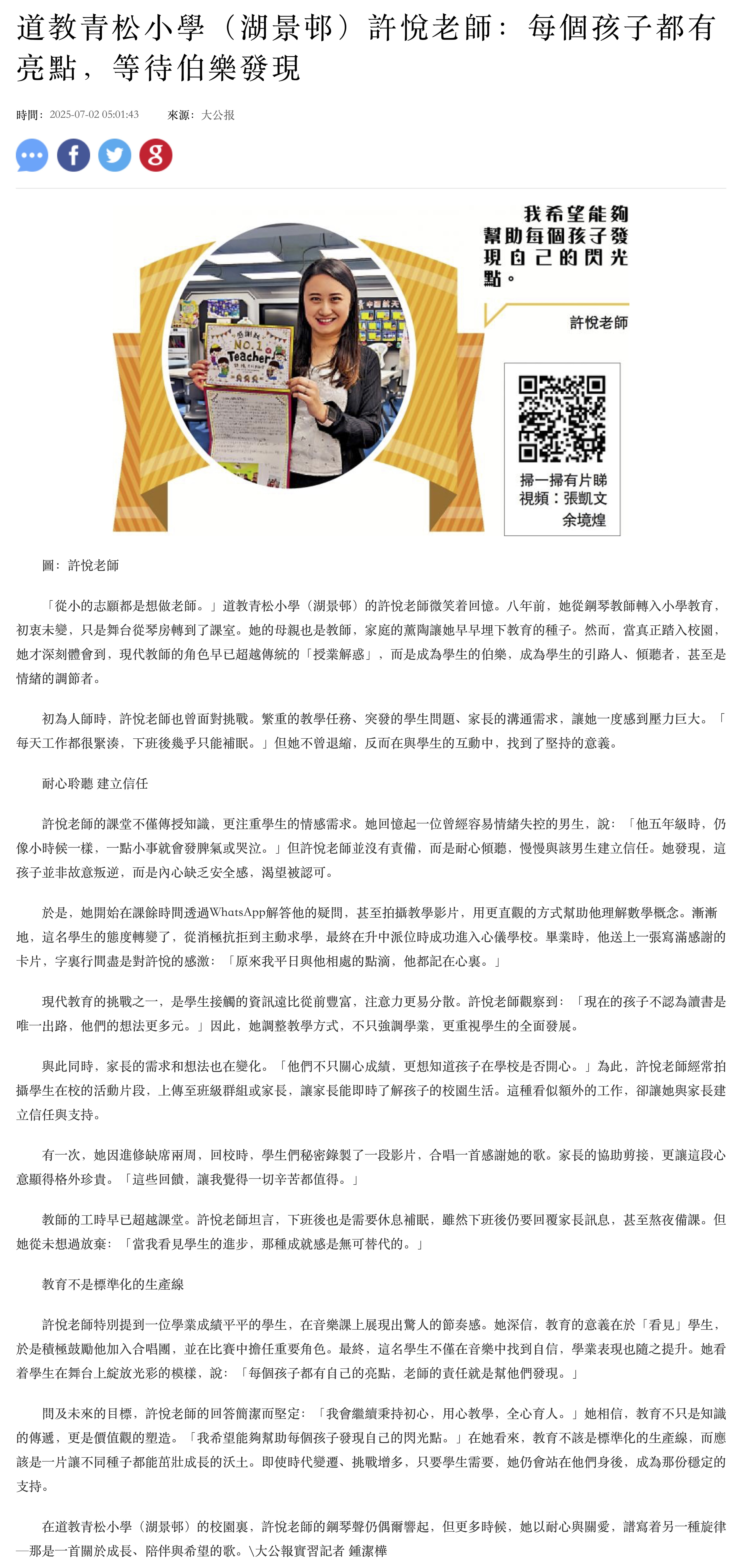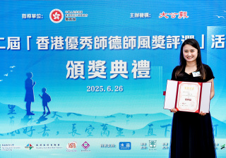 恭賀道教青松小學(湖景邨)的許悅老師榮獲由大公報主辦的第二屆「香港優秀師德師風獎評選」優秀獎!