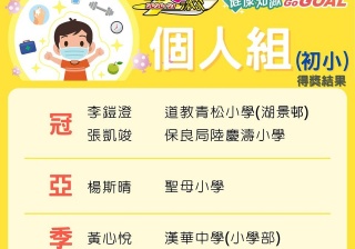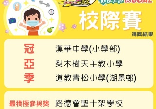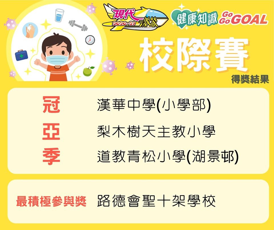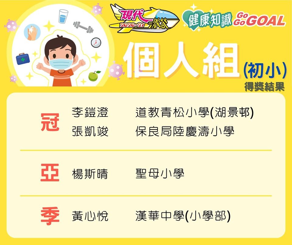 由現代教育及香港小童群益會主辨<<現代激答2020-21 健康知識Go Go GOAL>>小學校際比賽中,獲得全港小學組季軍。而3C 李鎧澄同學更獲得全港個人(初小)組冠軍!各同學繼續努力自主學習,爭取佳積!