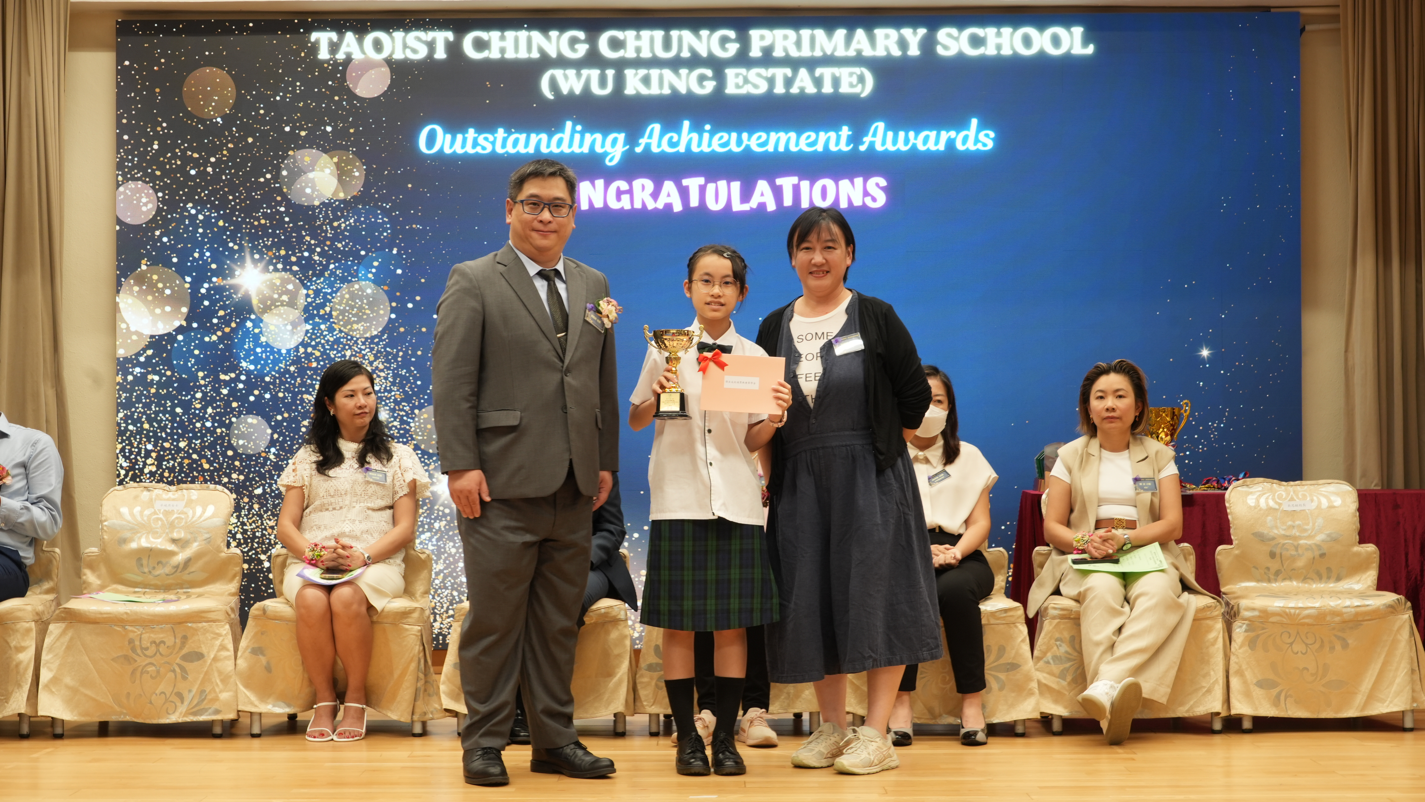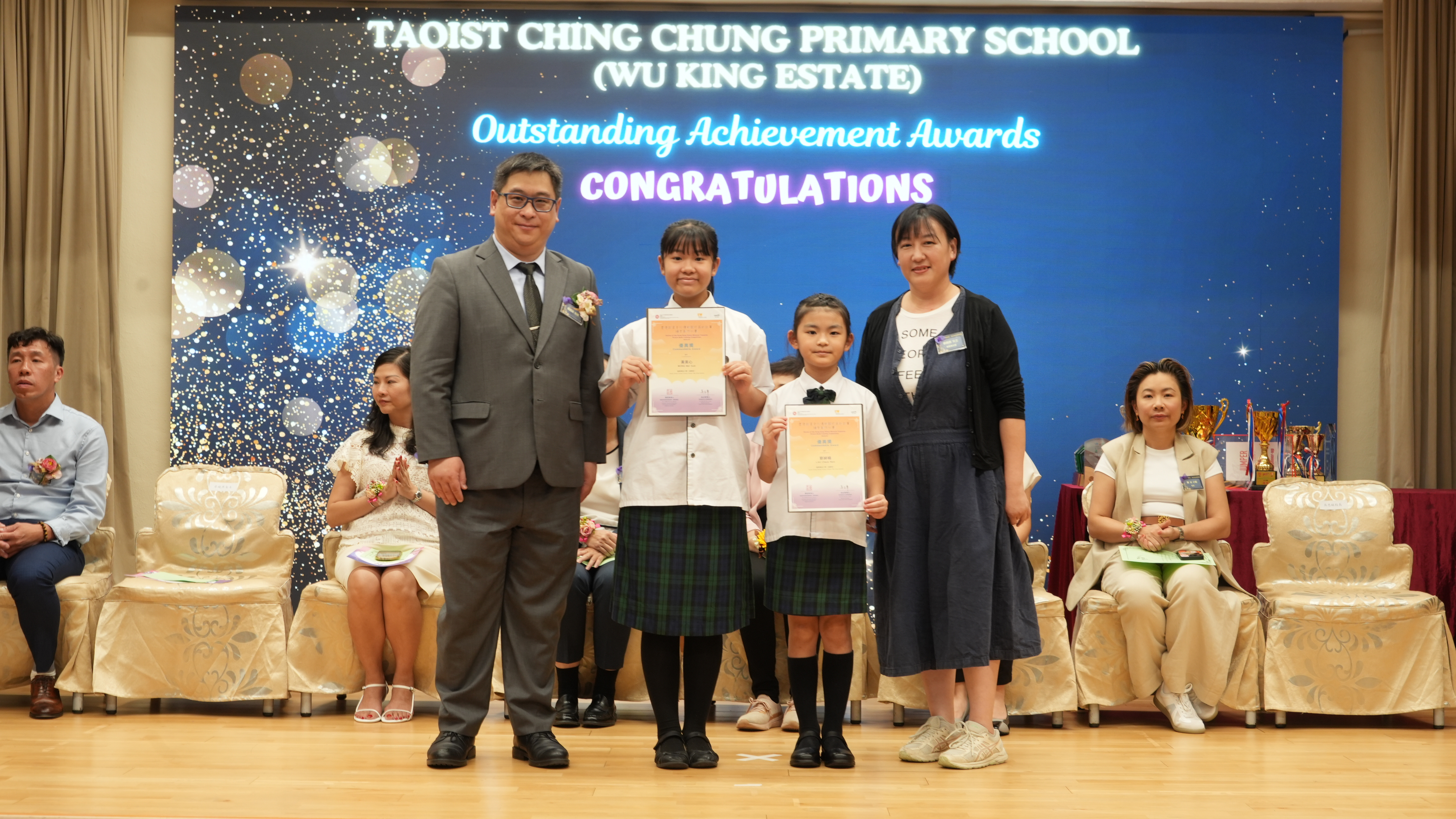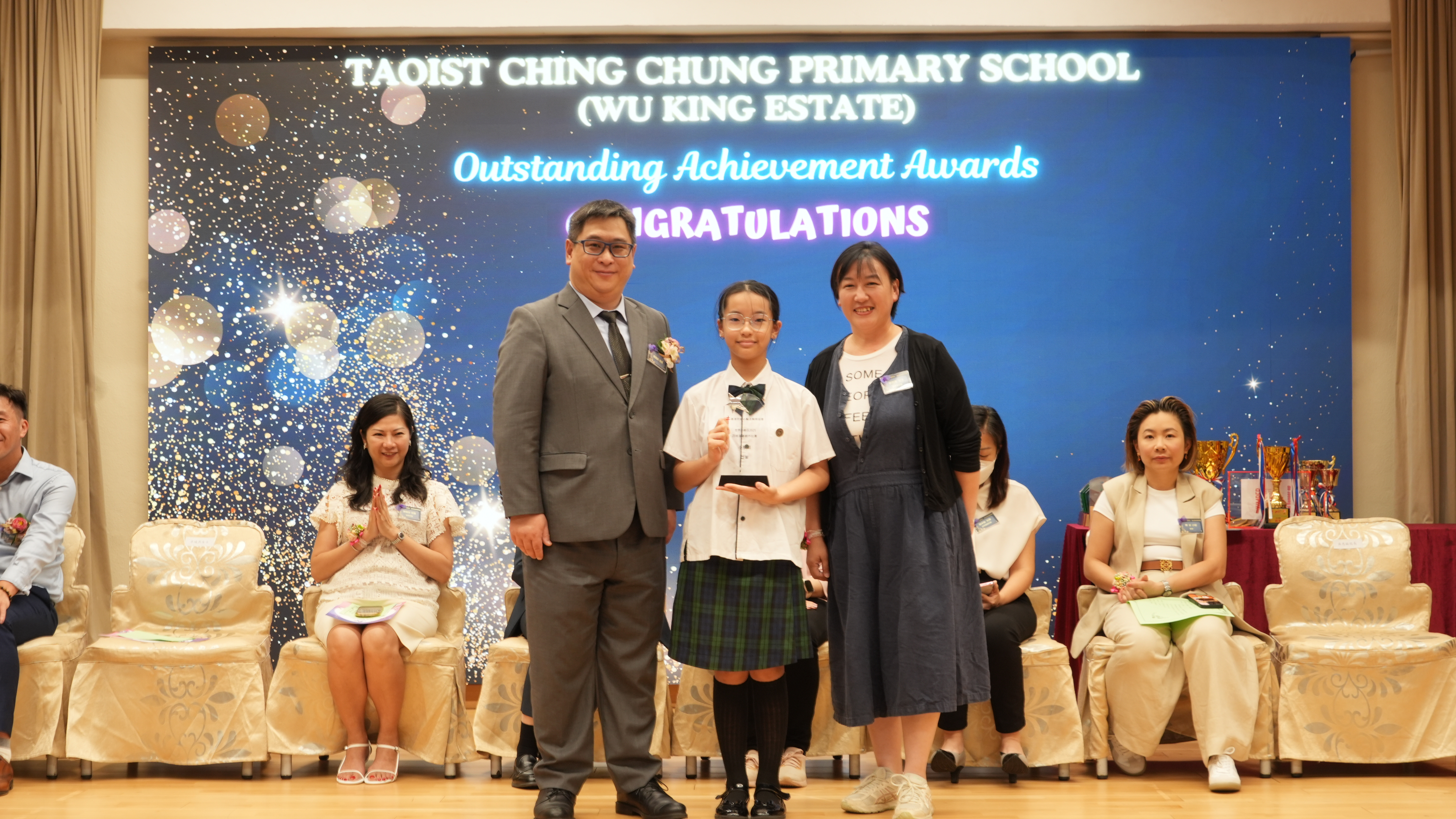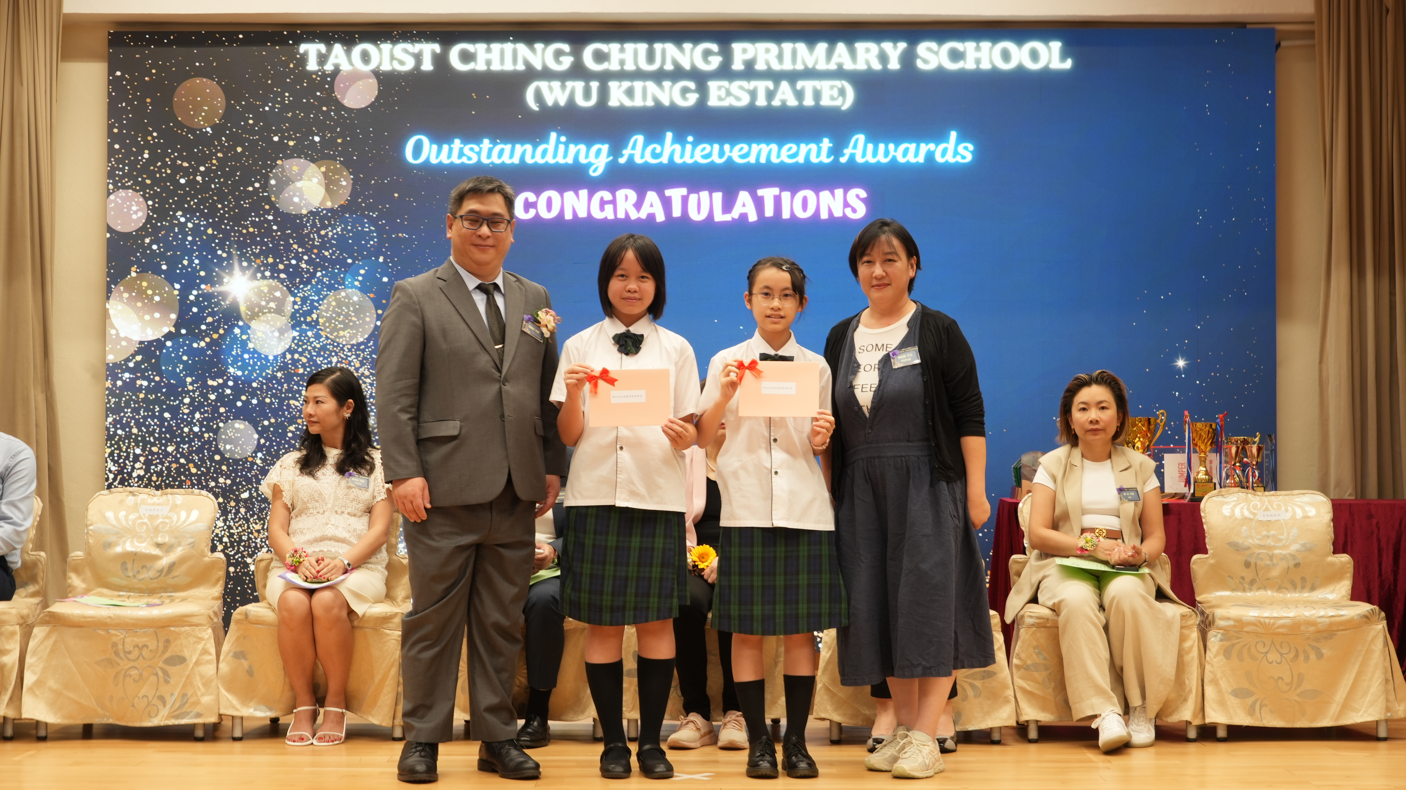 本年度傑出成就頒獎典禮,由校監趙淑儀女士、辦學團體校董趙卓敏女士、辦學團體校董方嘉琪女士、家長校董陳栩淨女士、校友校董凌紹球先生、家教會主席承曉燕女士、校友韓冰女士為頒獎嘉賓。是次典禮頒獎項目高達一百多項,再次祝賀獲獎的同學和家長,期望同學繼續努力,超越自我,再創高峰!