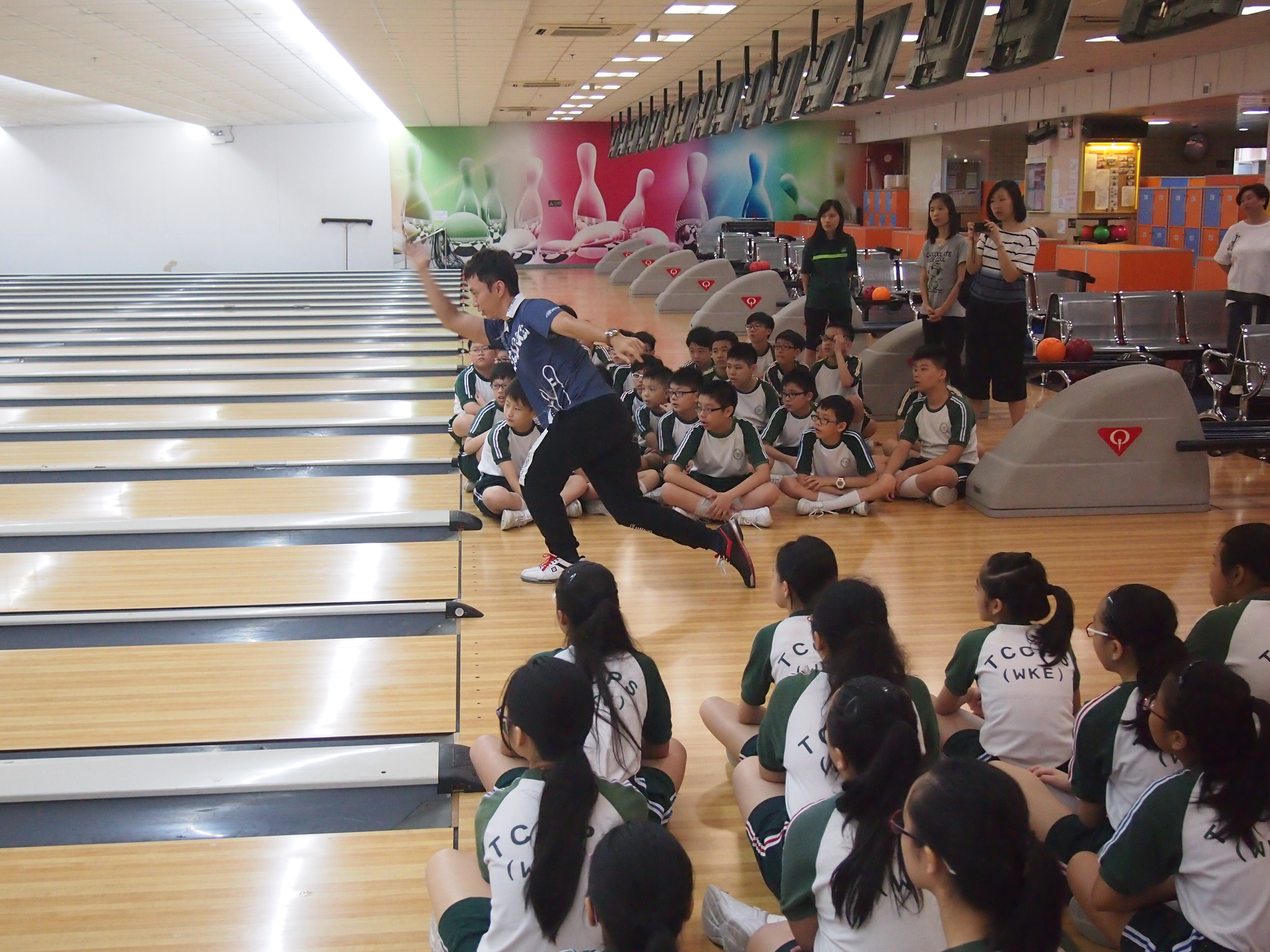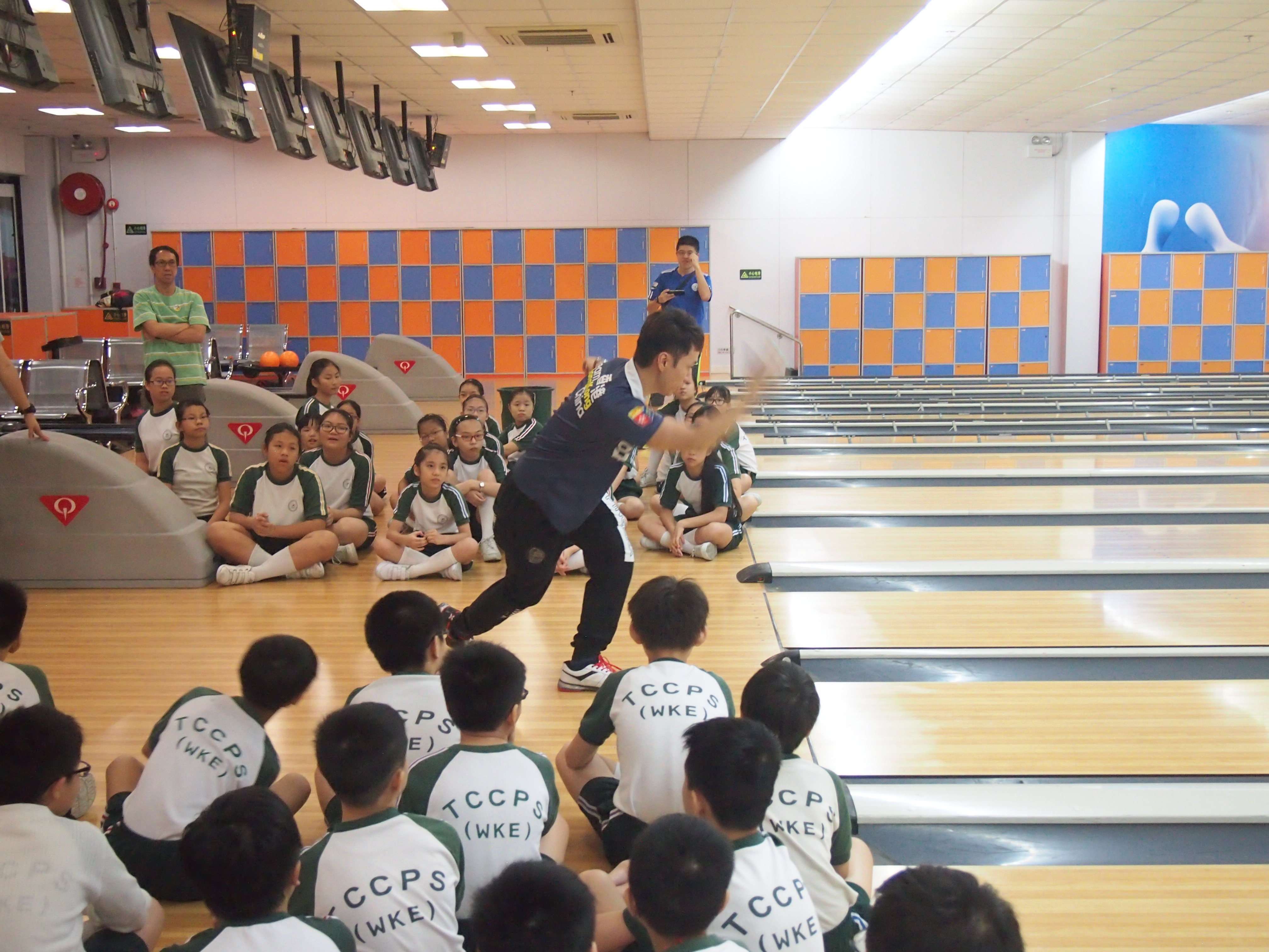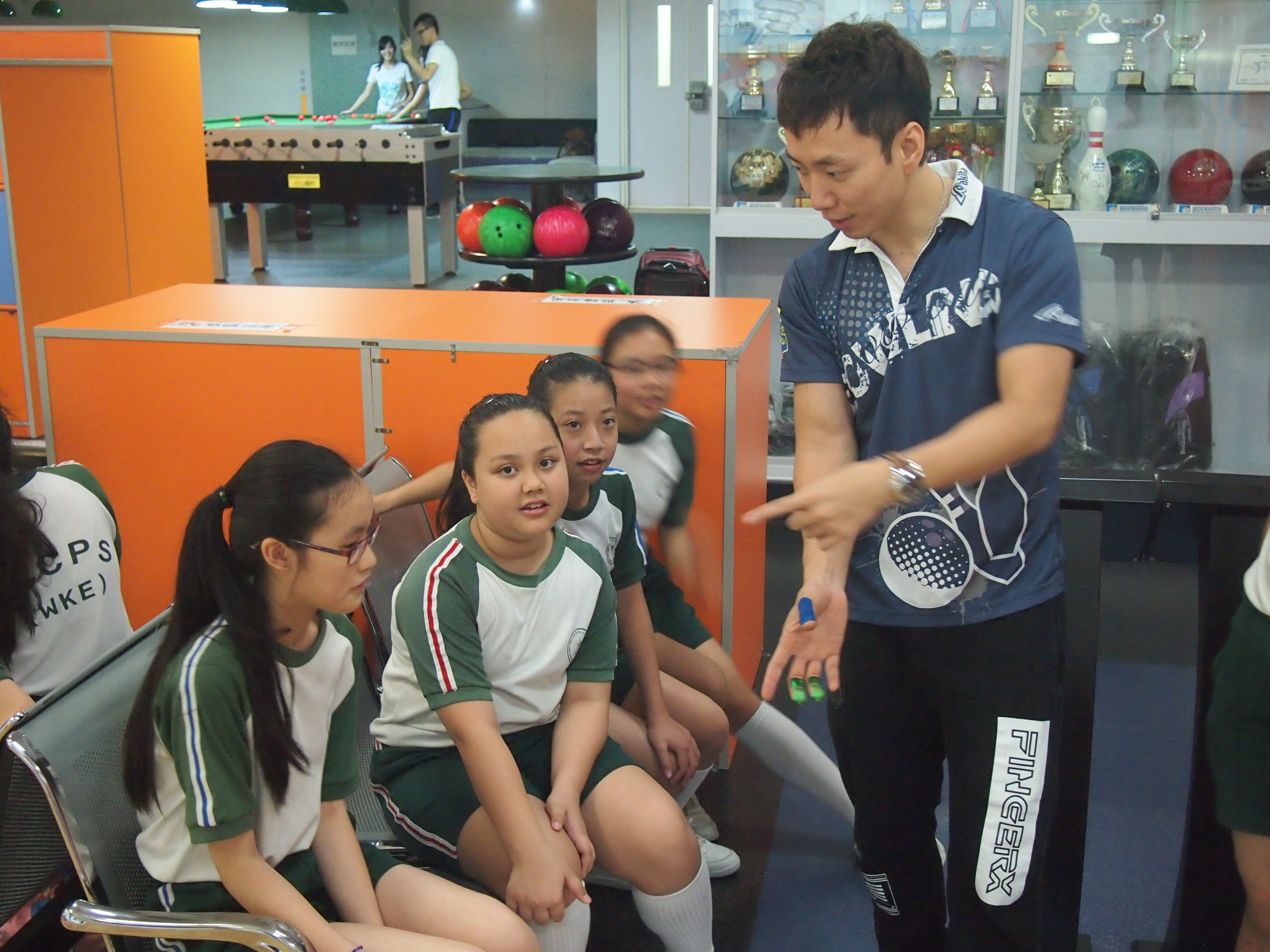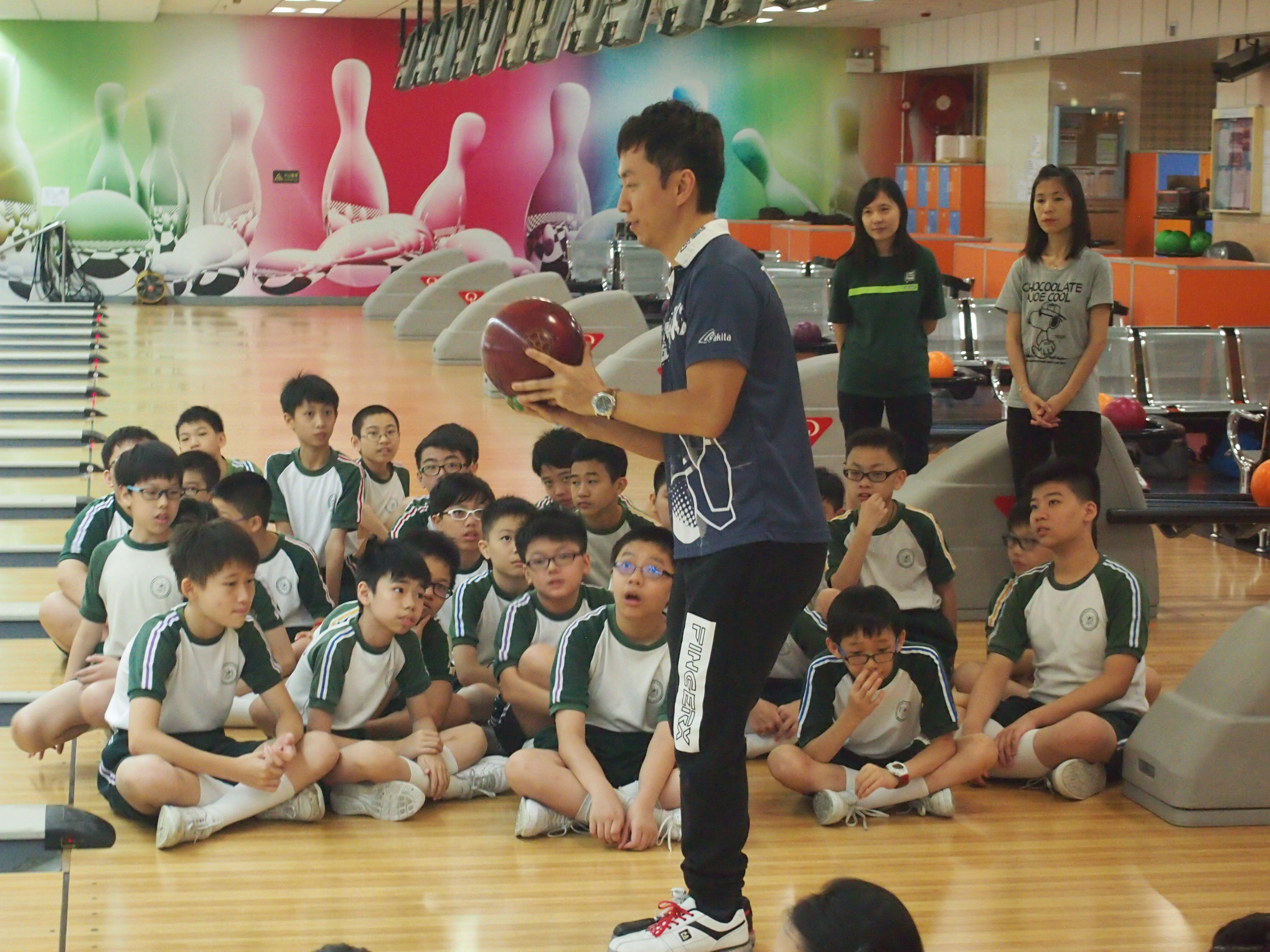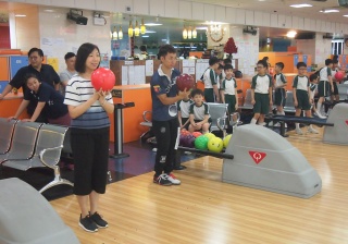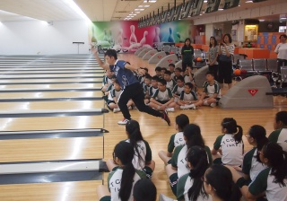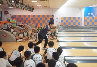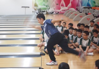 胡兆康先生向學生示範保齡球基本技巧;