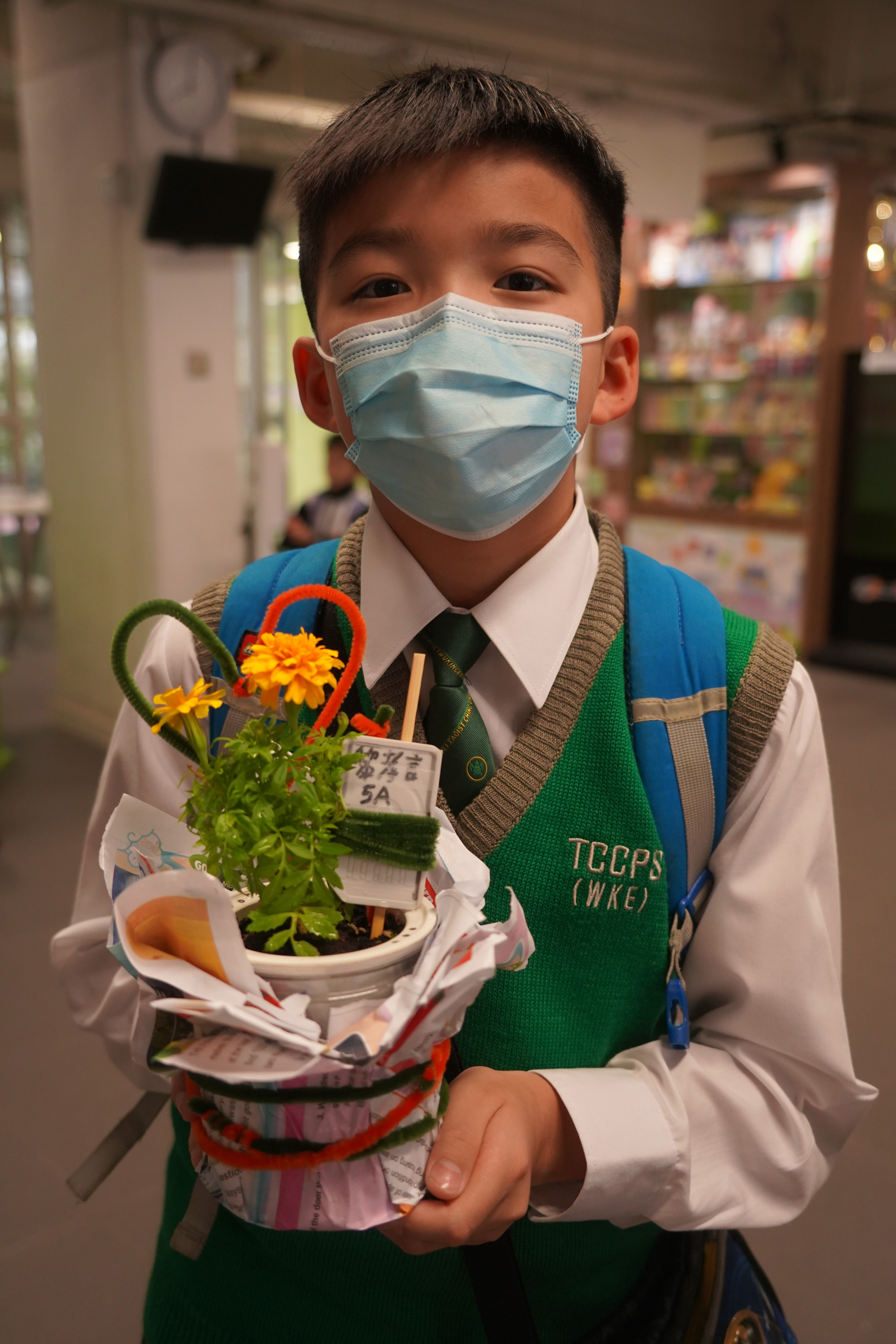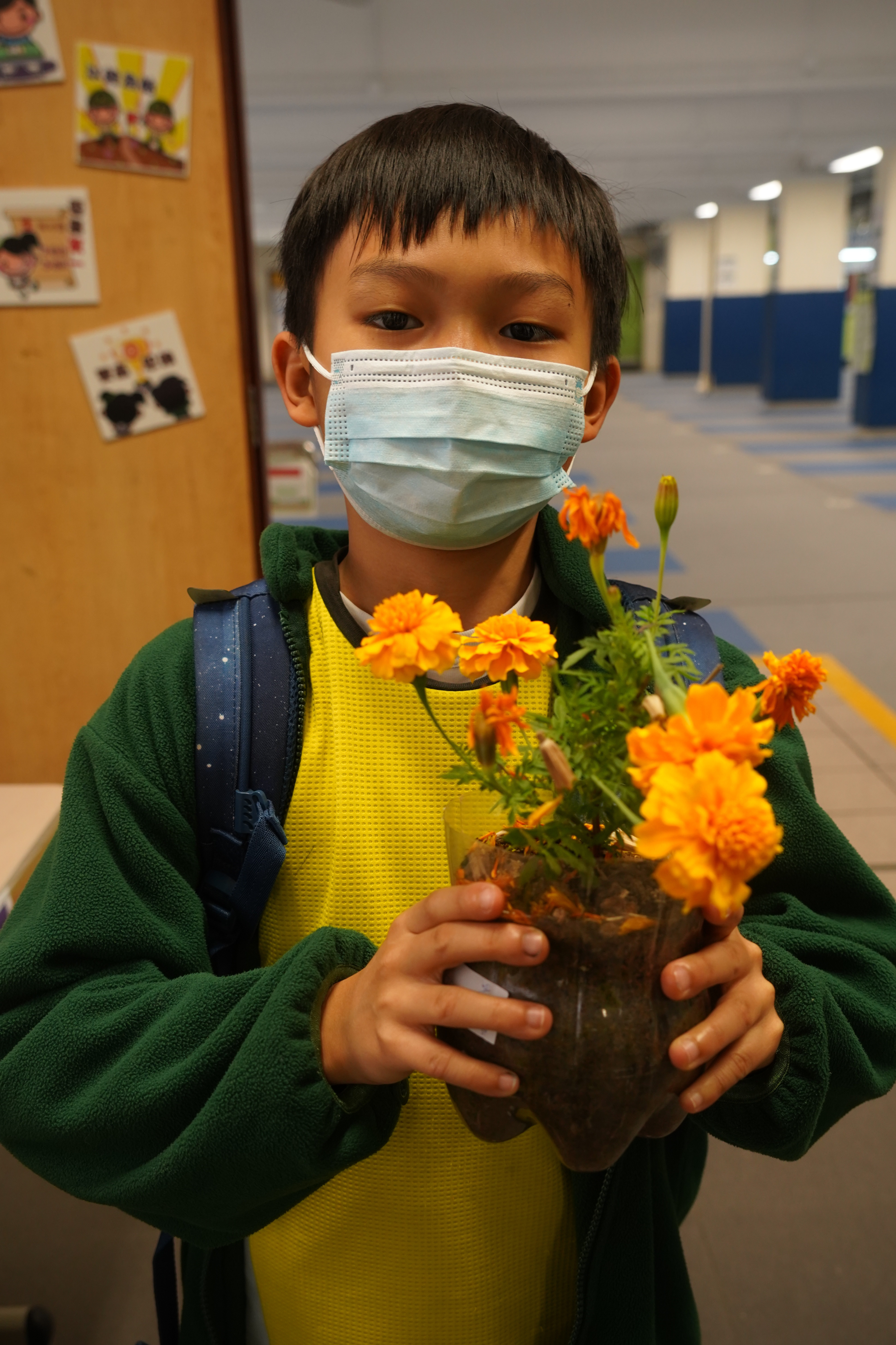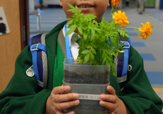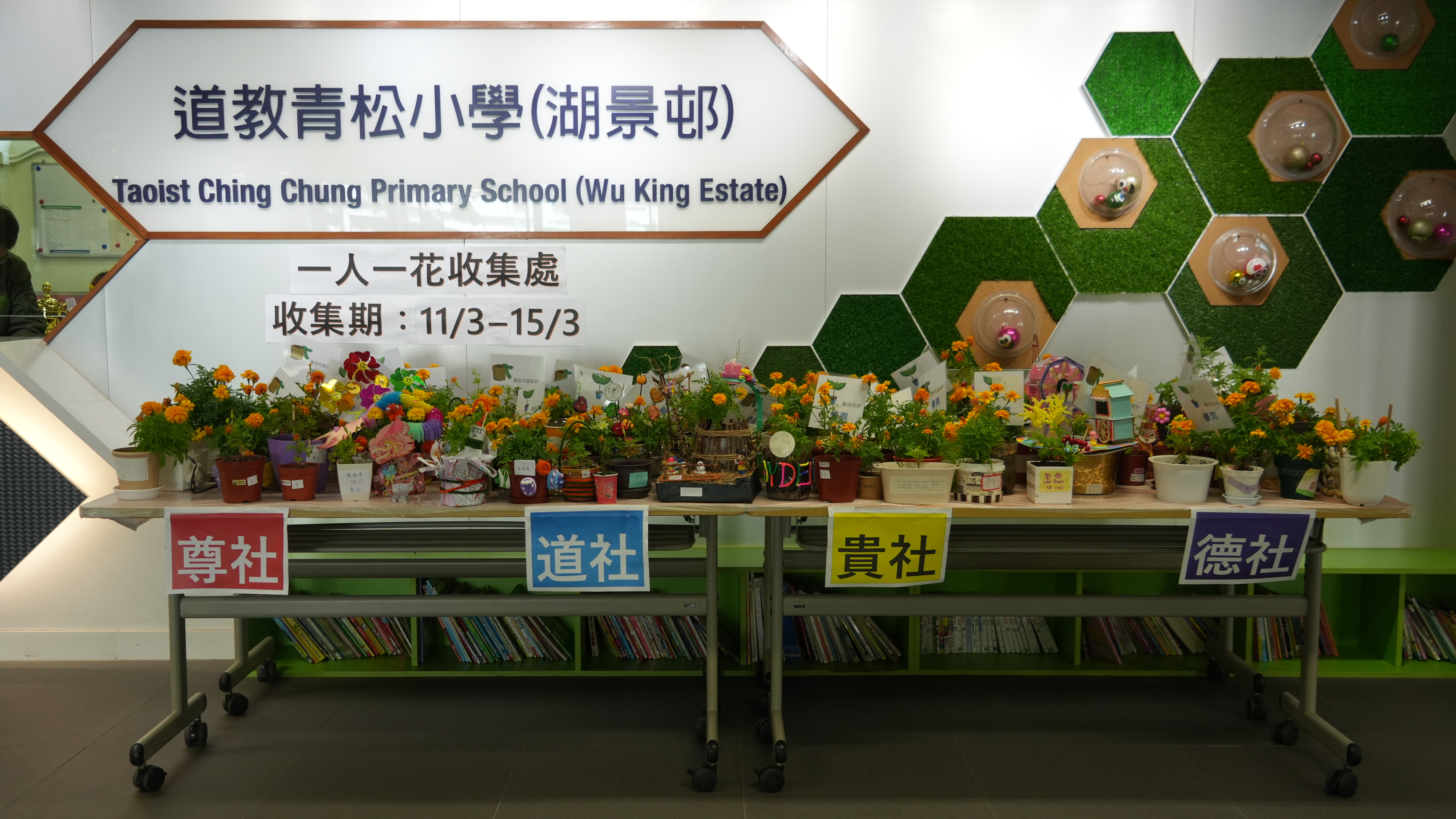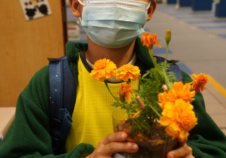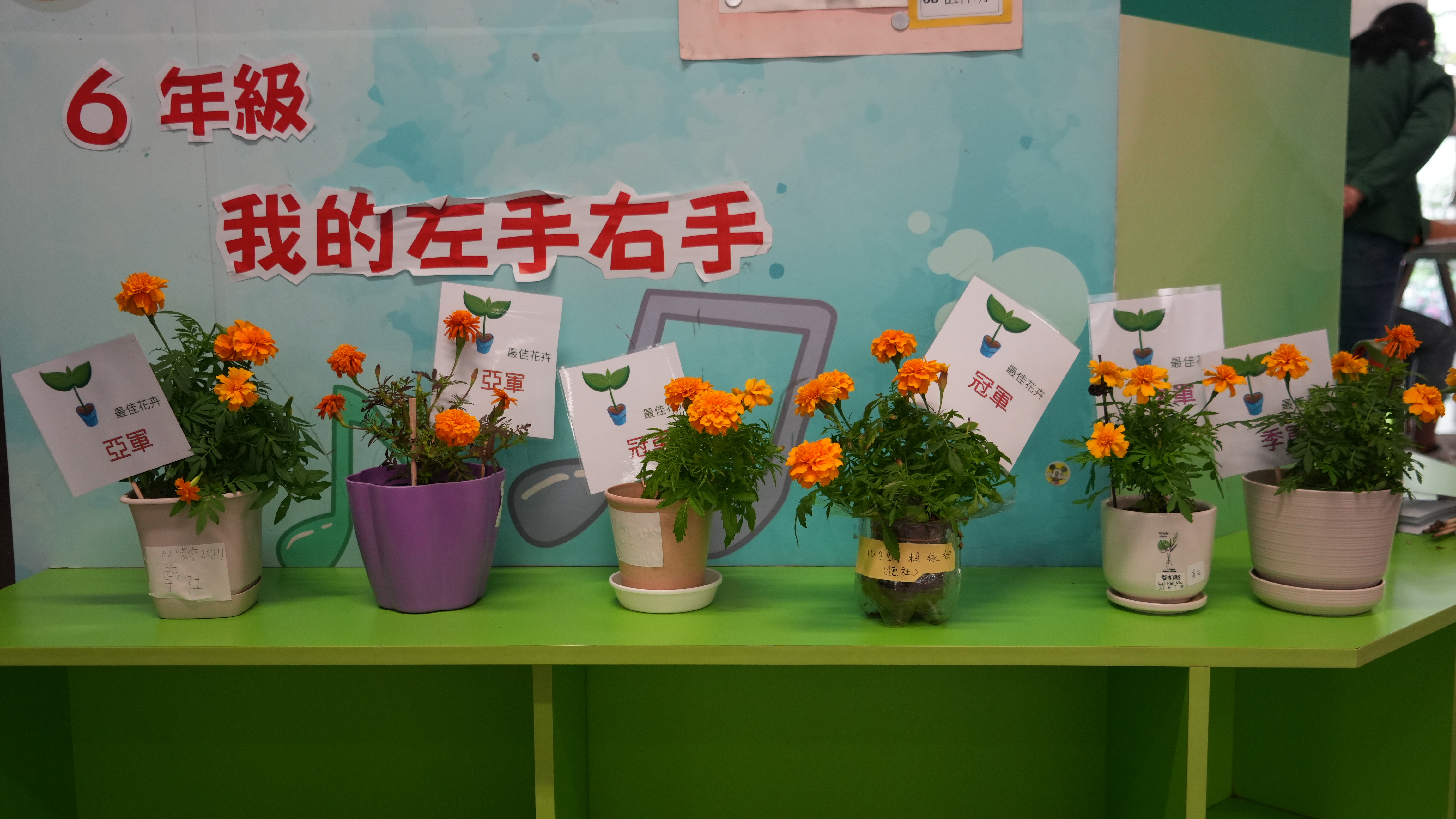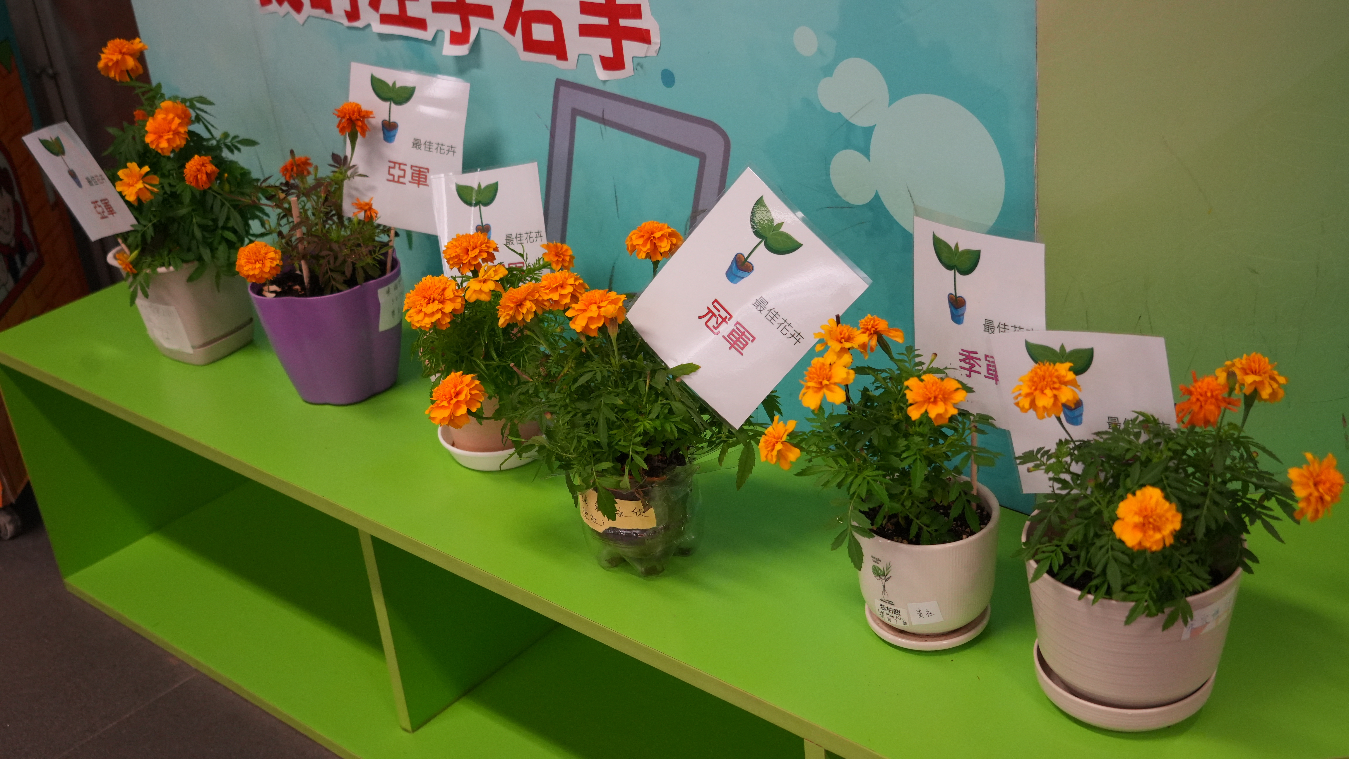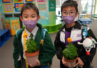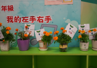 本年度一人一花萬壽菊種植比賽已順利完成,學校一共收到接近200盆盆栽, 交回來的萬壽菊千姿百態,可見同學花了不少心思悉心栽種;另外同學亦發揮創意,利用不同容器設計環保花盆,別具特色。