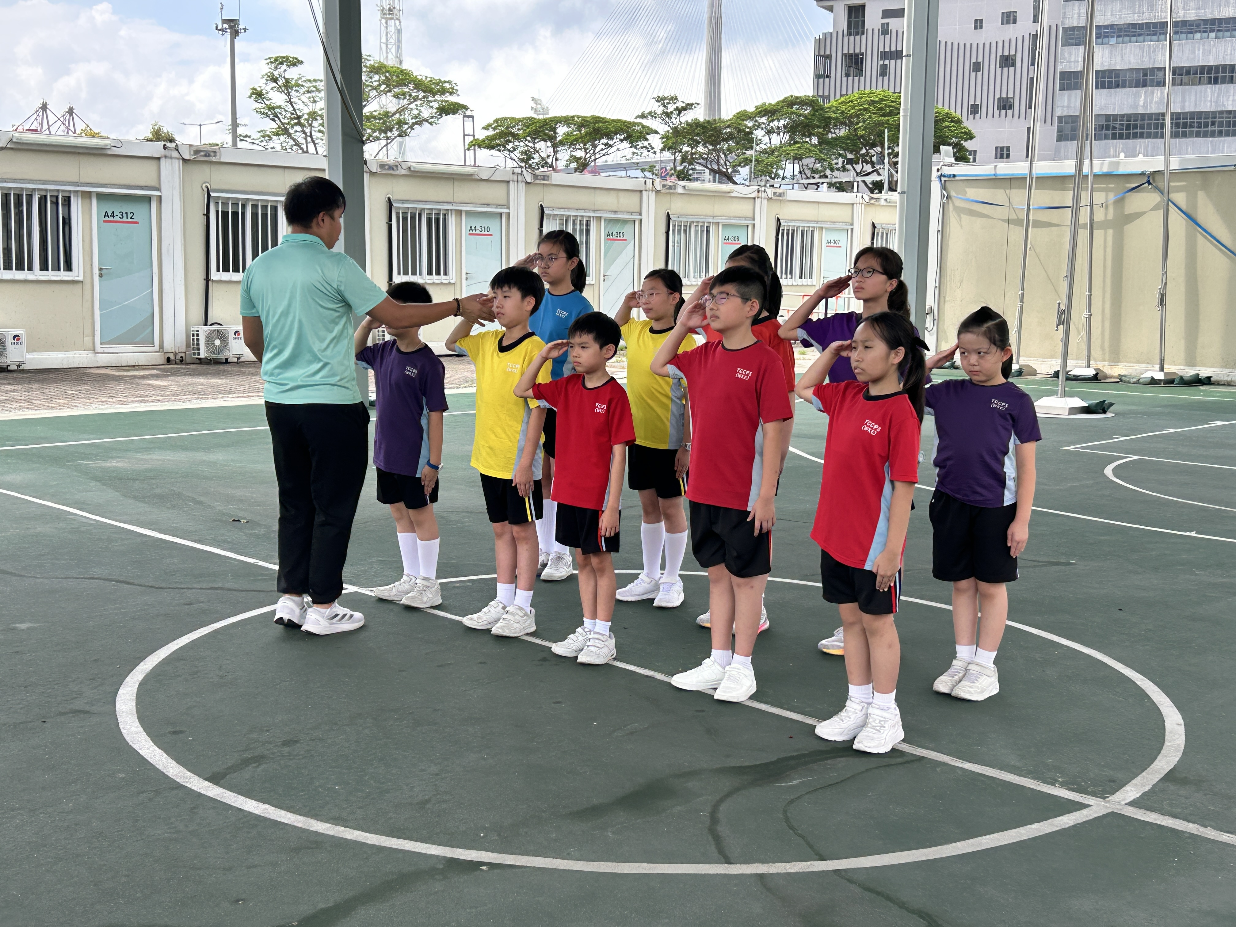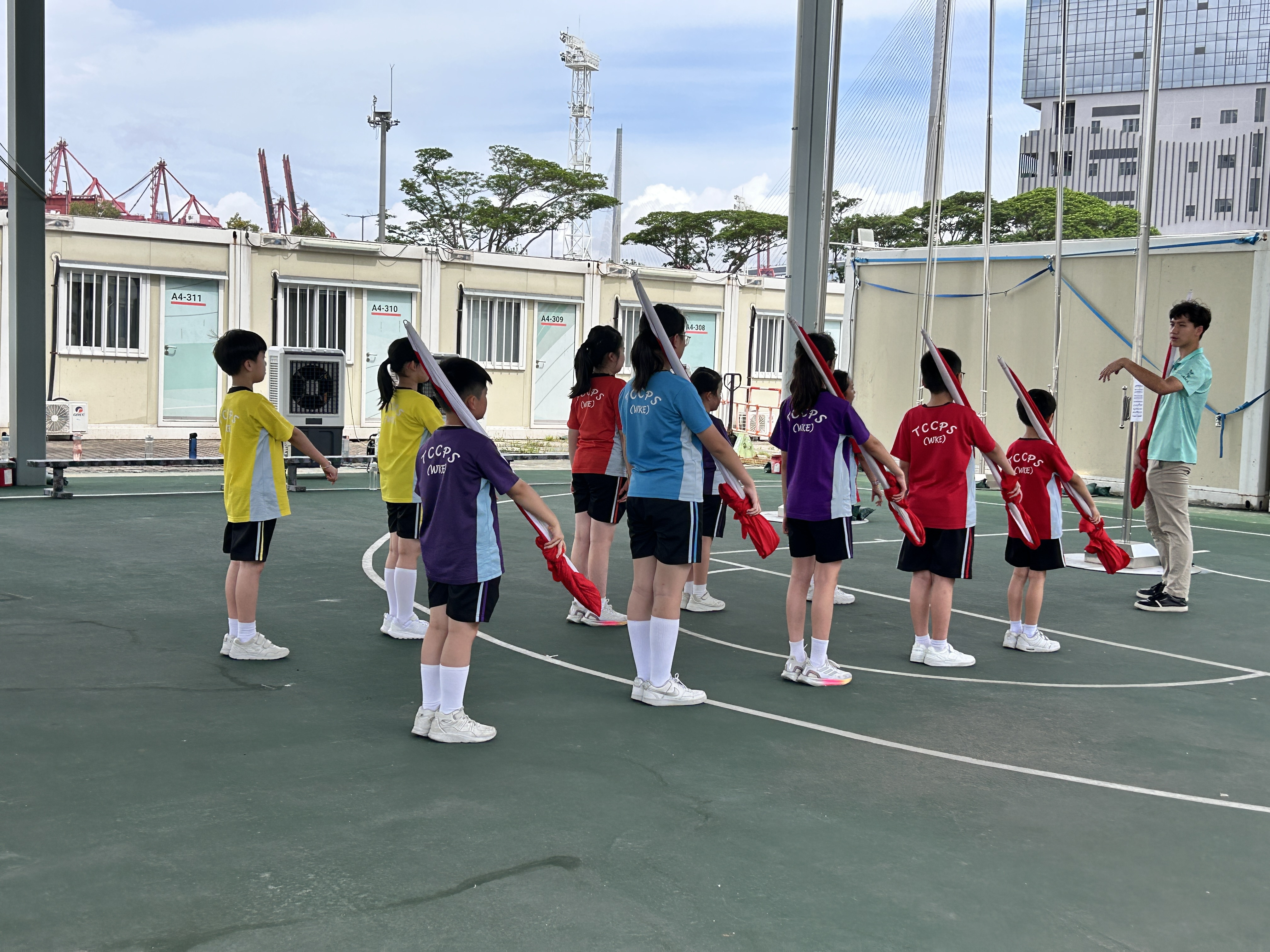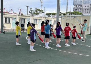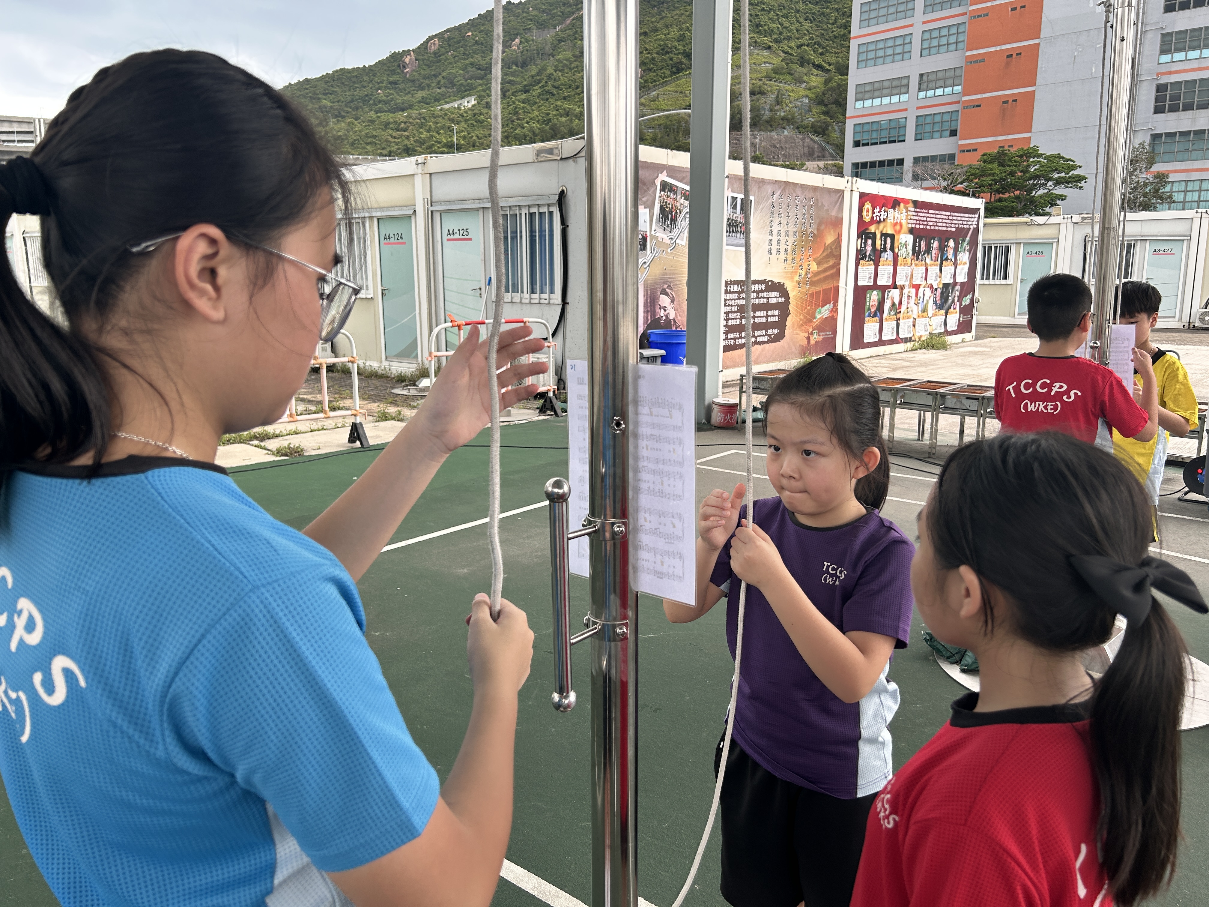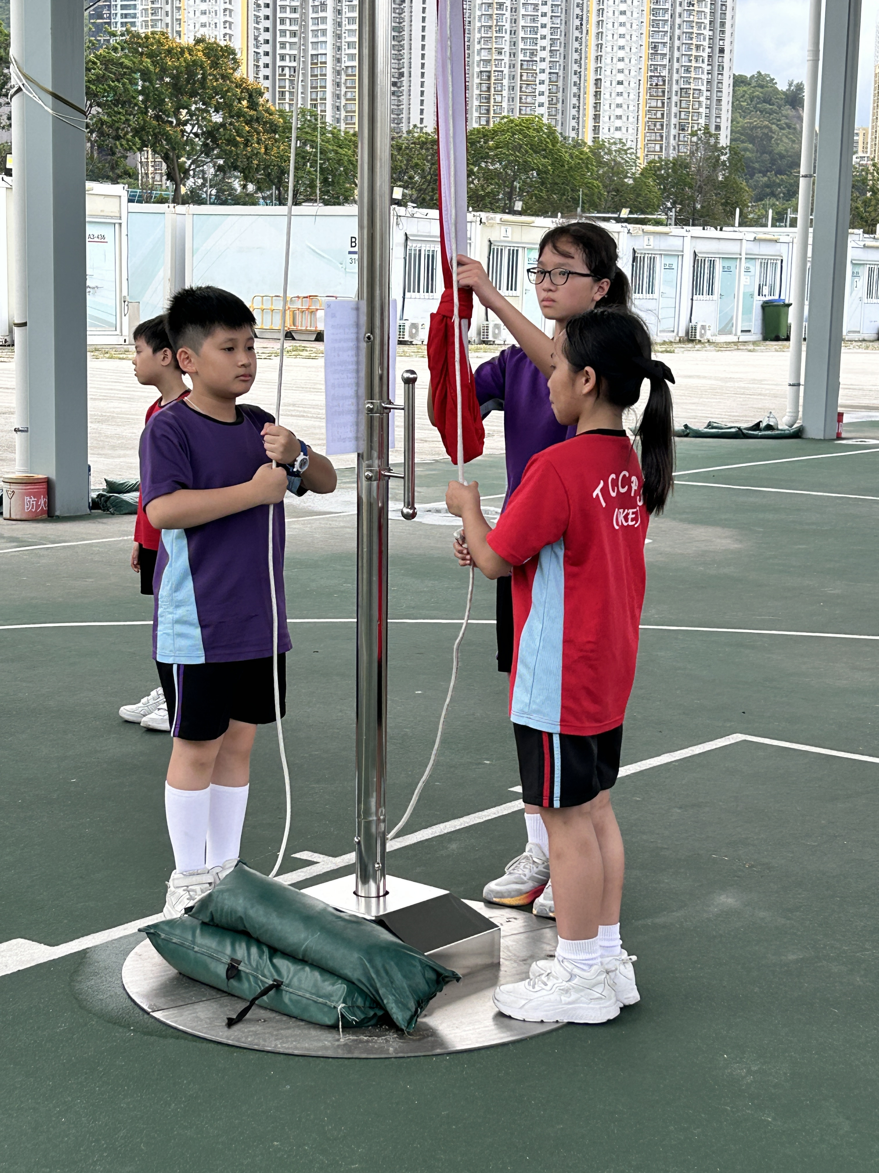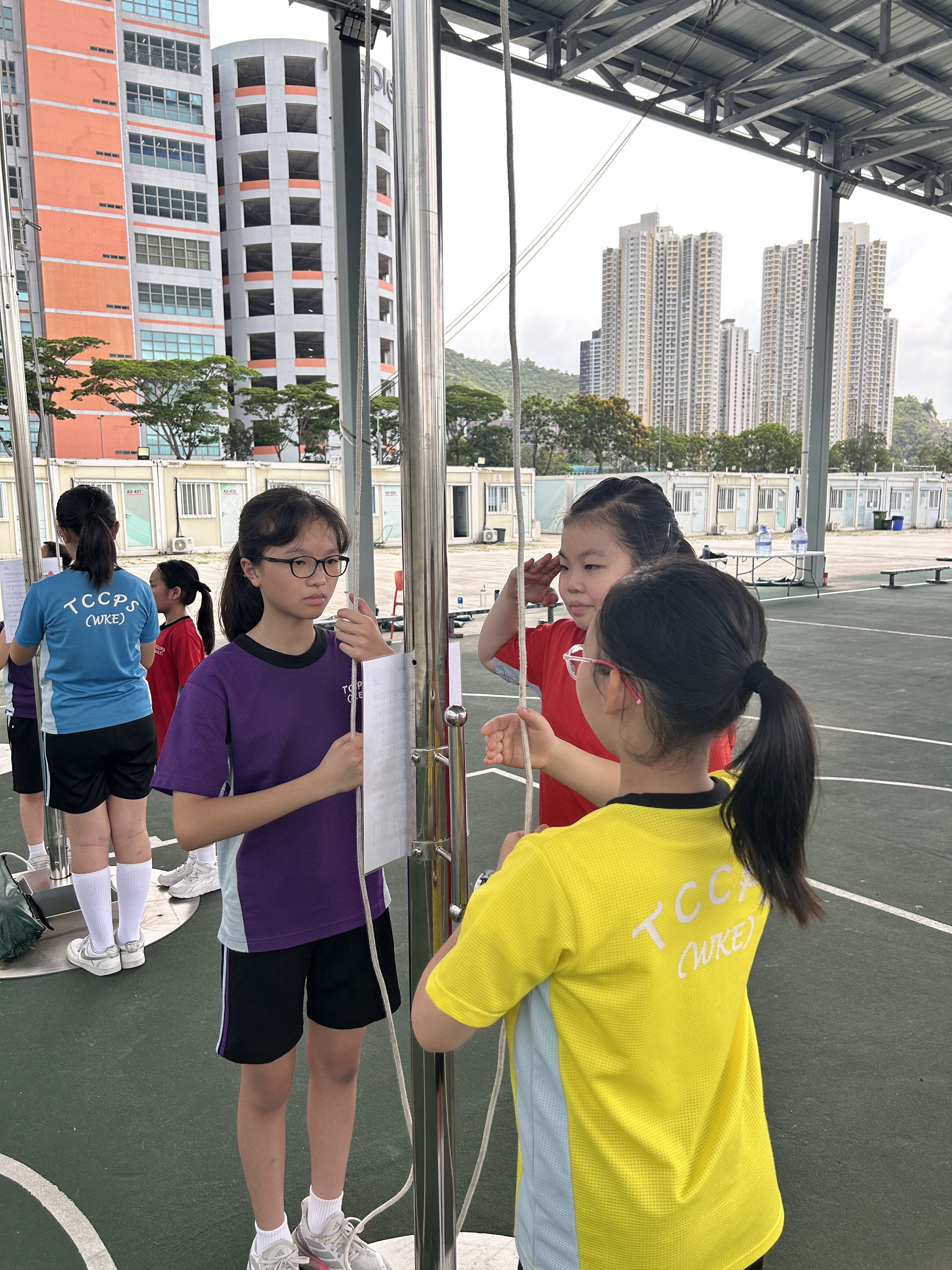 升旗隊隊員於7月15日,參加由香港青少年軍總會舉辨的「青年發展及國民教育基地夏令營」,學習升旗及隊列步操動作。