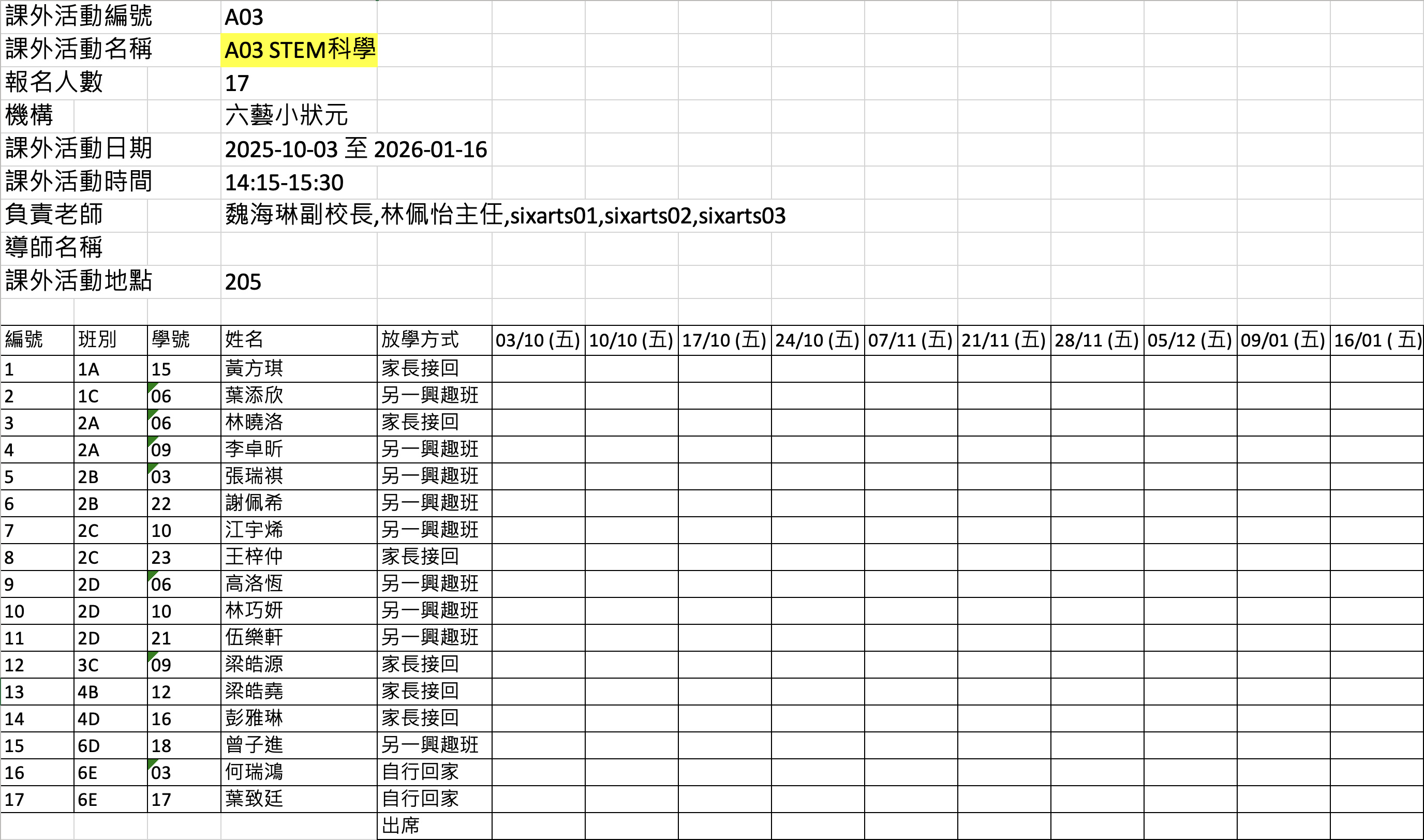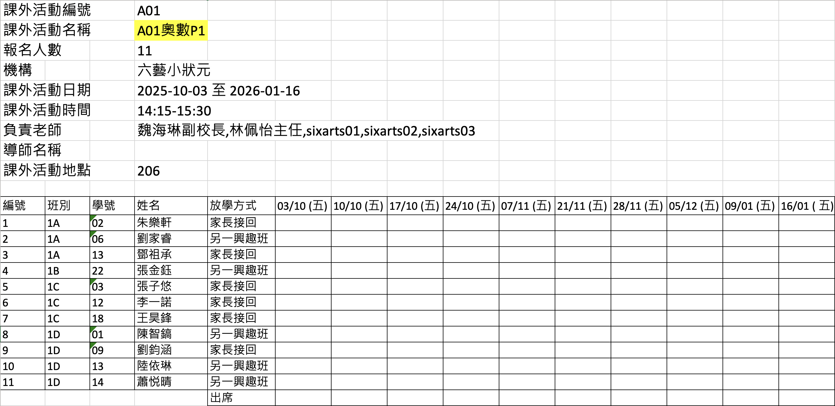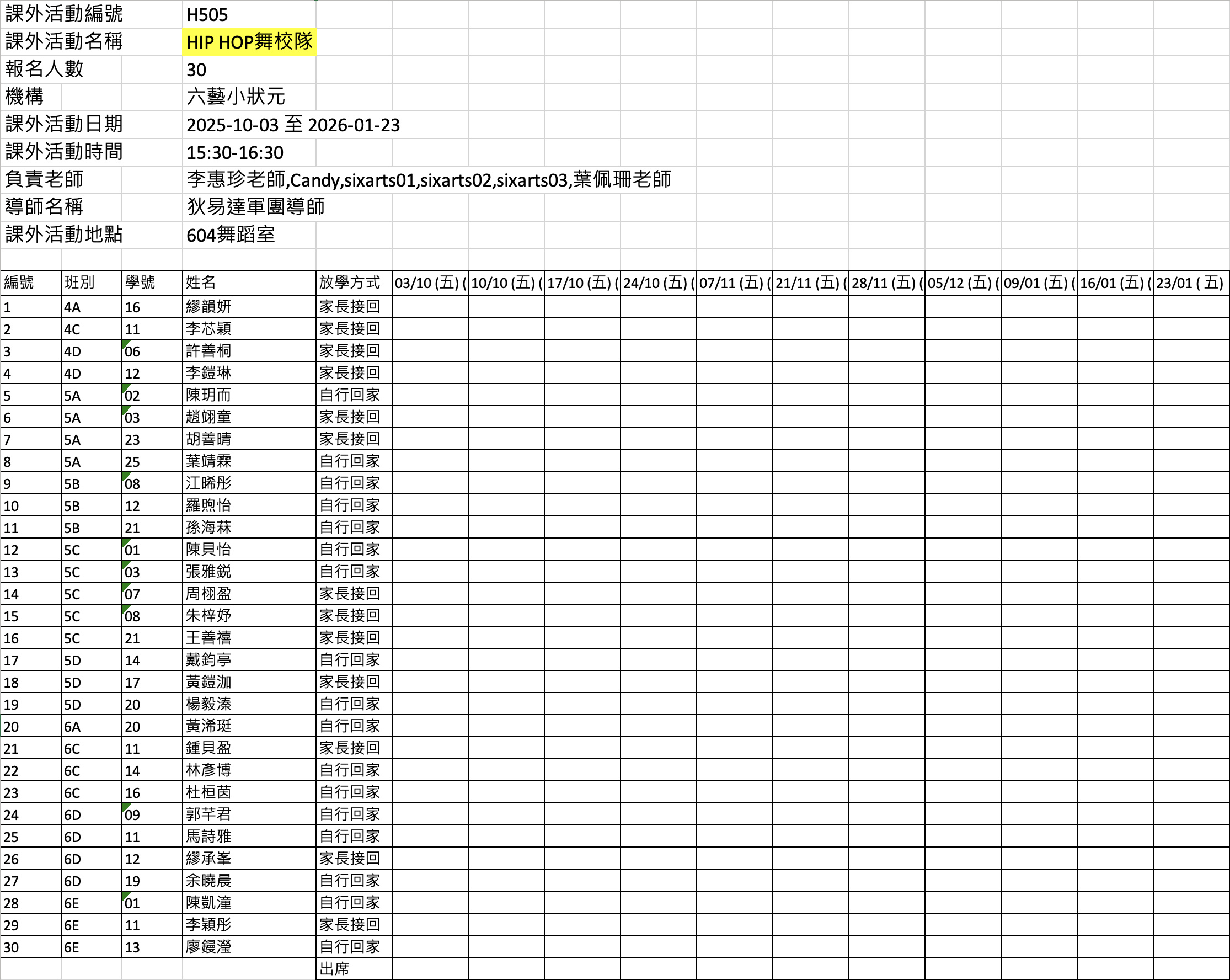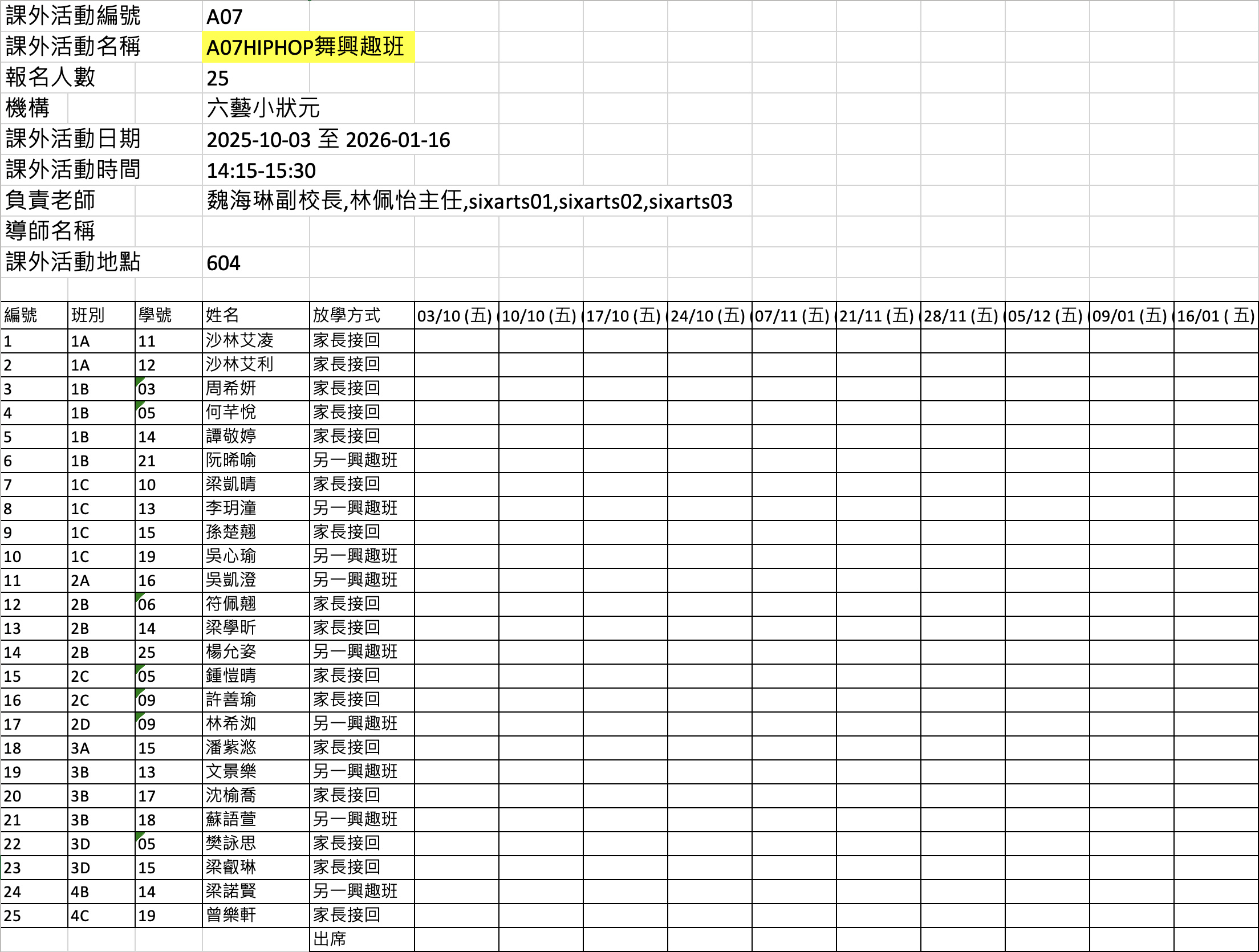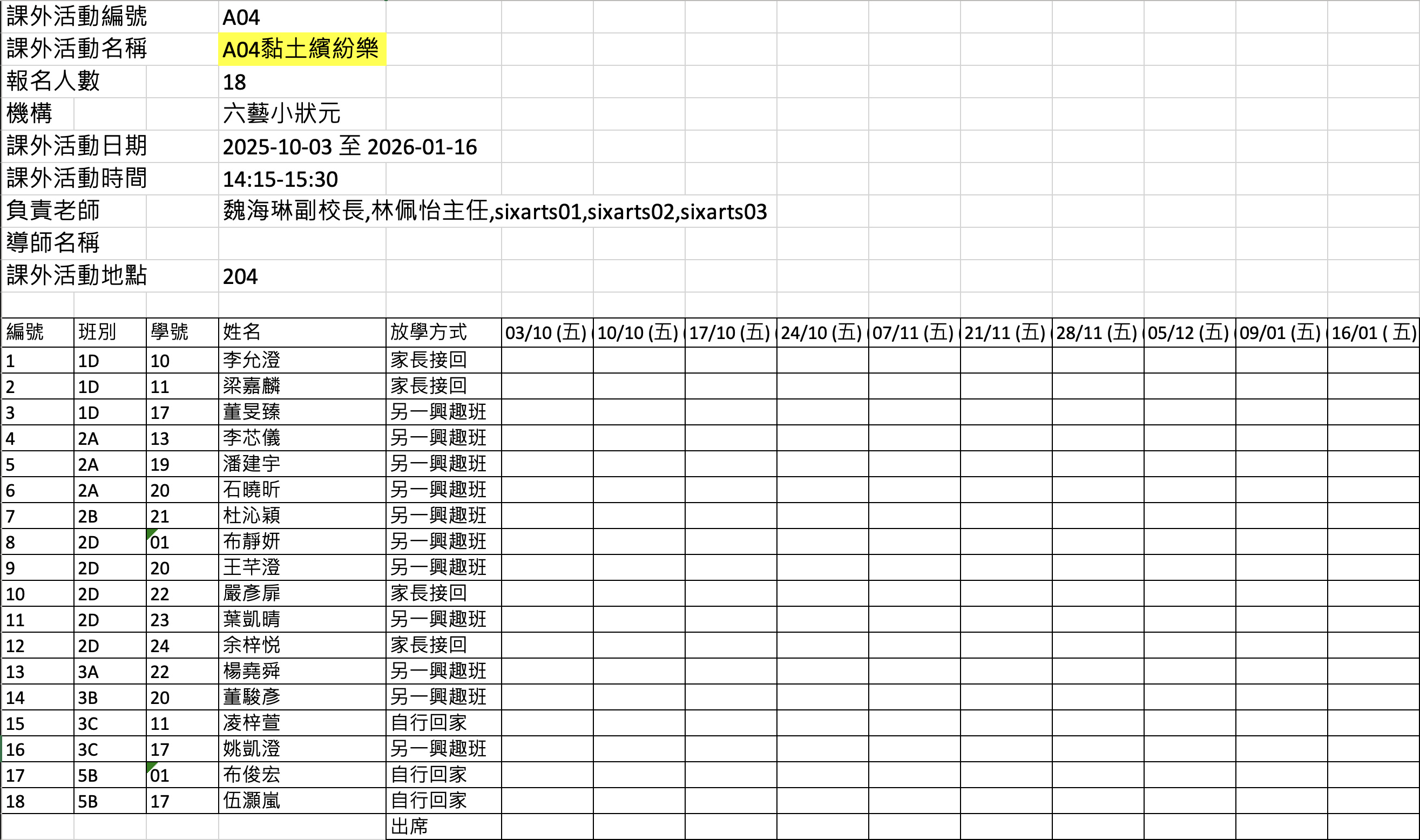 2526上學期周五興趣班名單