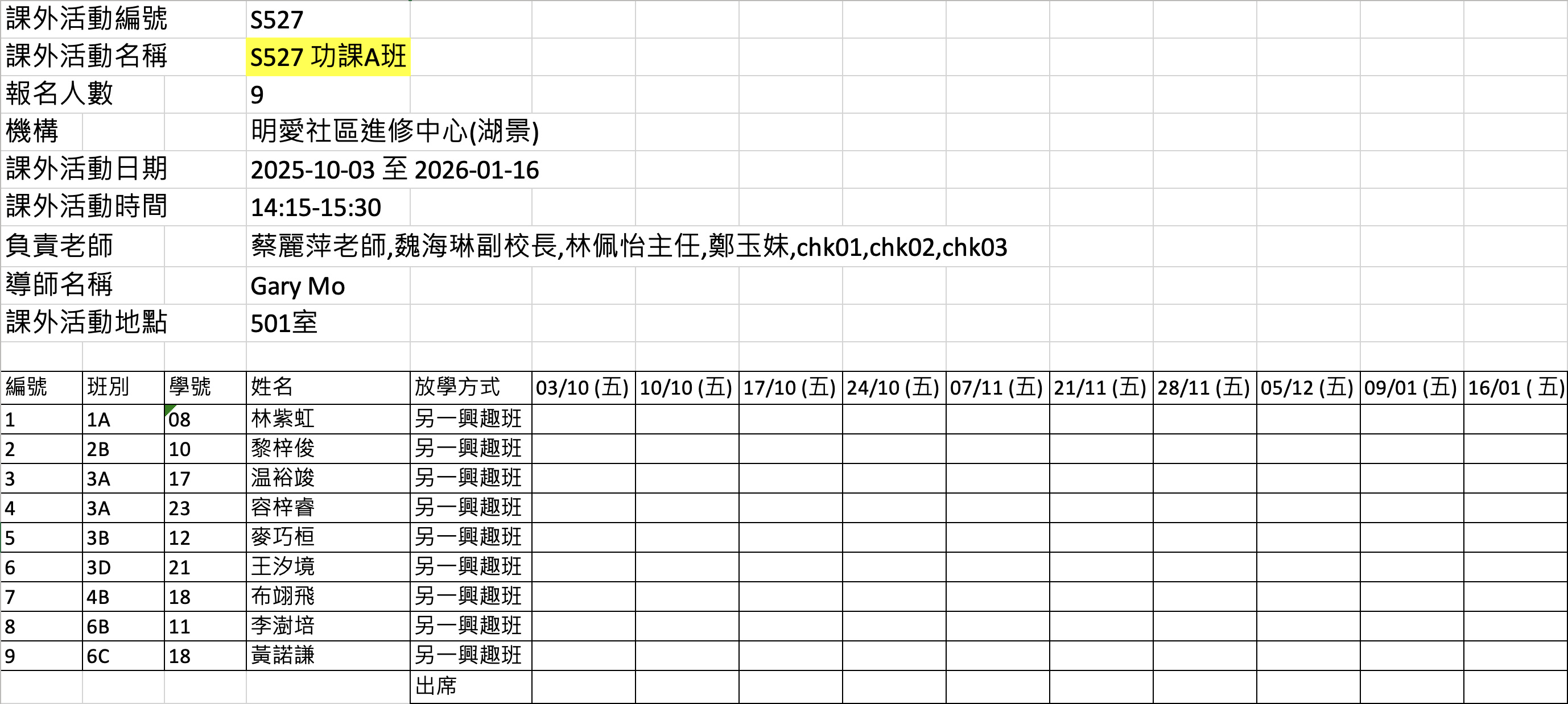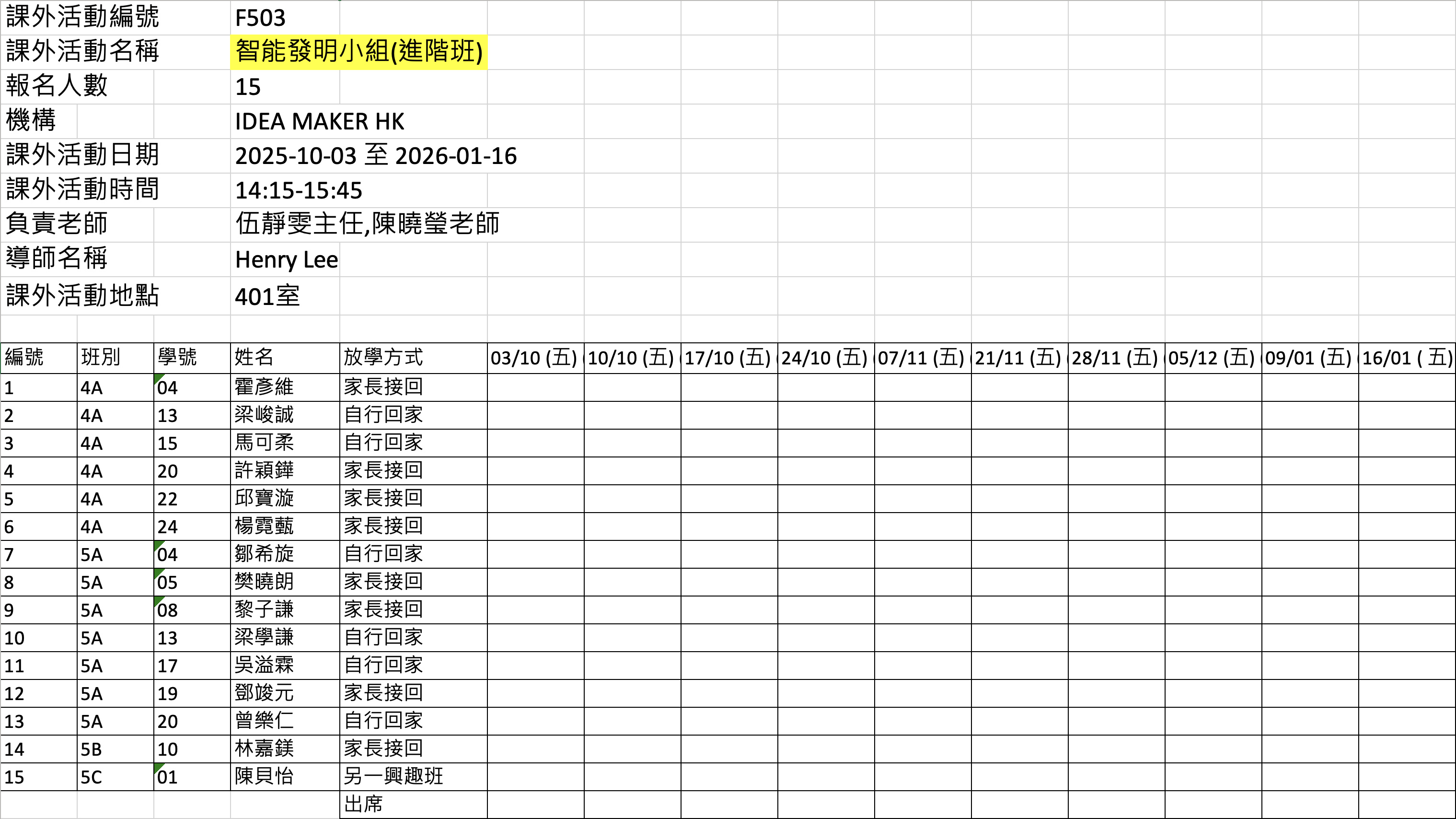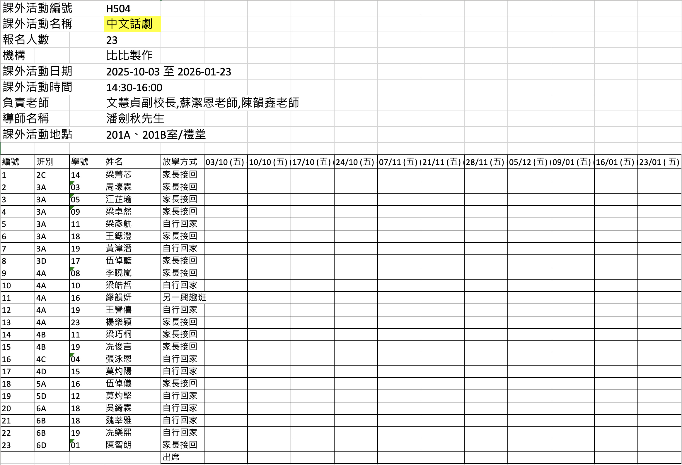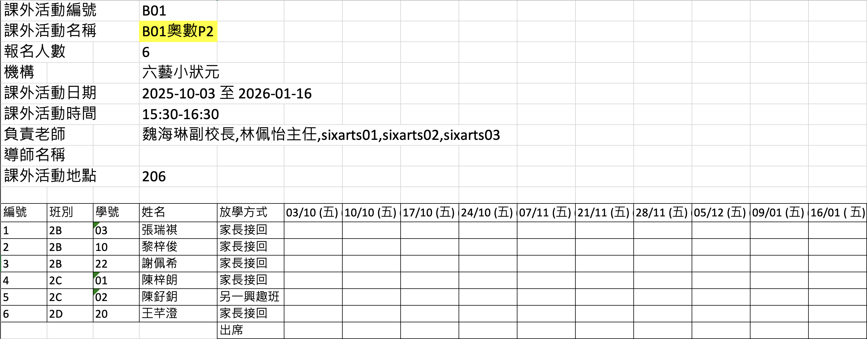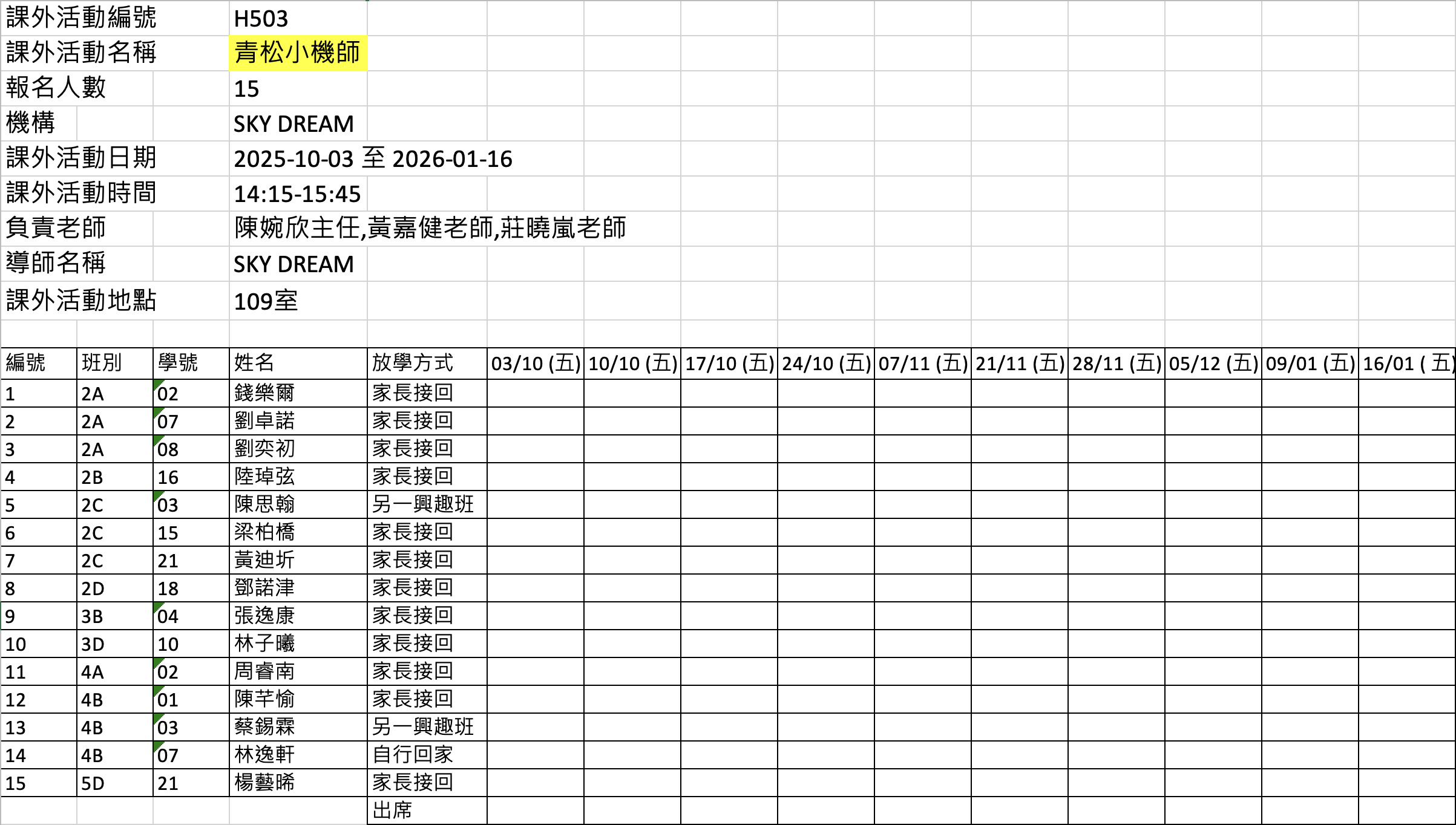 2526上學期周五興趣班名單