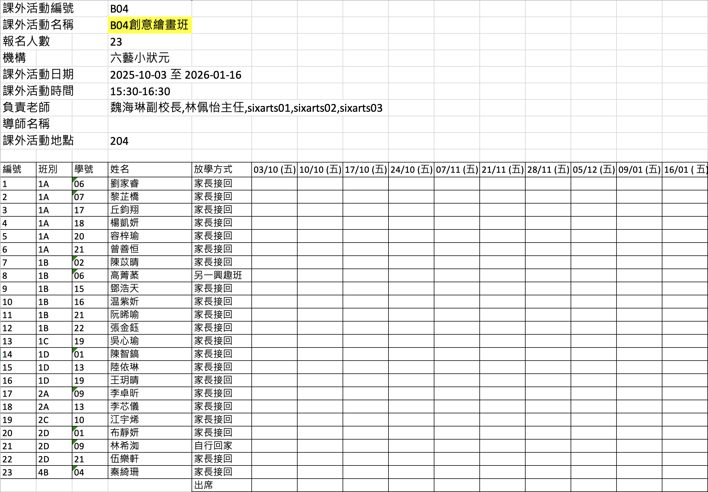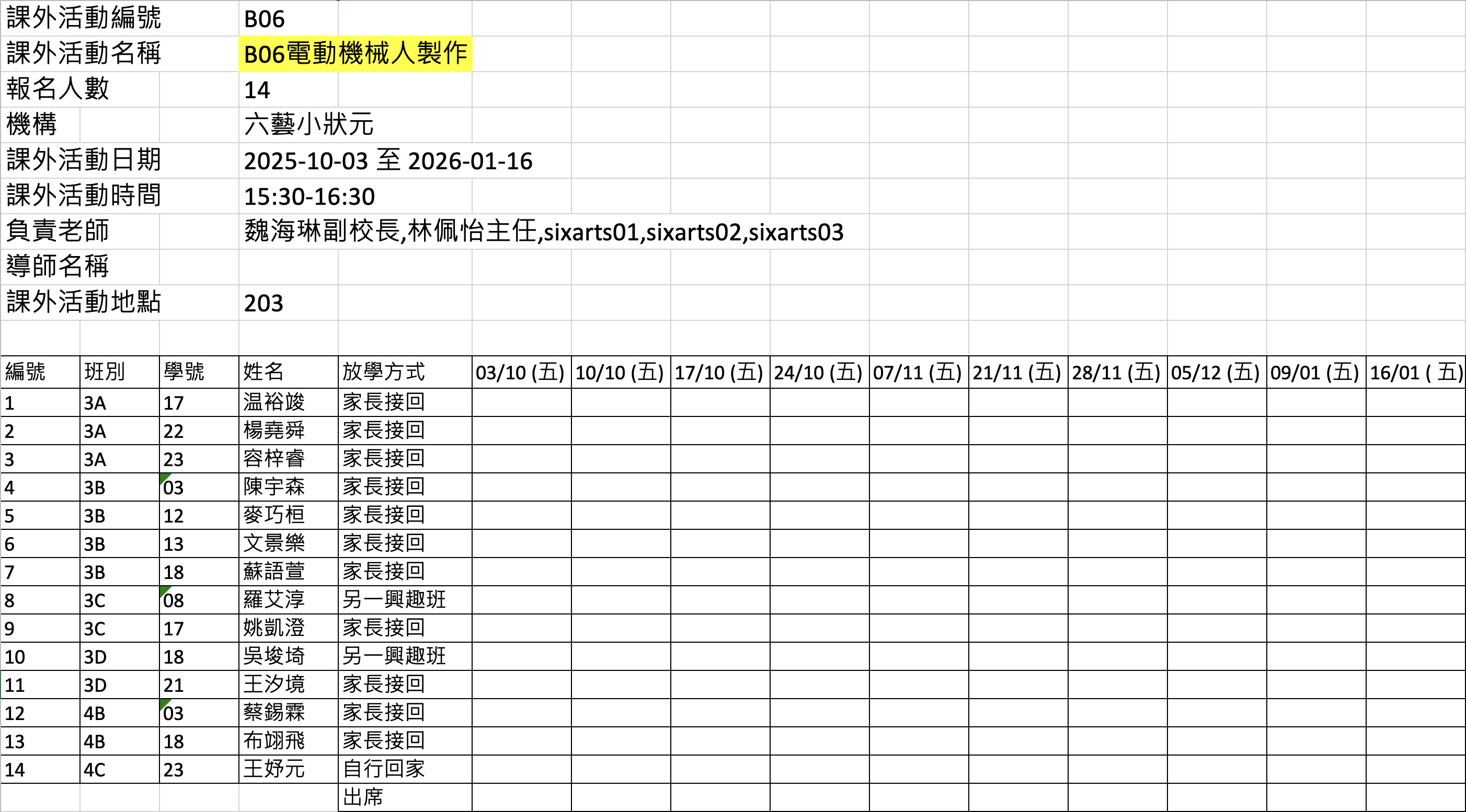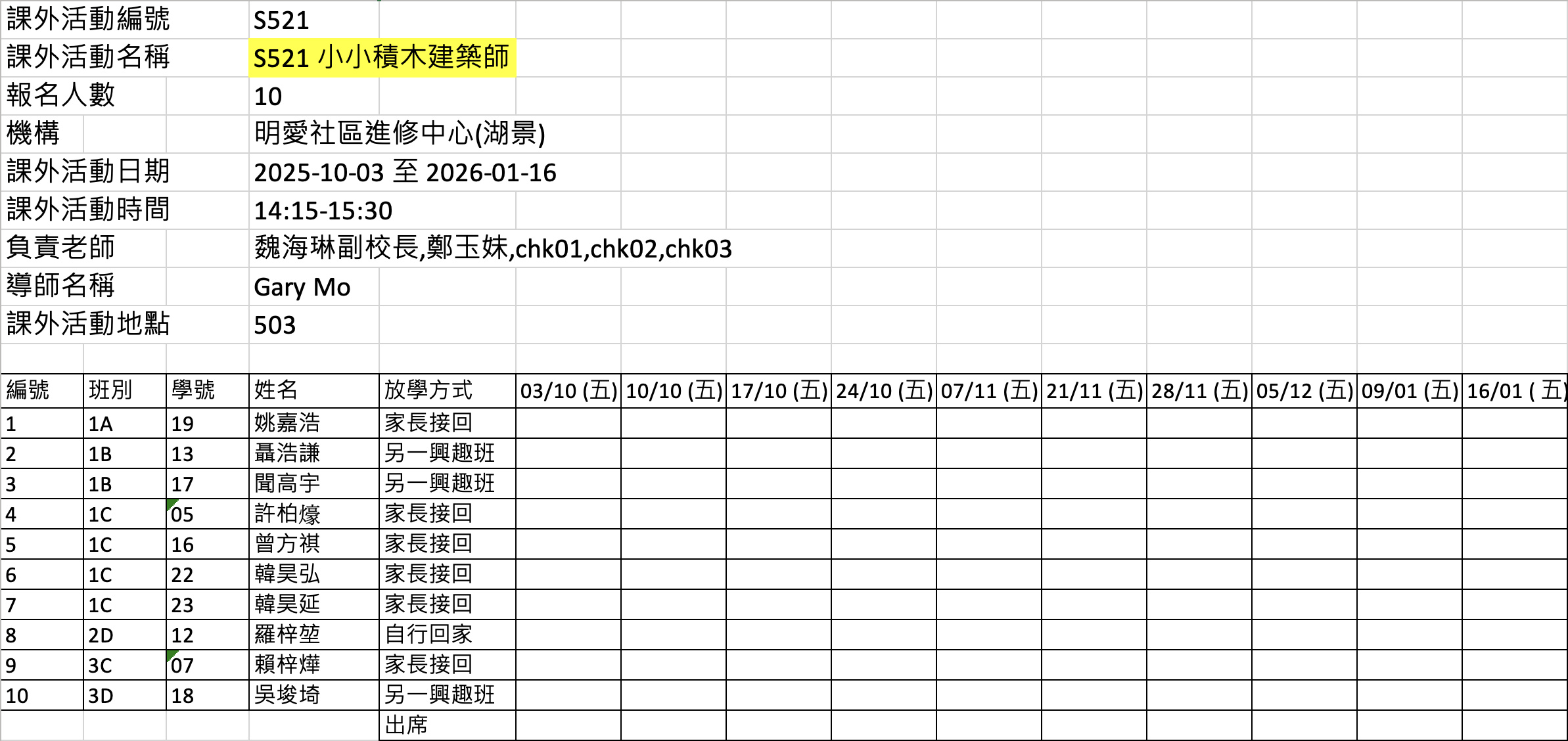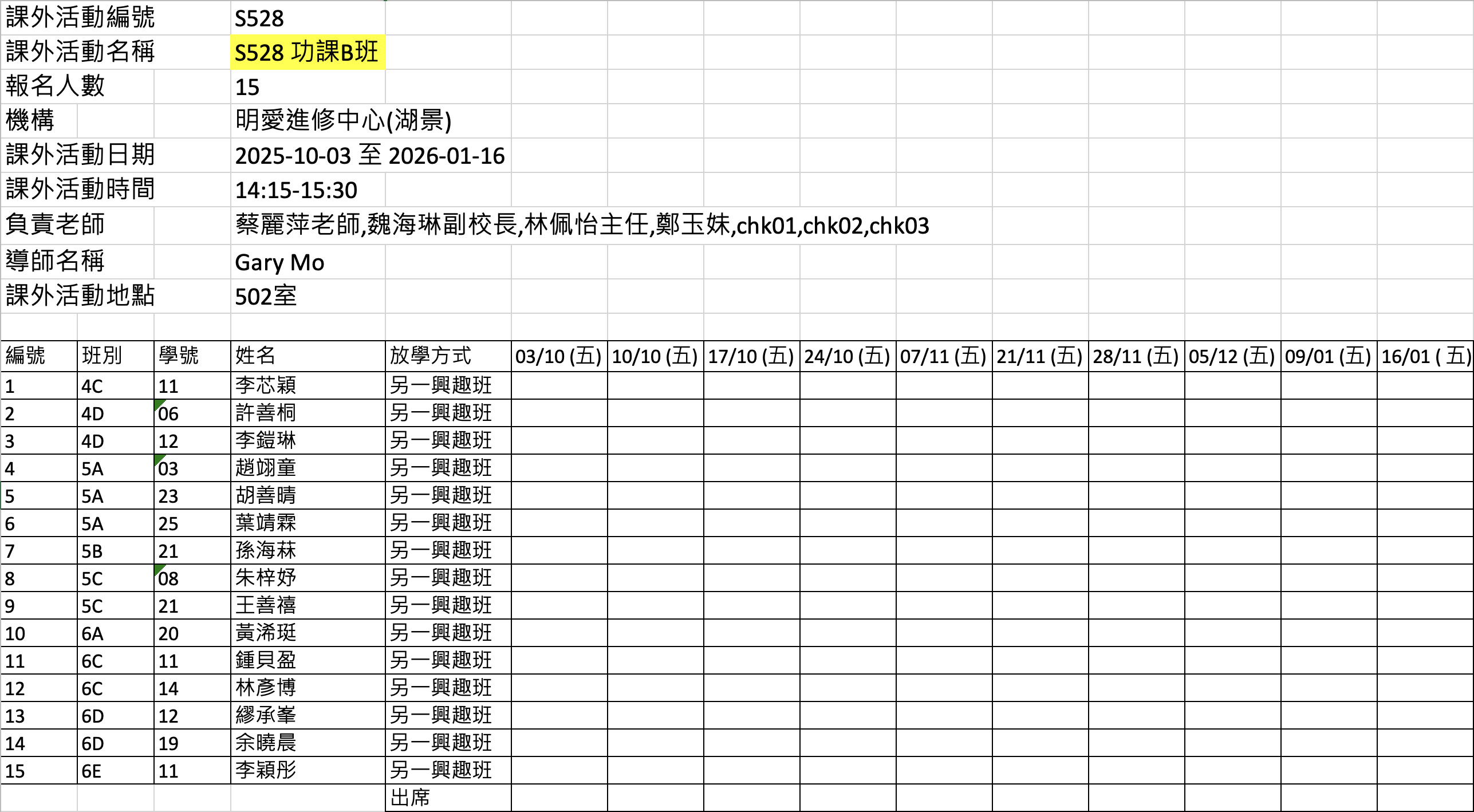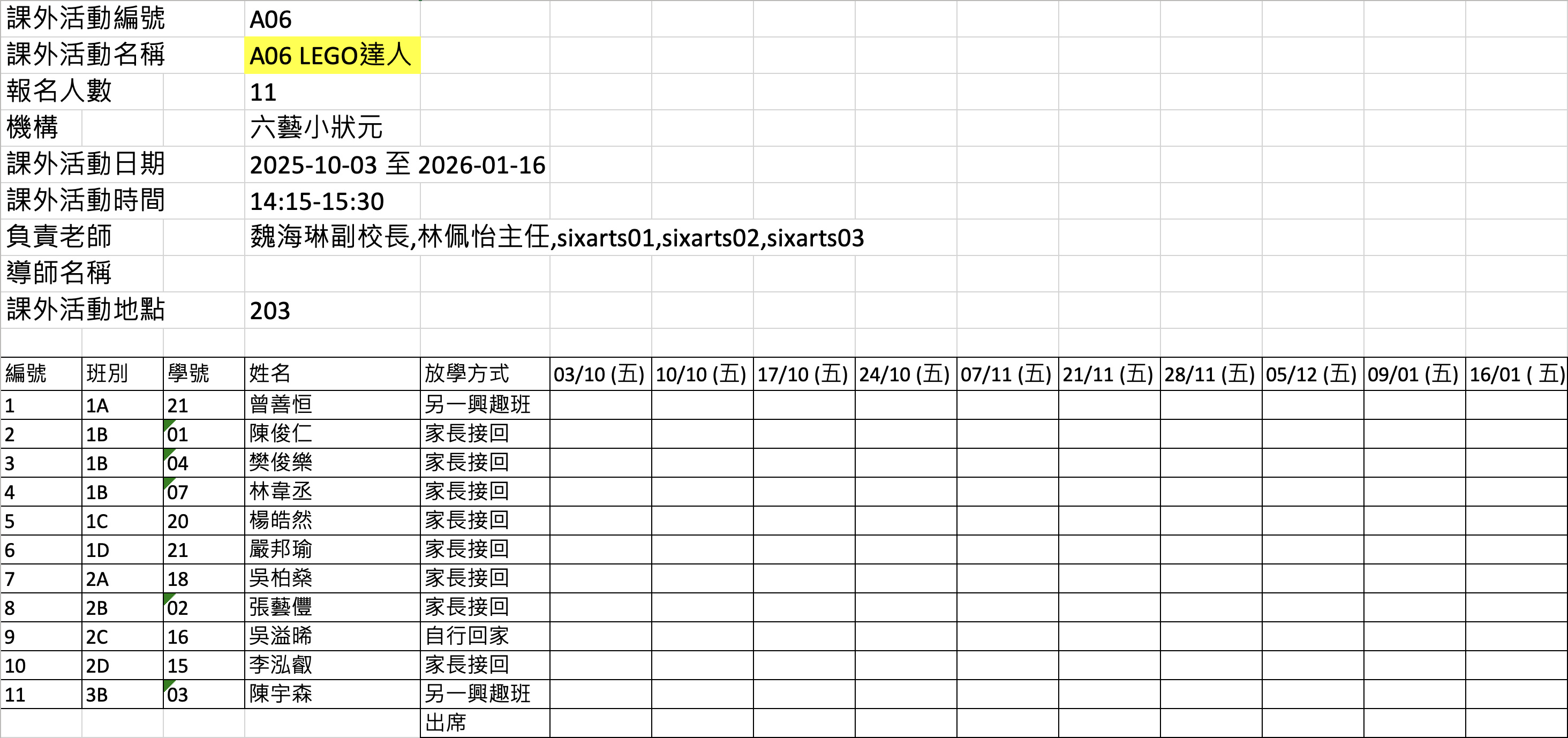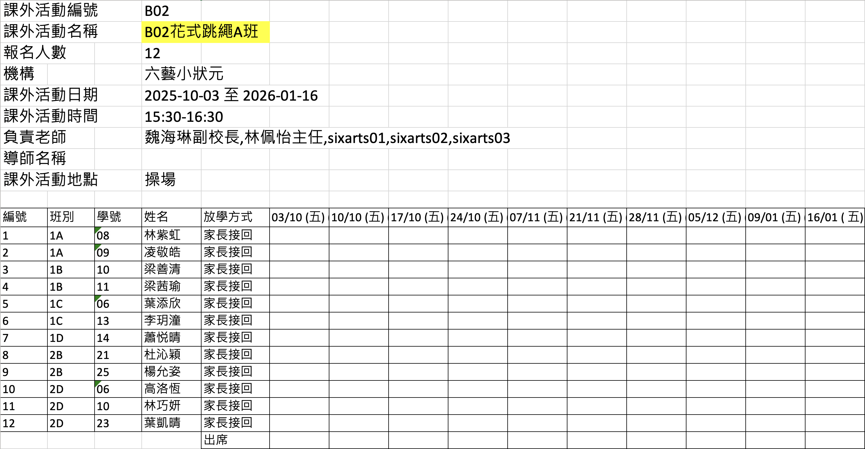 2526上學期周五興趣班名單