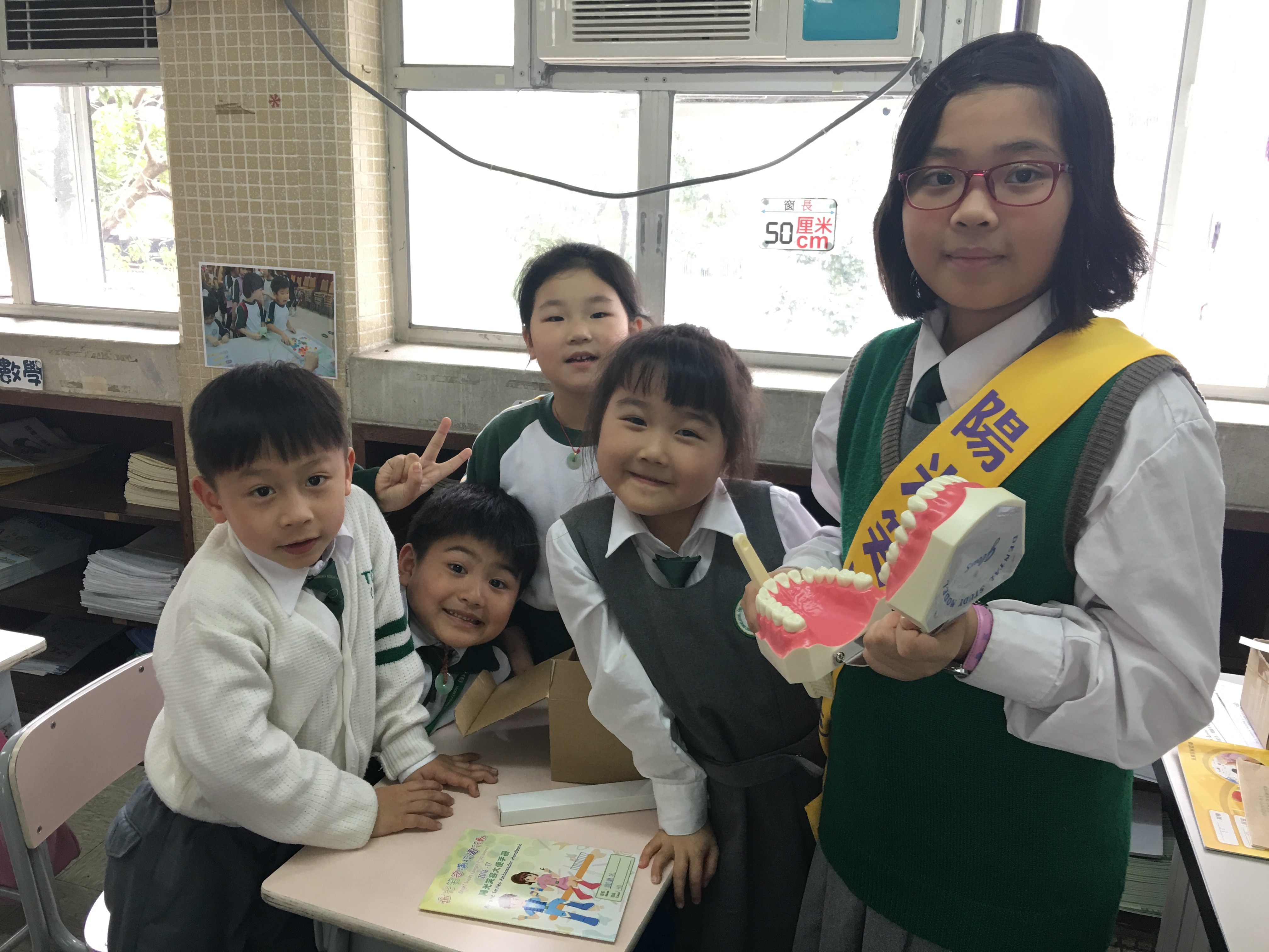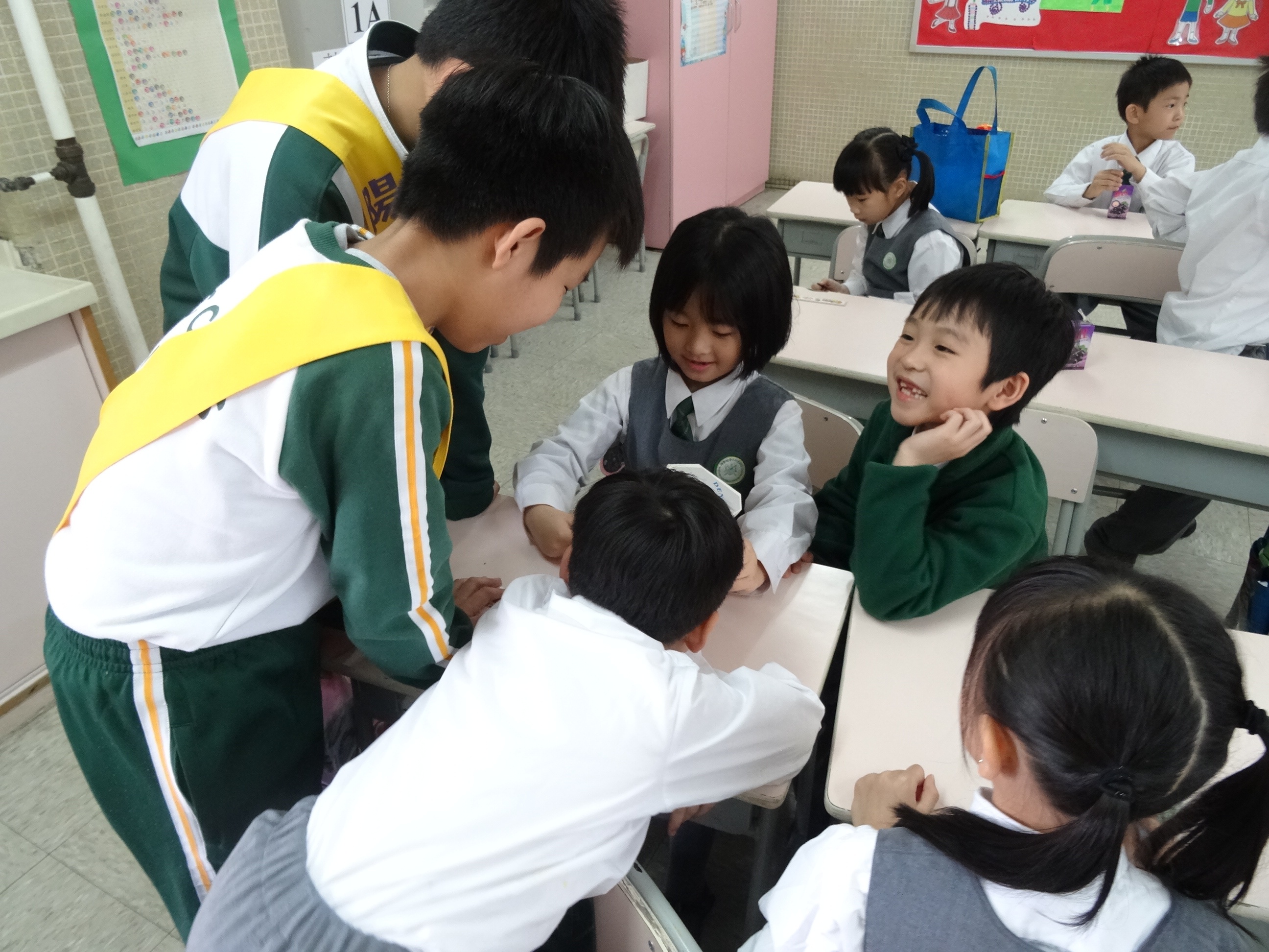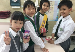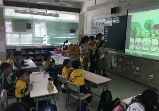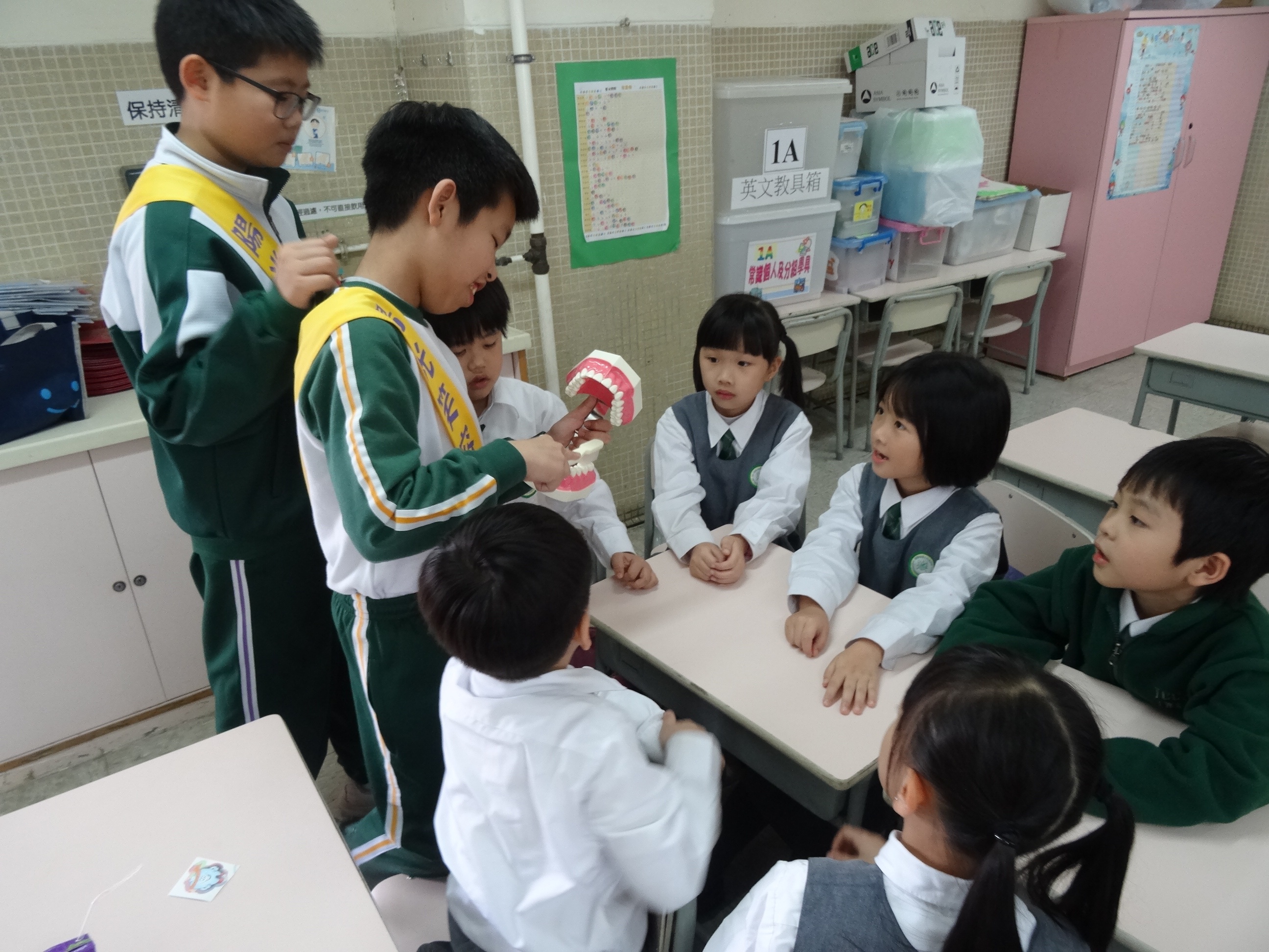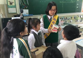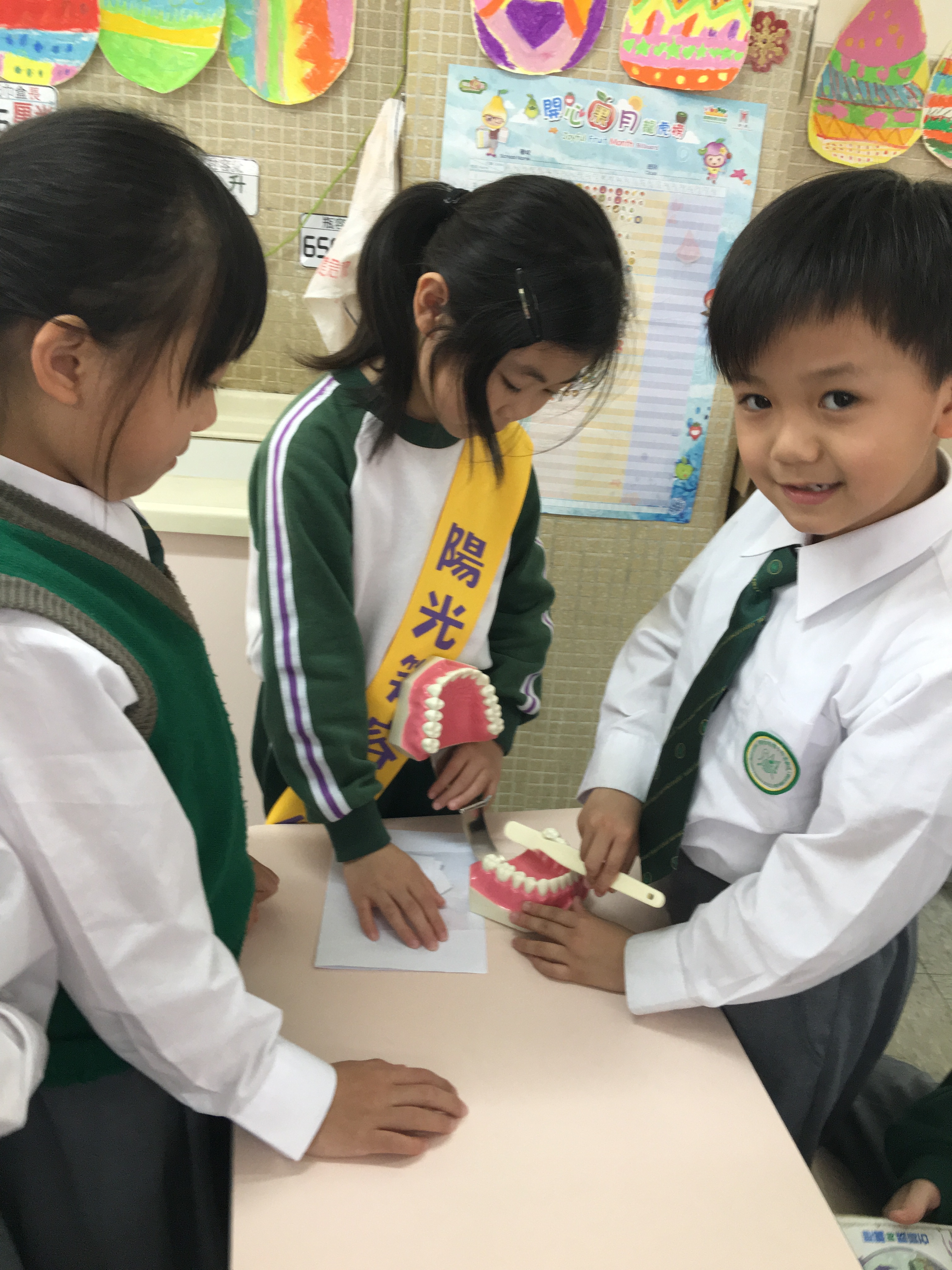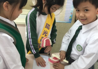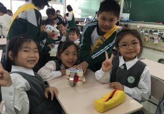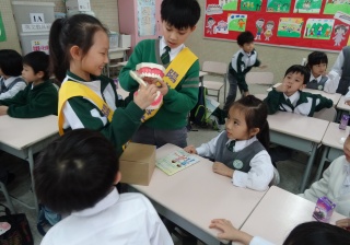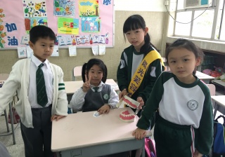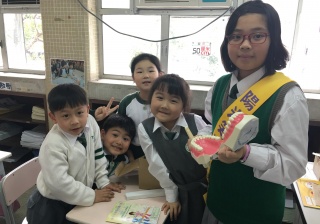 高年級的笑容大使教導一年級同學刷牙的正確方法及宣傳良好的化飲食習慣。