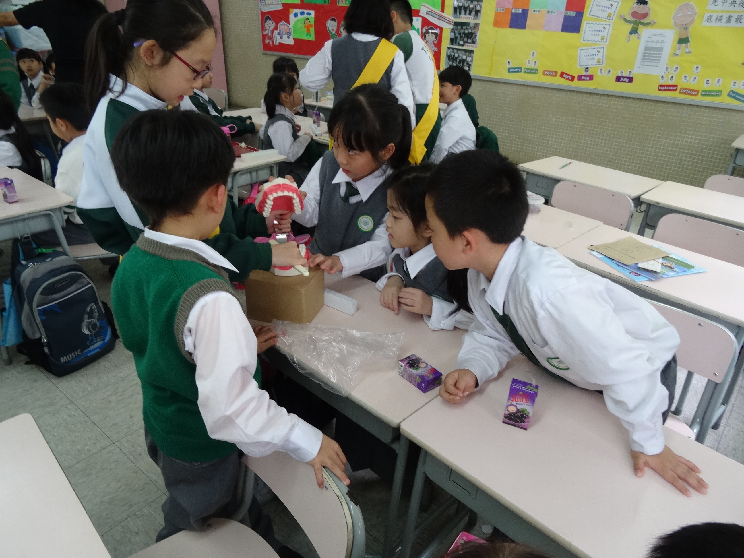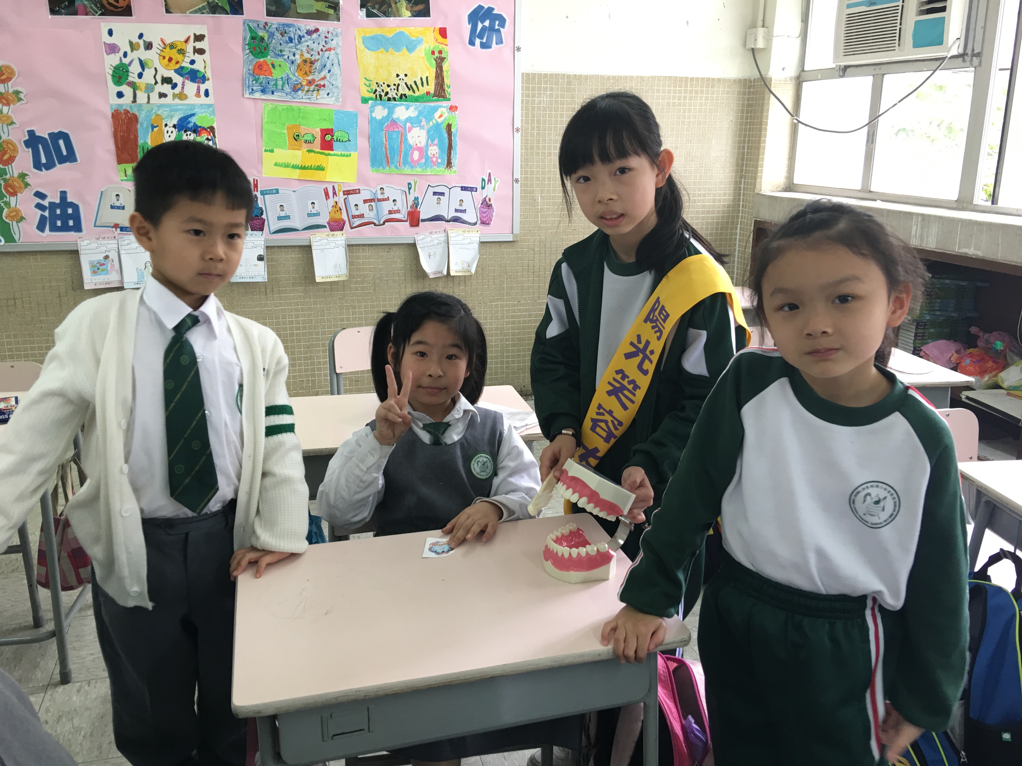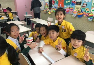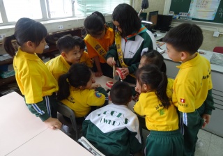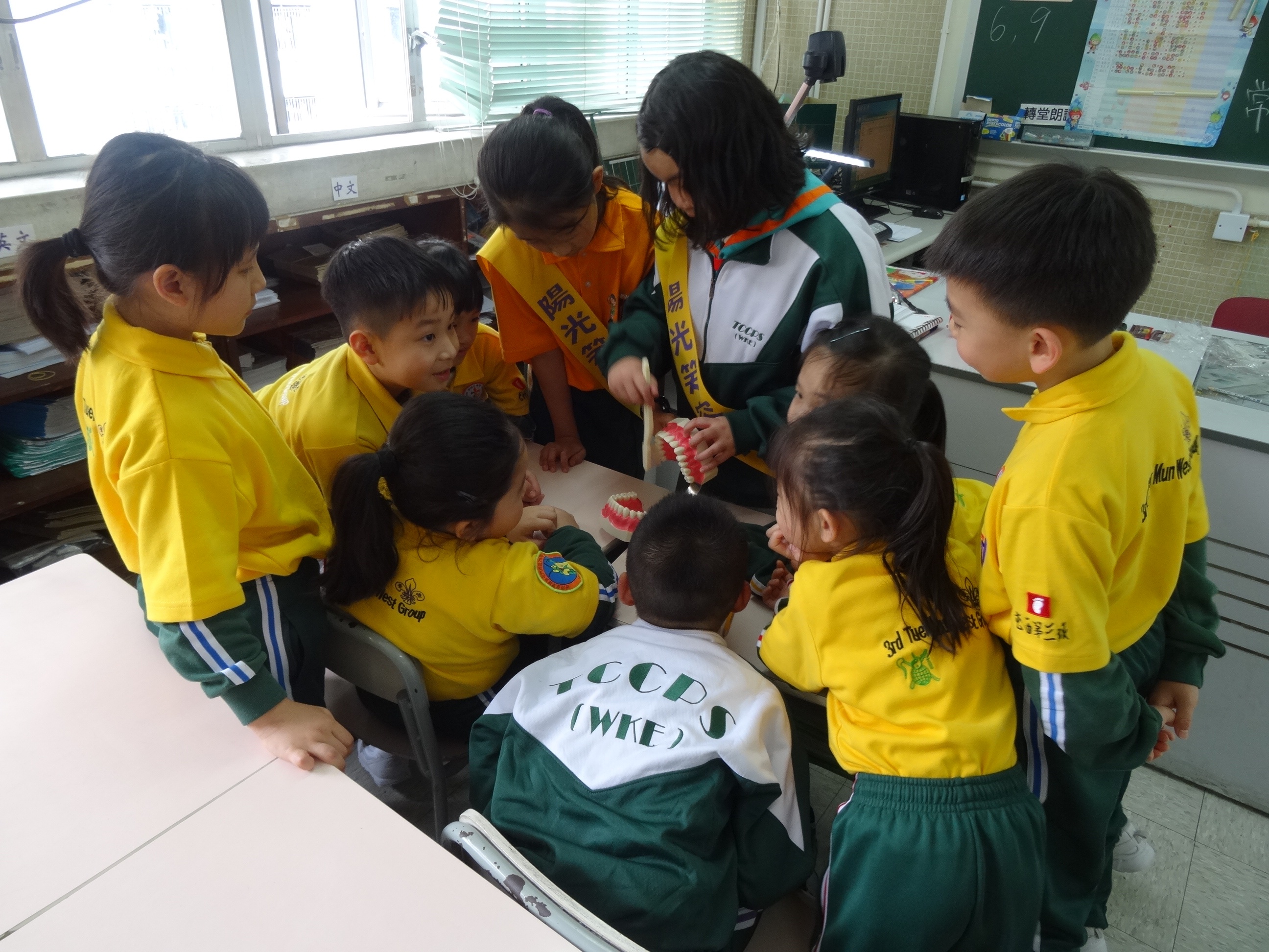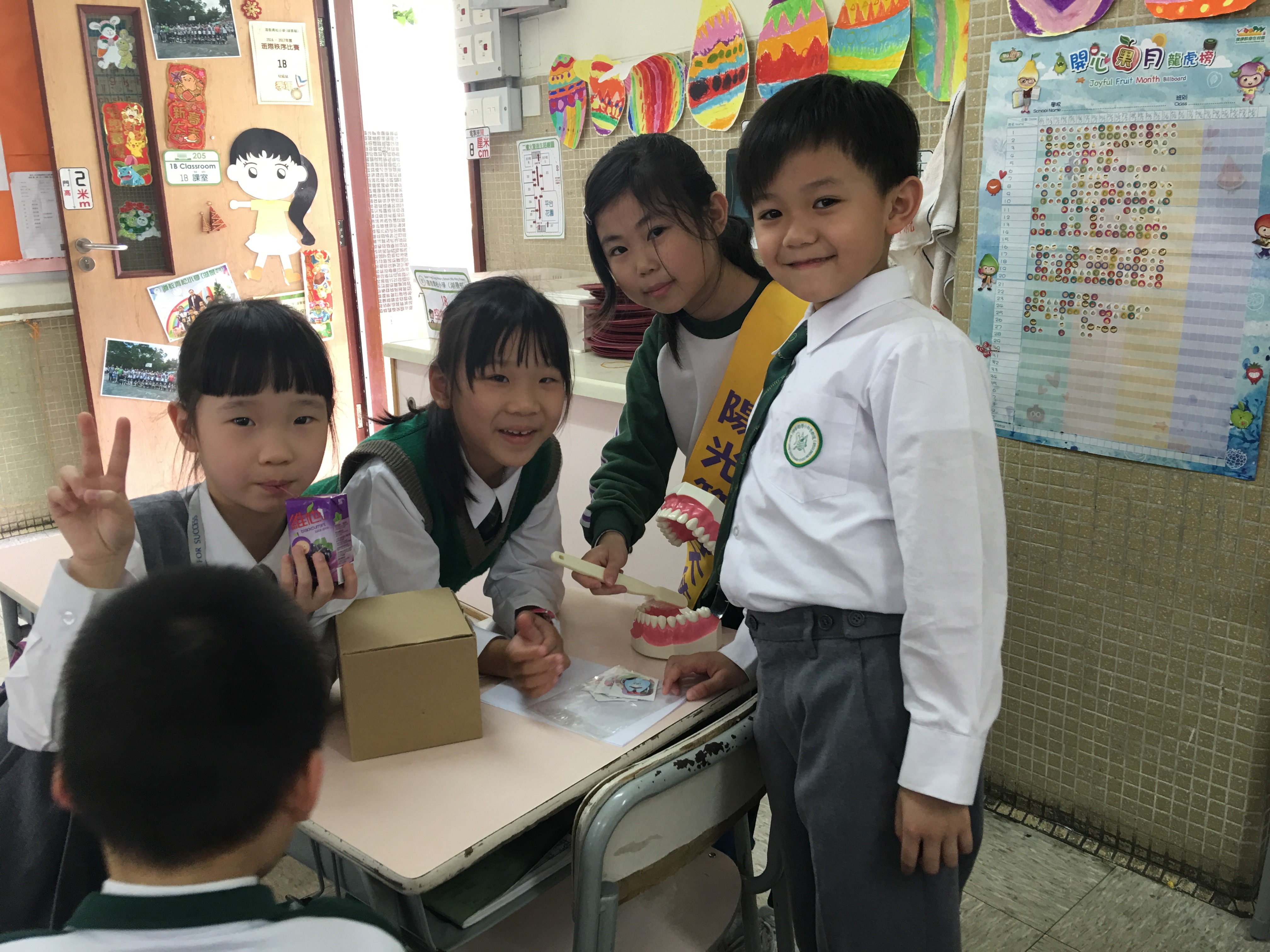 高年級的笑容大使教導一年級同學刷牙的正確方法及宣傳良好的化飲食習慣。