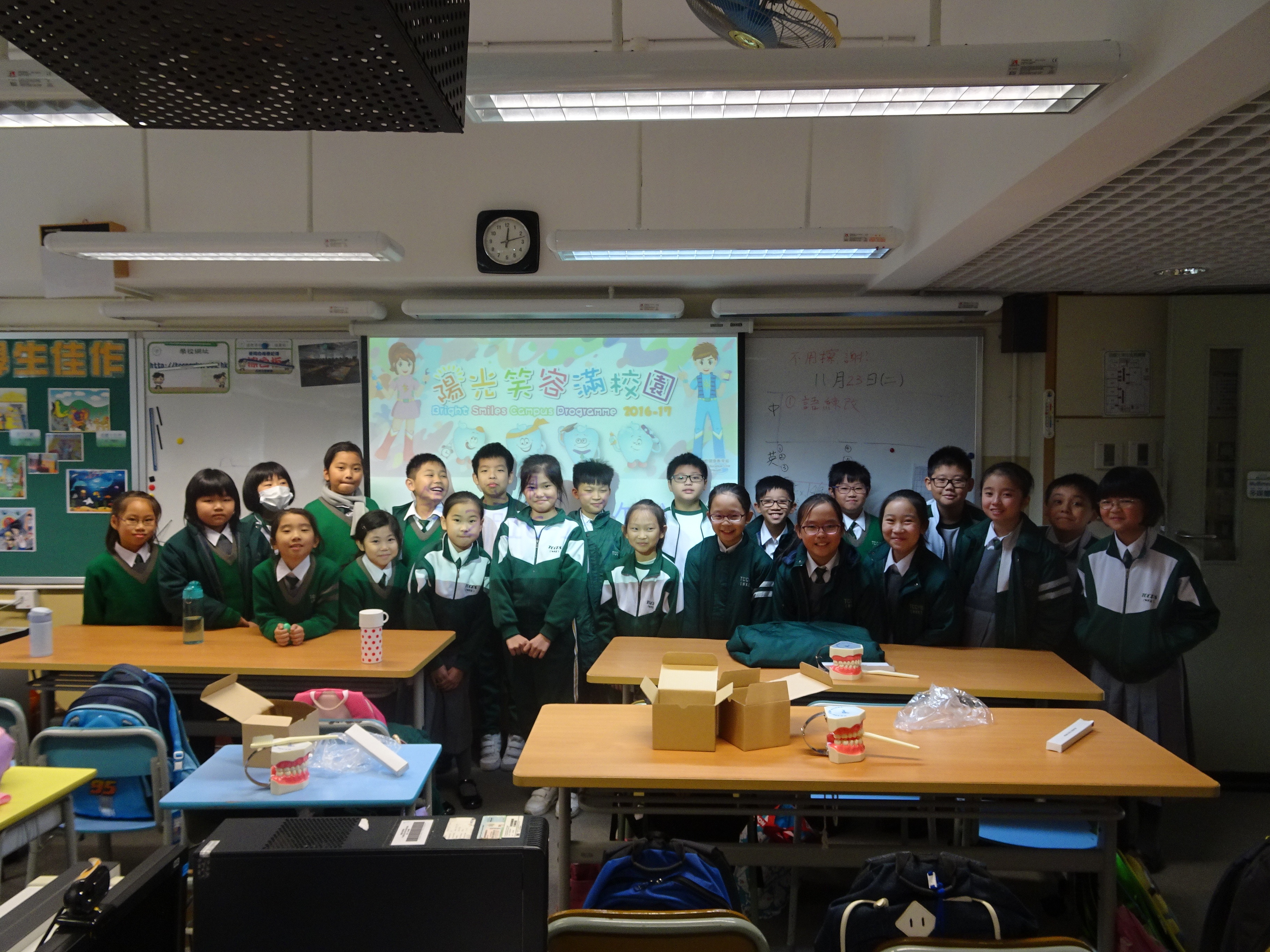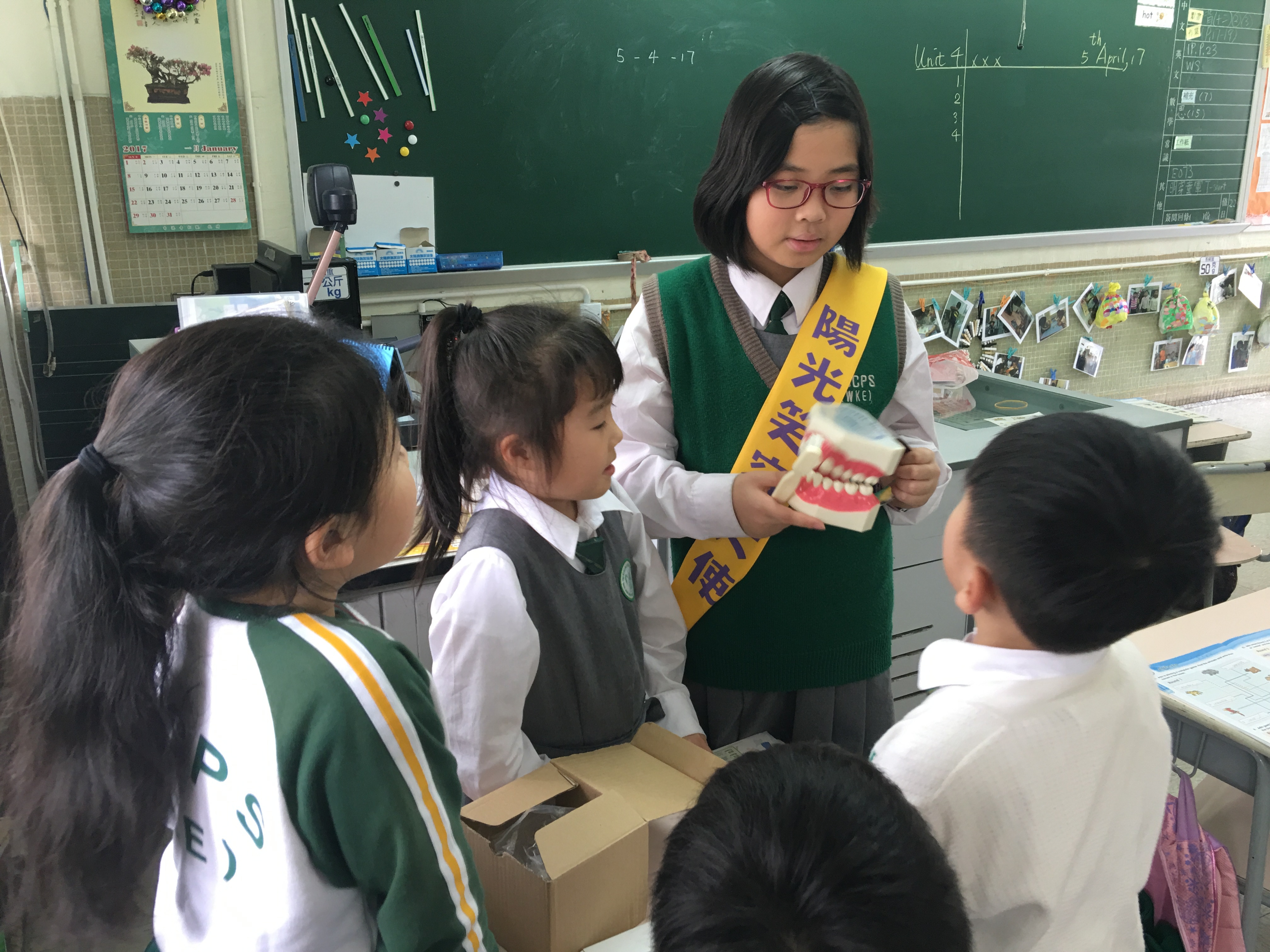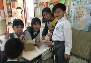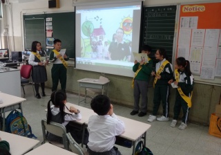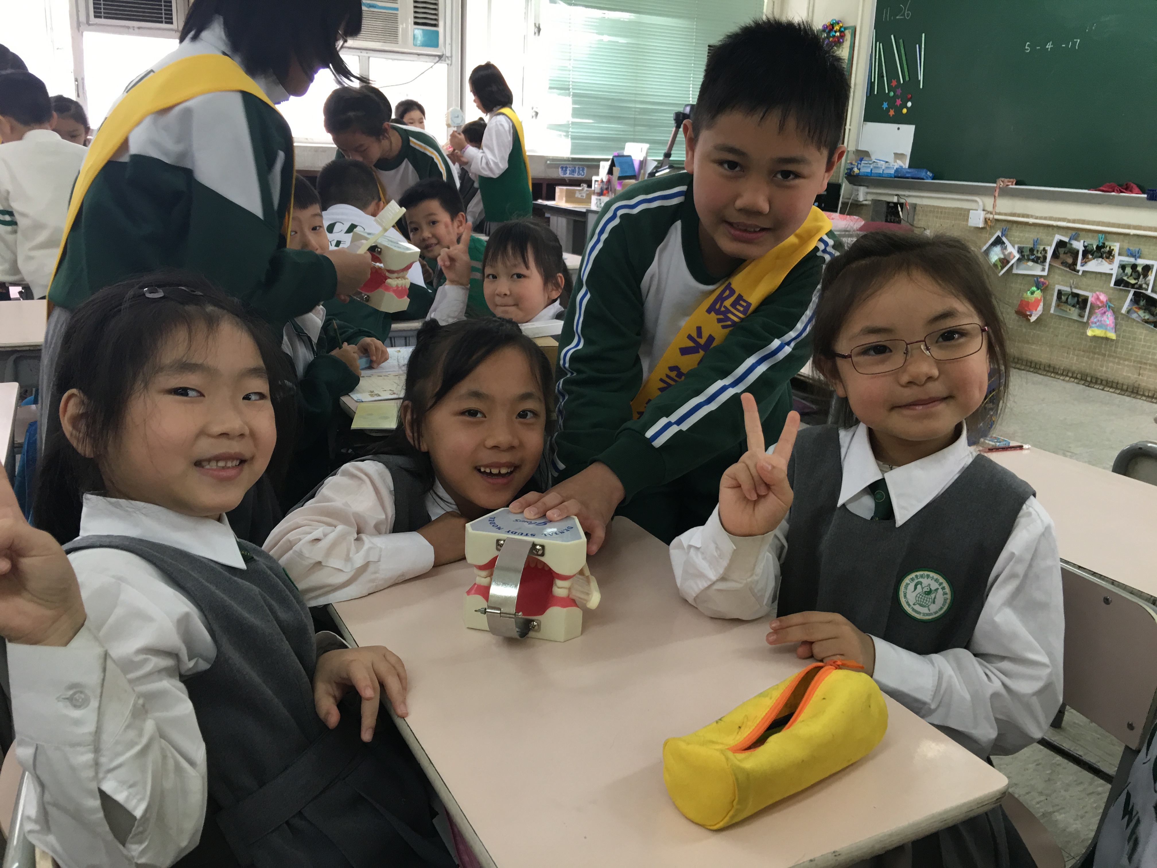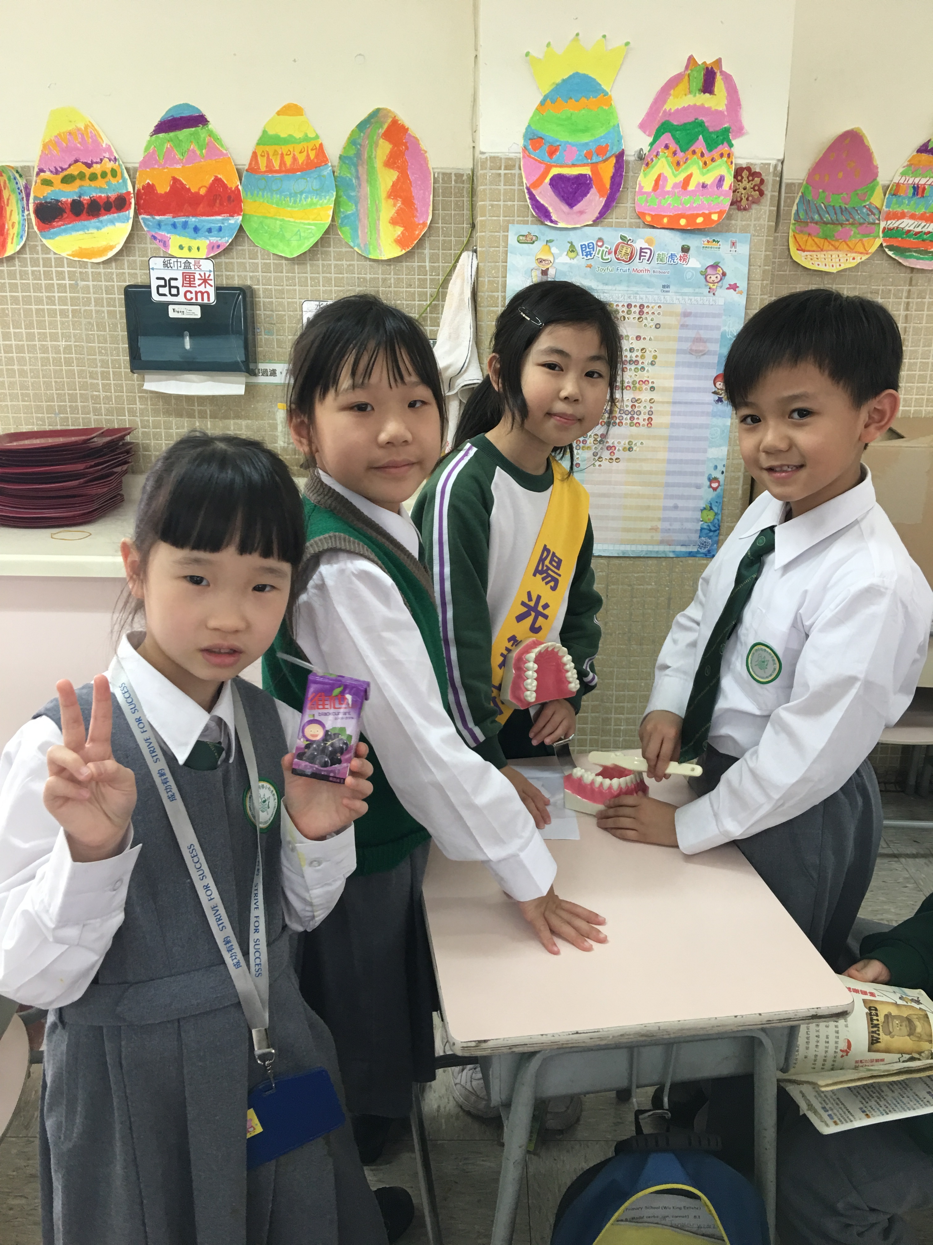 高年級的笑容大使教導一年級同學刷牙的正確方法及宣傳良好的化飲食習慣。