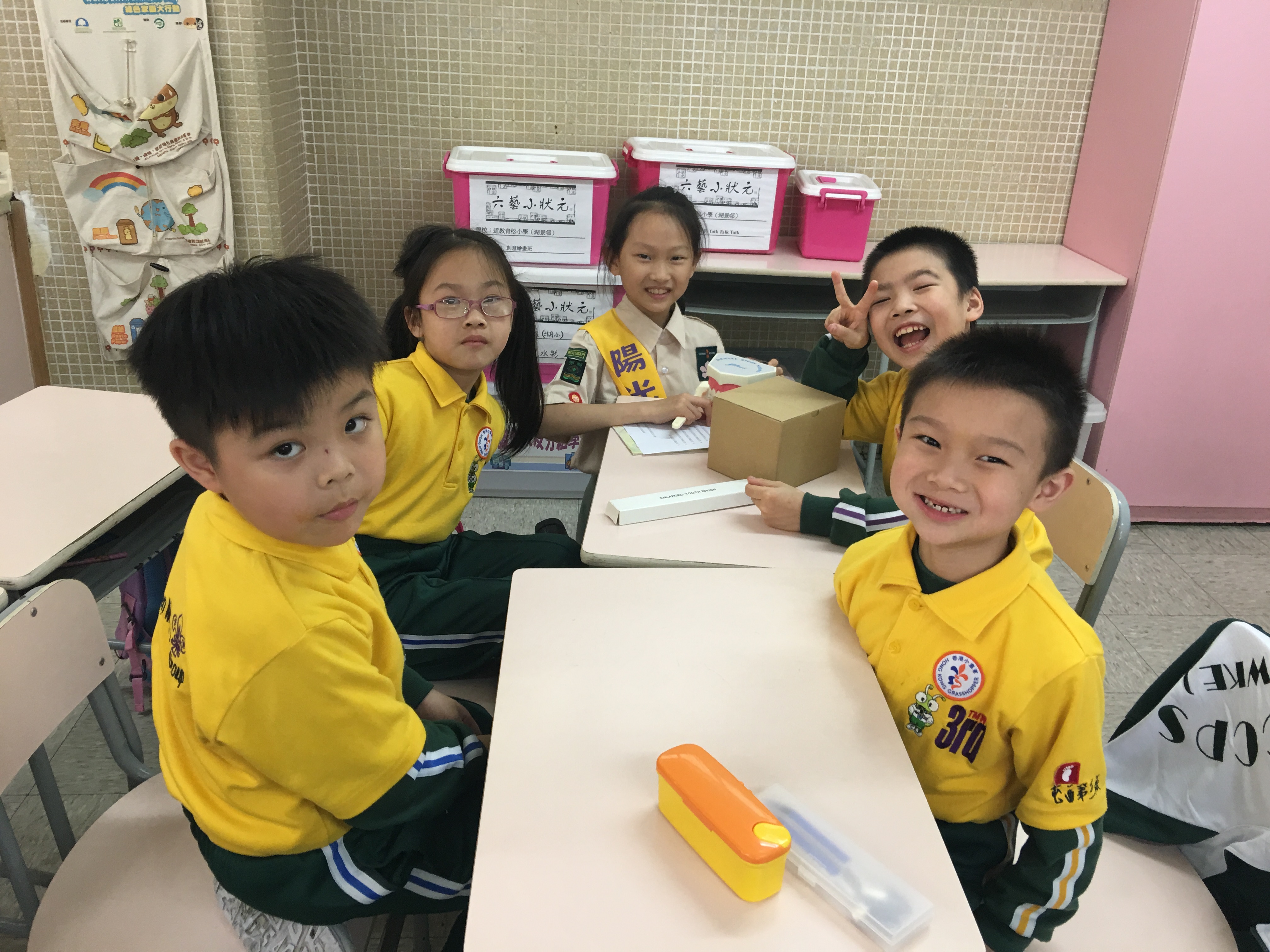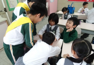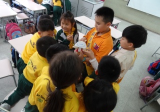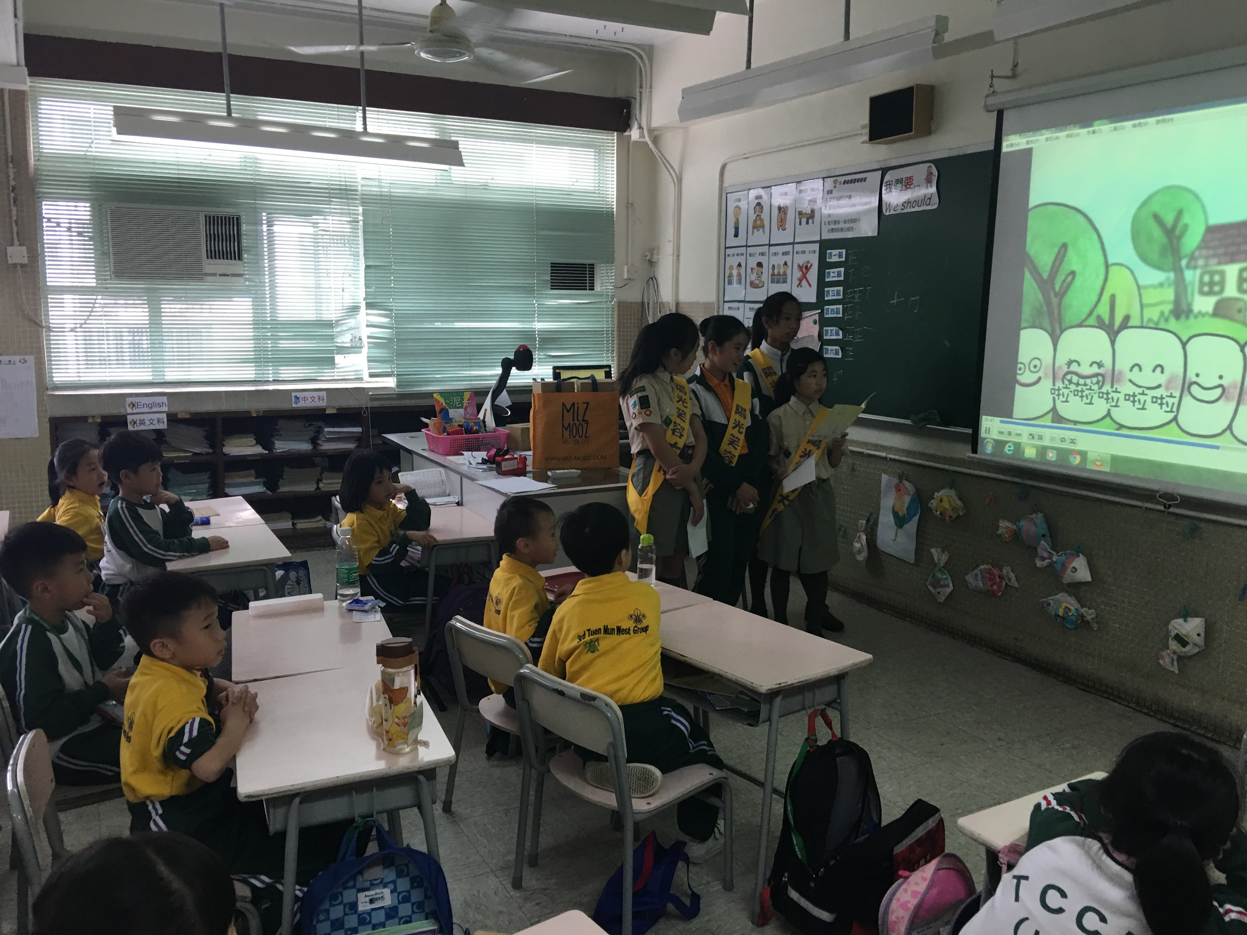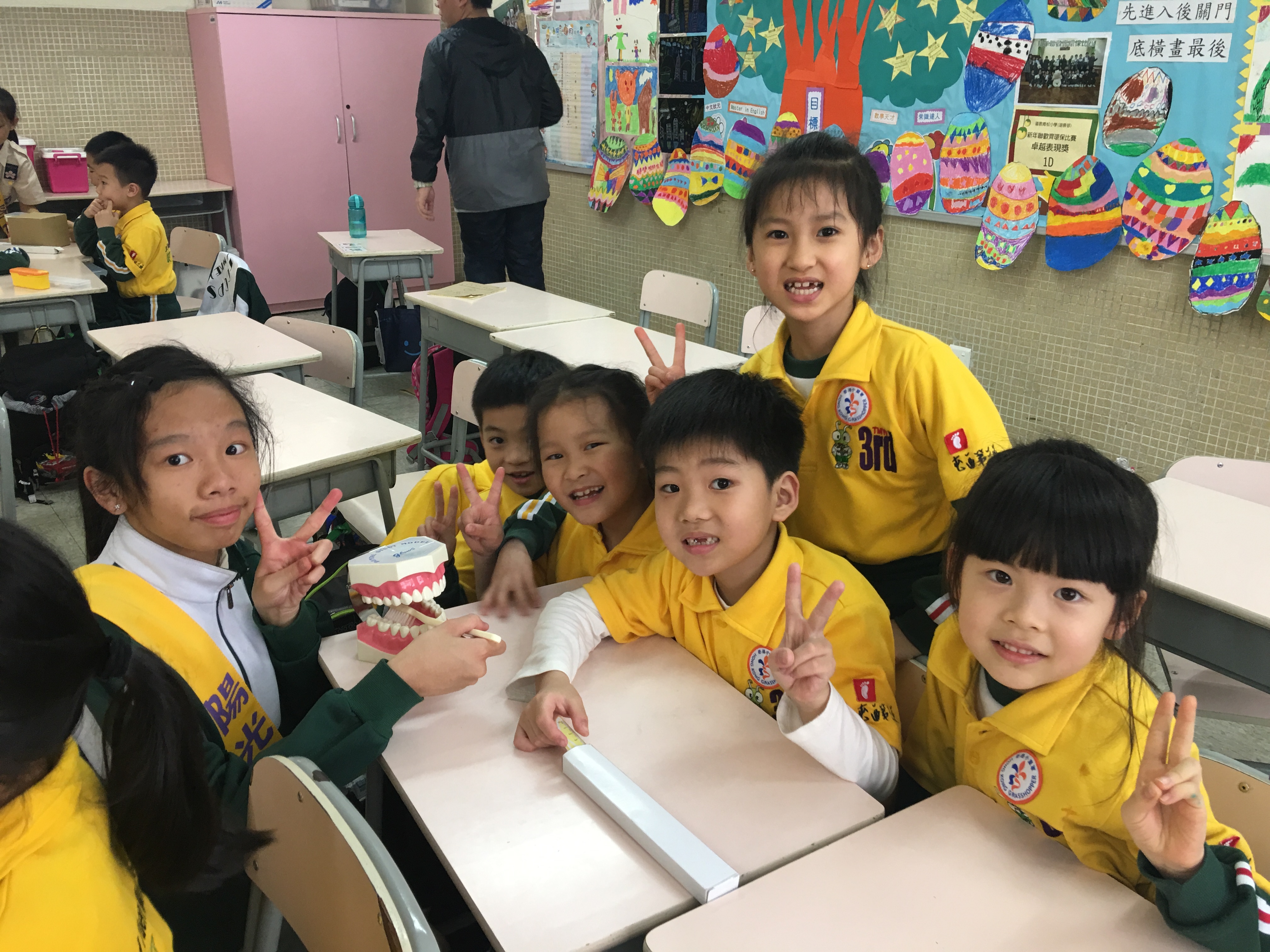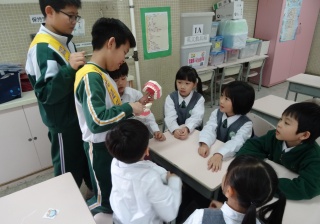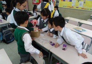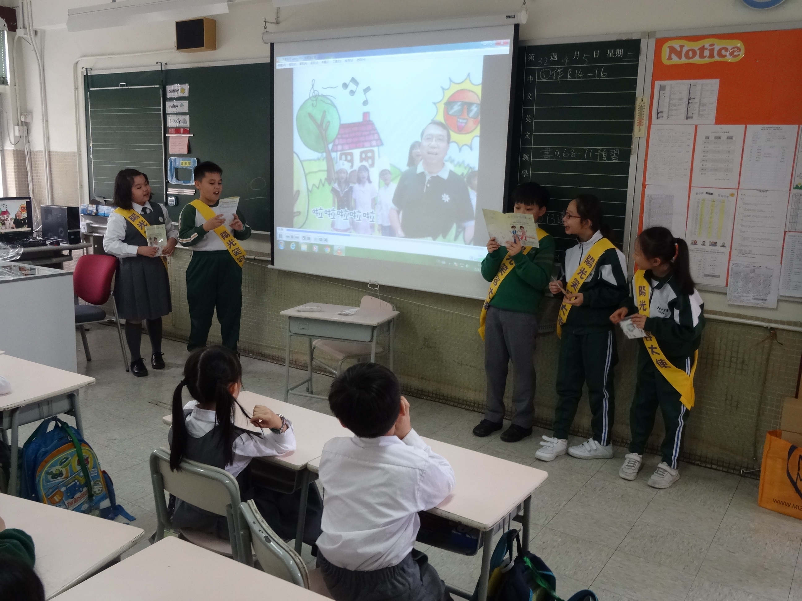 高年級的笑容大使教導一年級同學刷牙的正確方法及宣傳良好的化飲食習慣。
