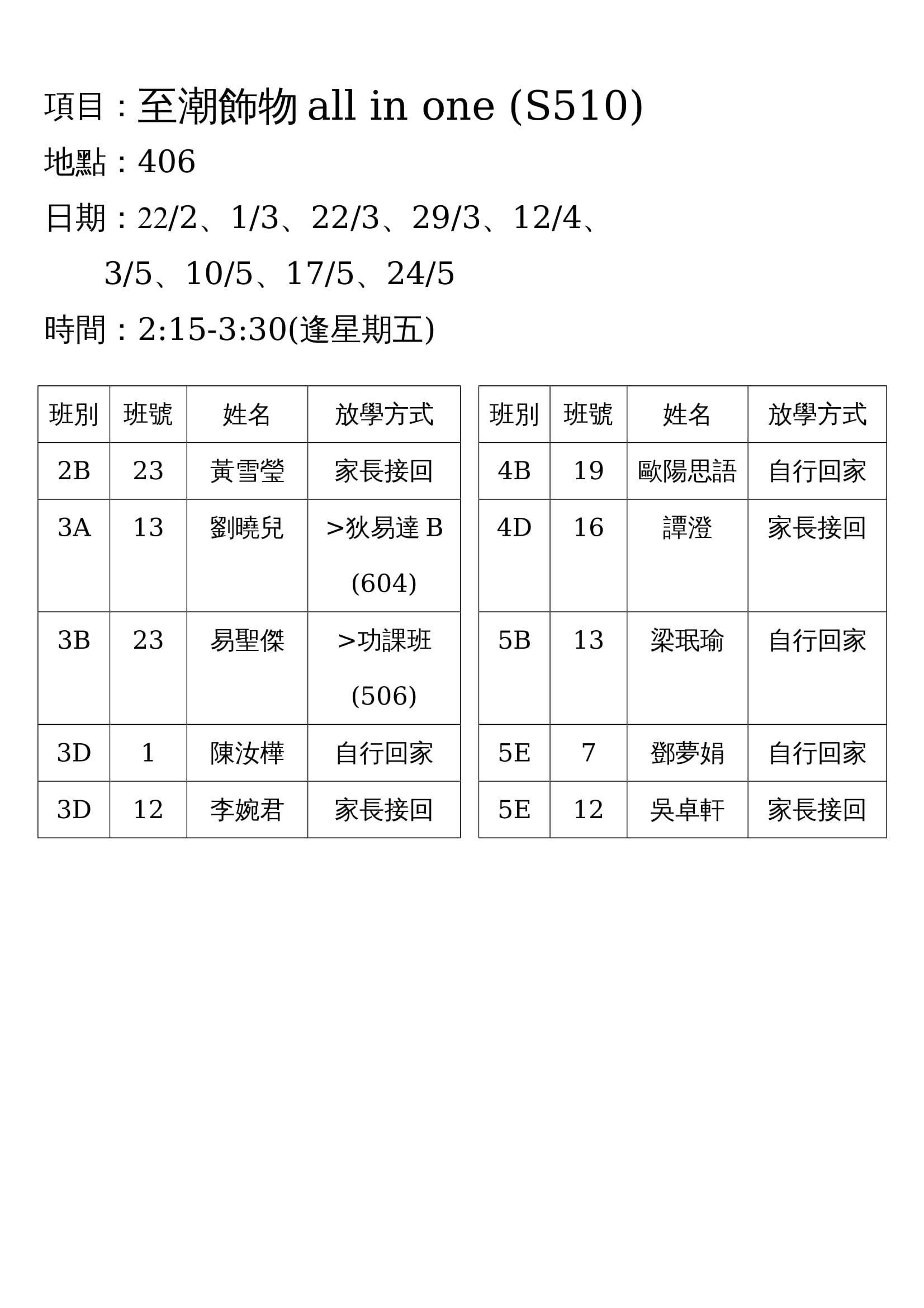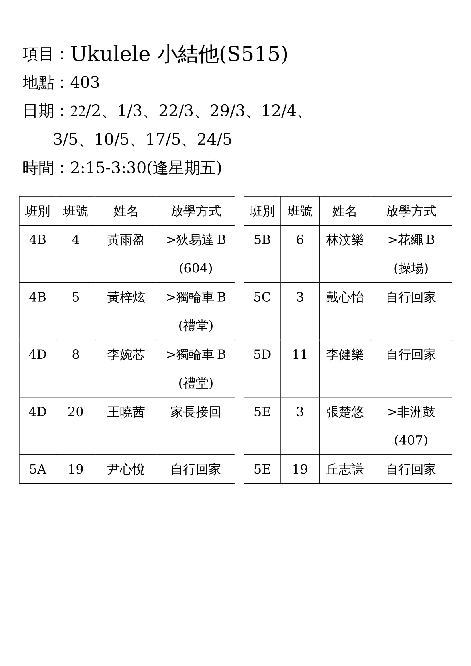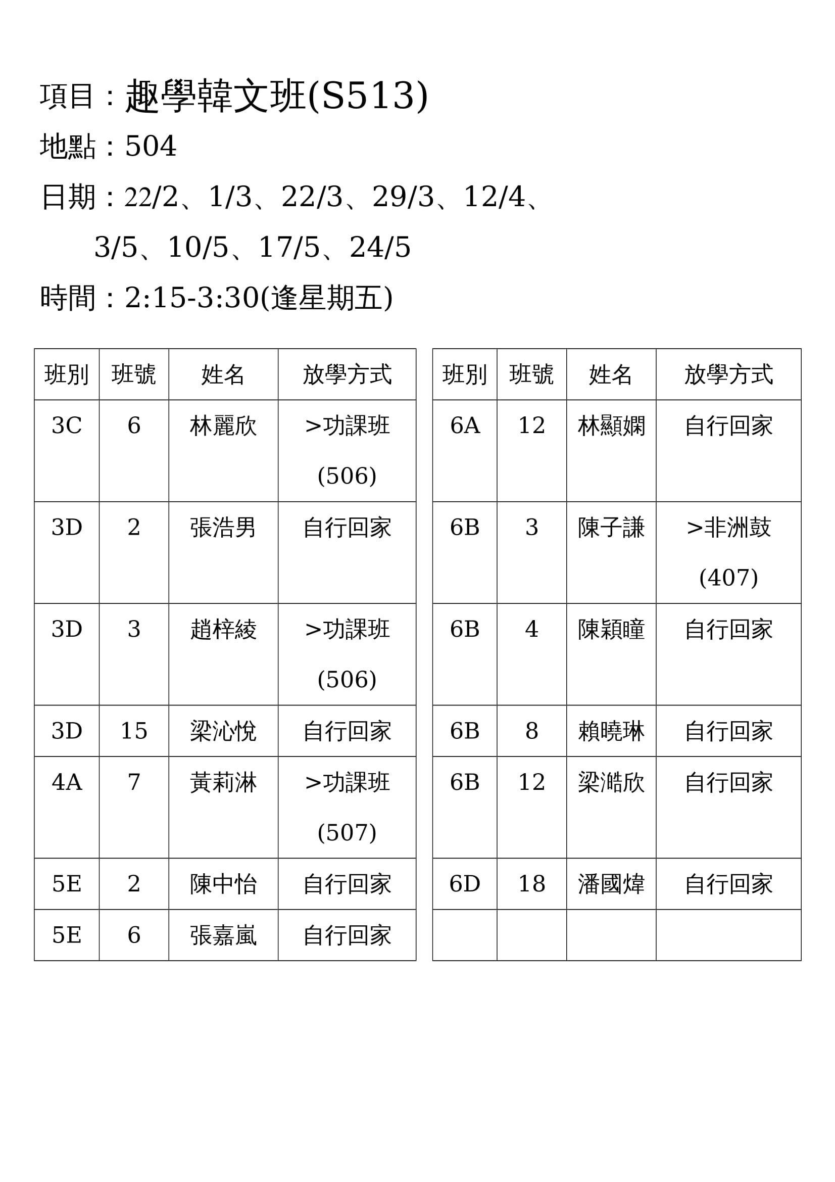 下學期興趣班