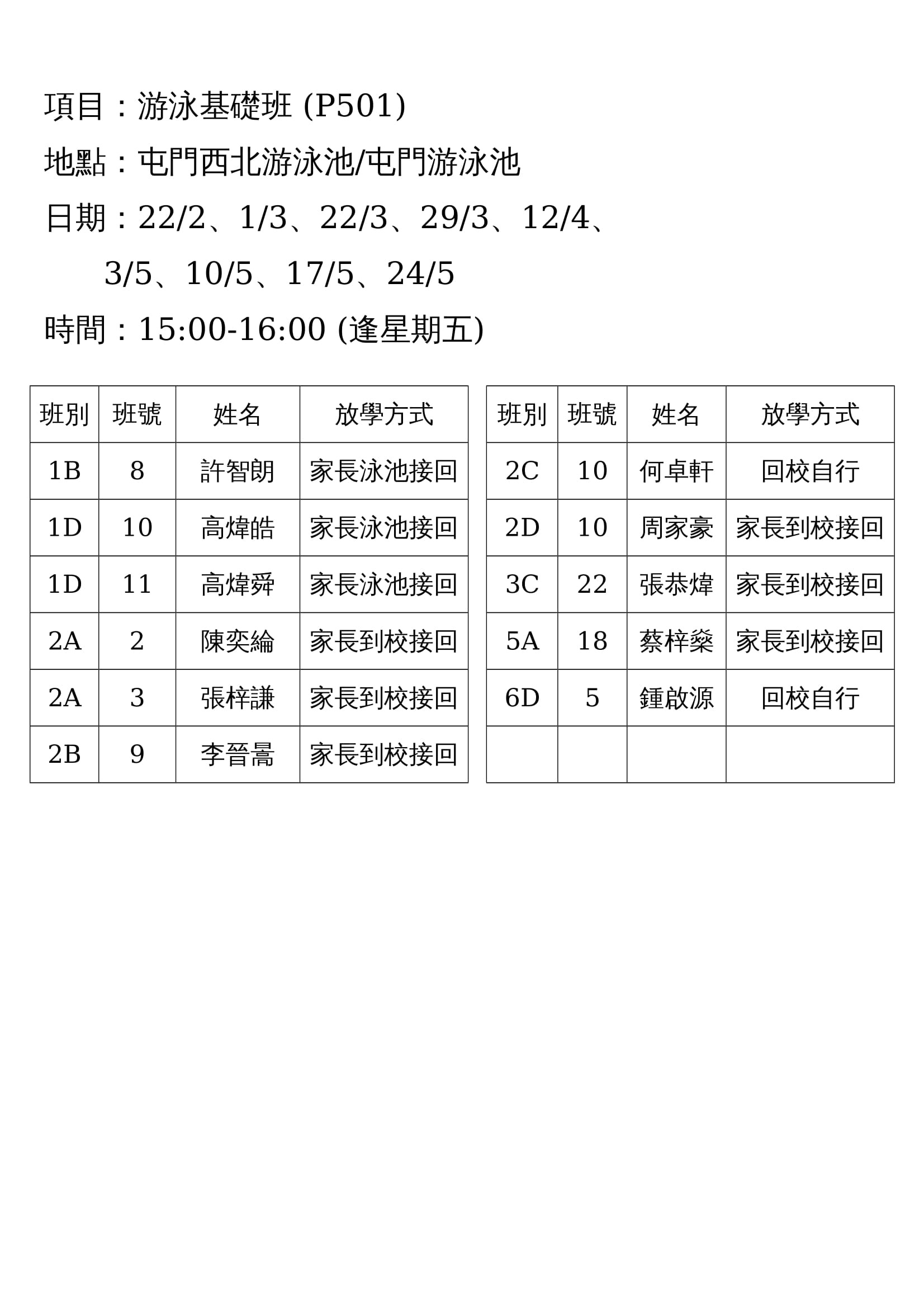 (P501)游泳基礎班