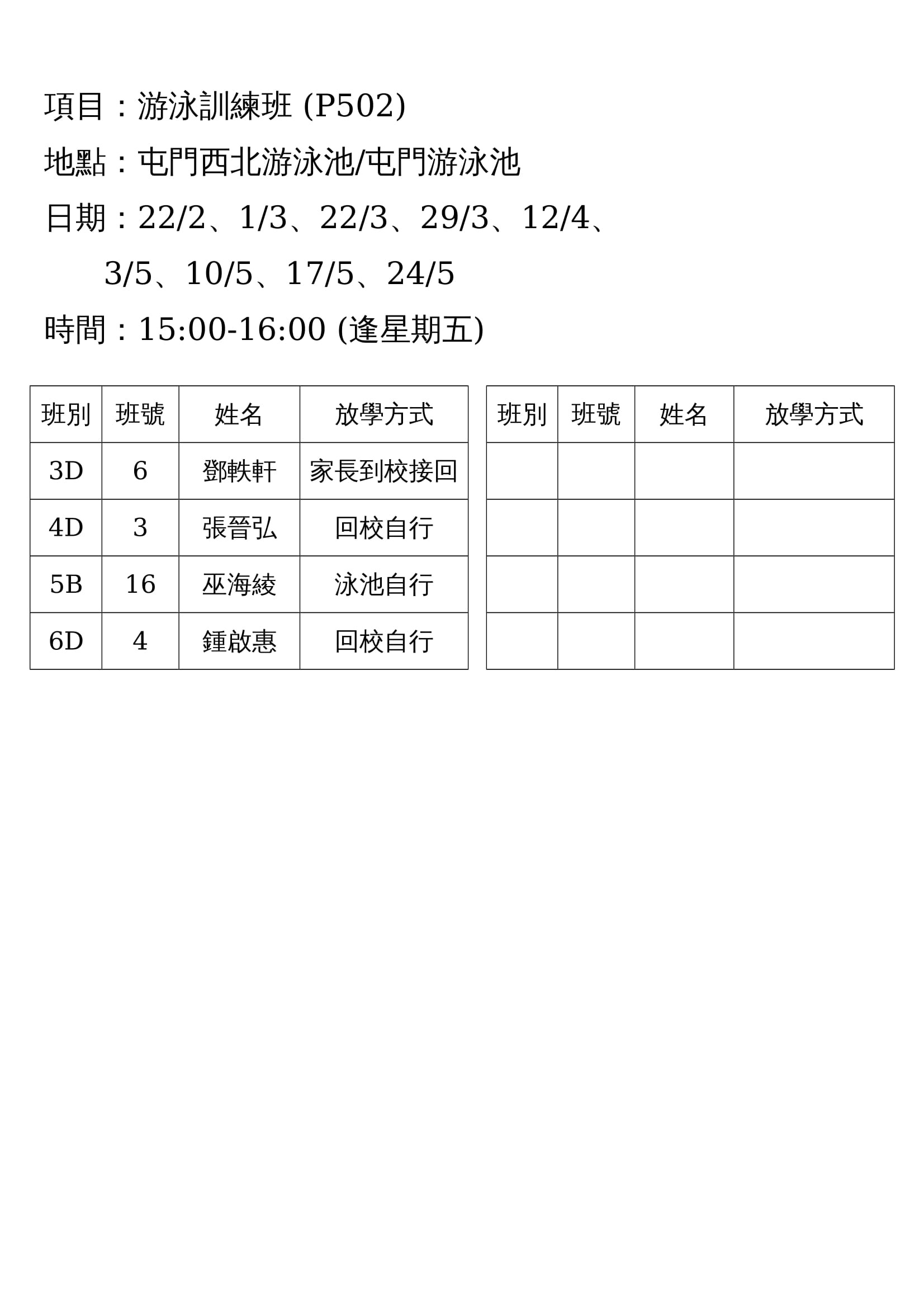 (P502)游泳訓練班