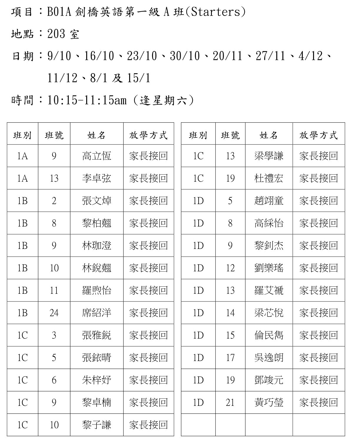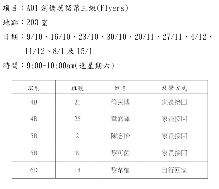 B01A劍橋英語第一級A班(Starters)(203)