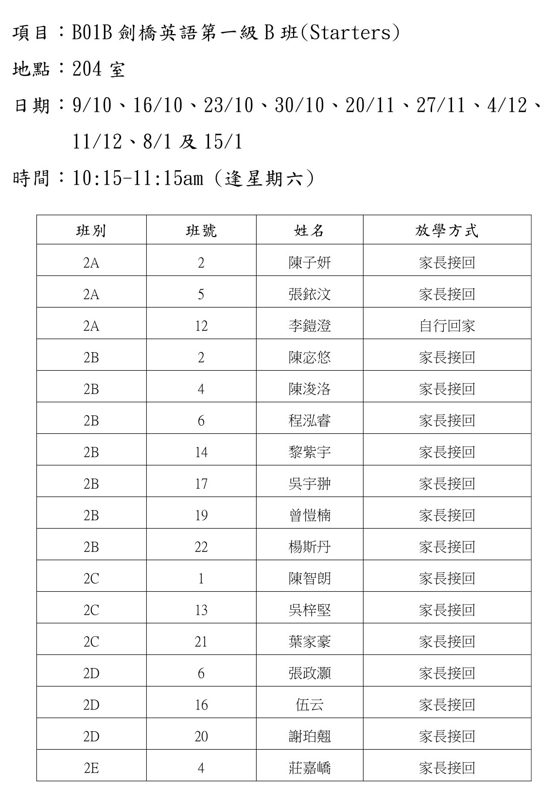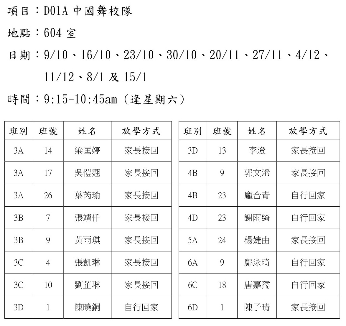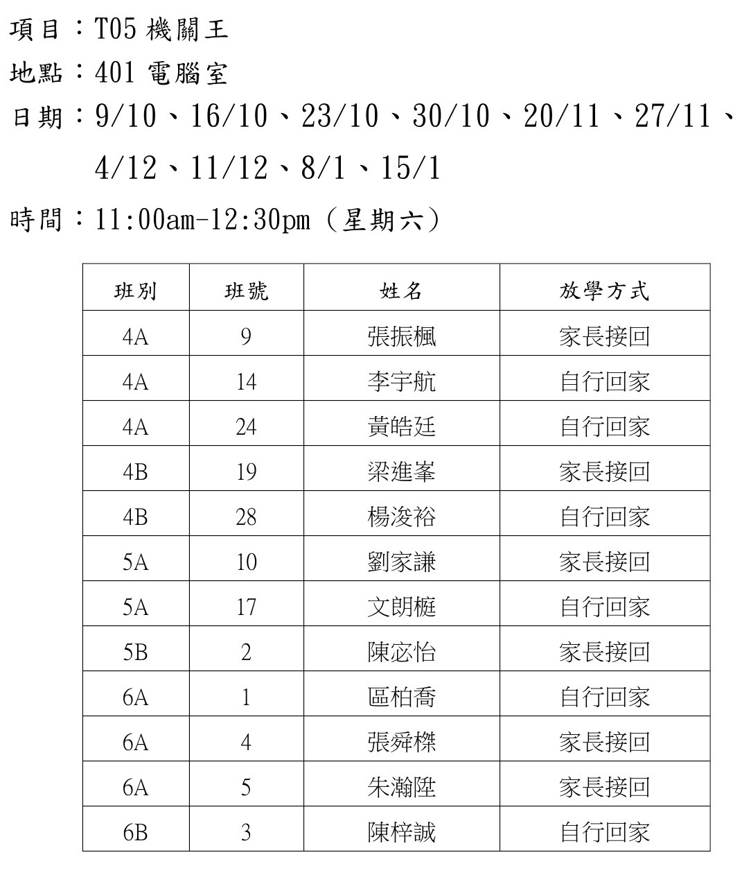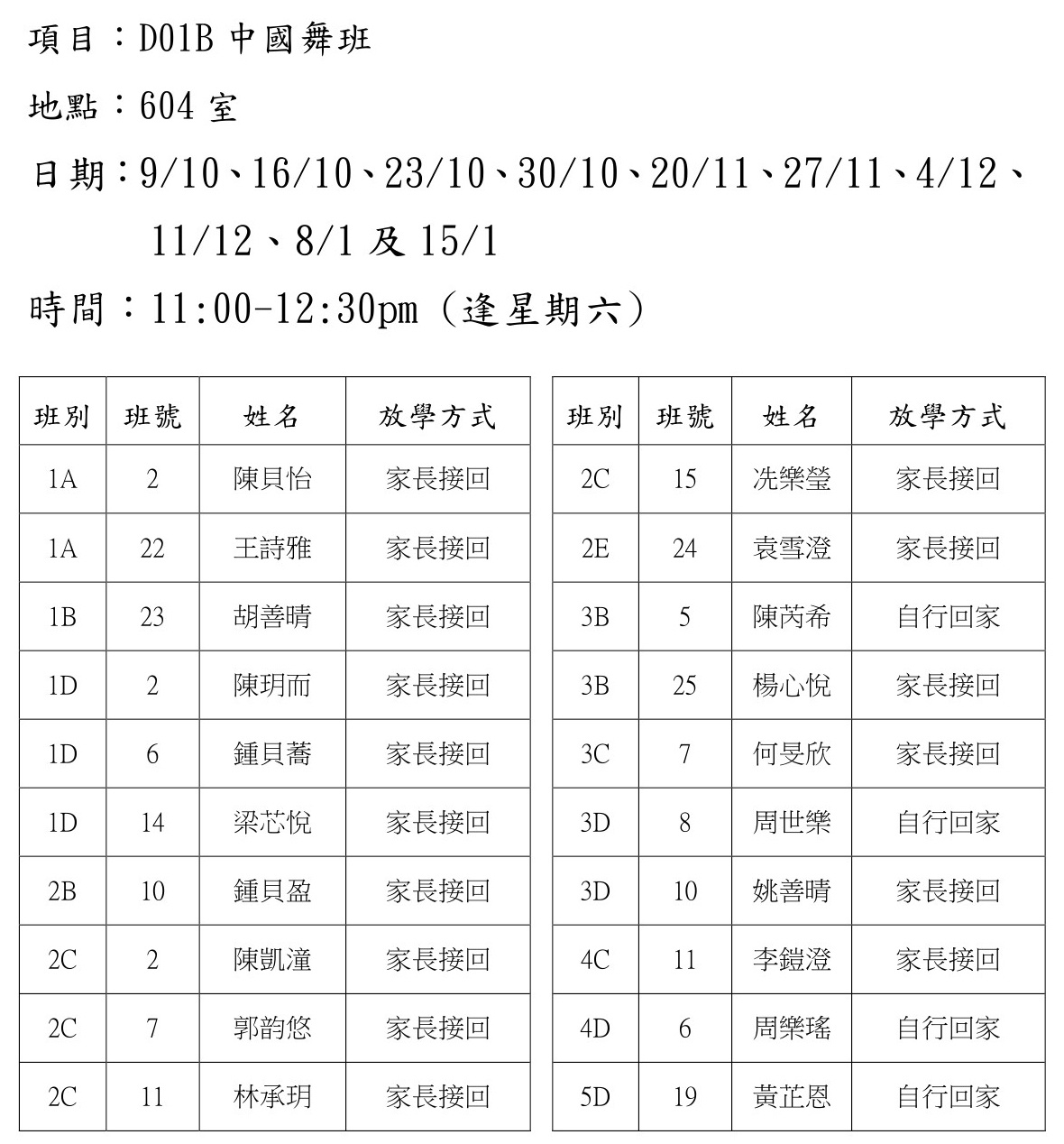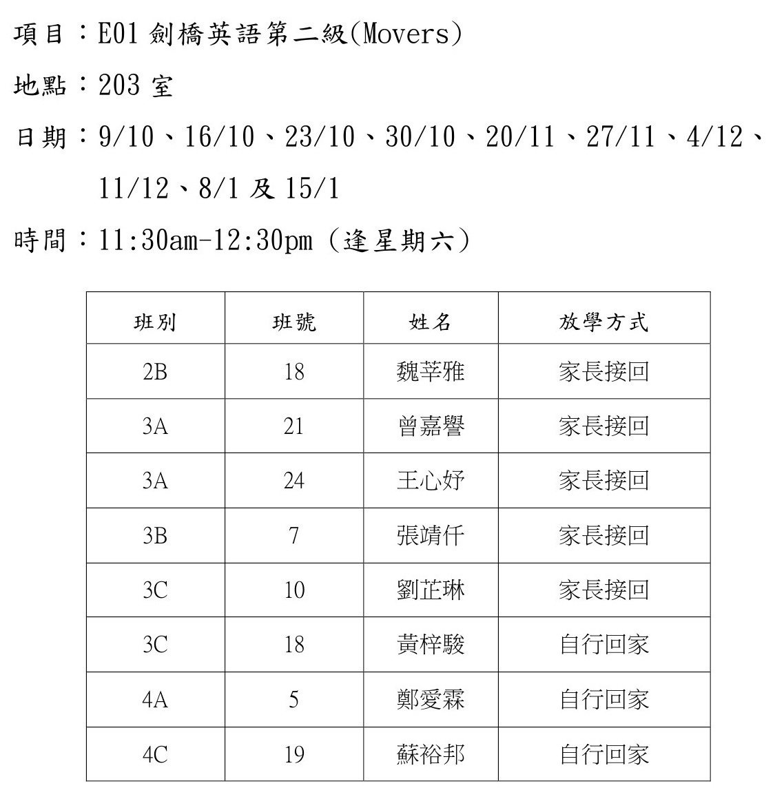 2021-2022年度 上學期周六興趣班名單