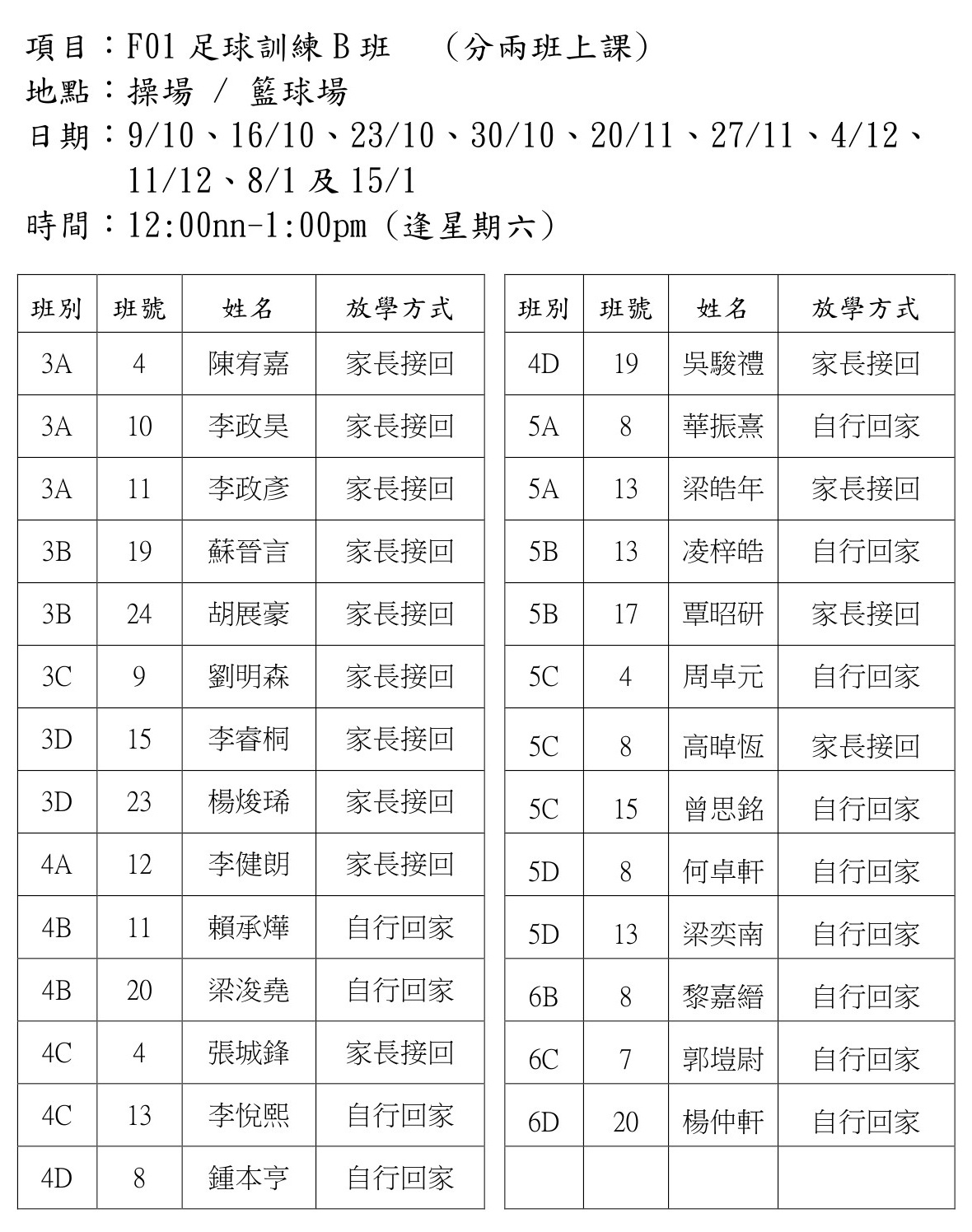 F01足球訓練B班(操場或籃球場)