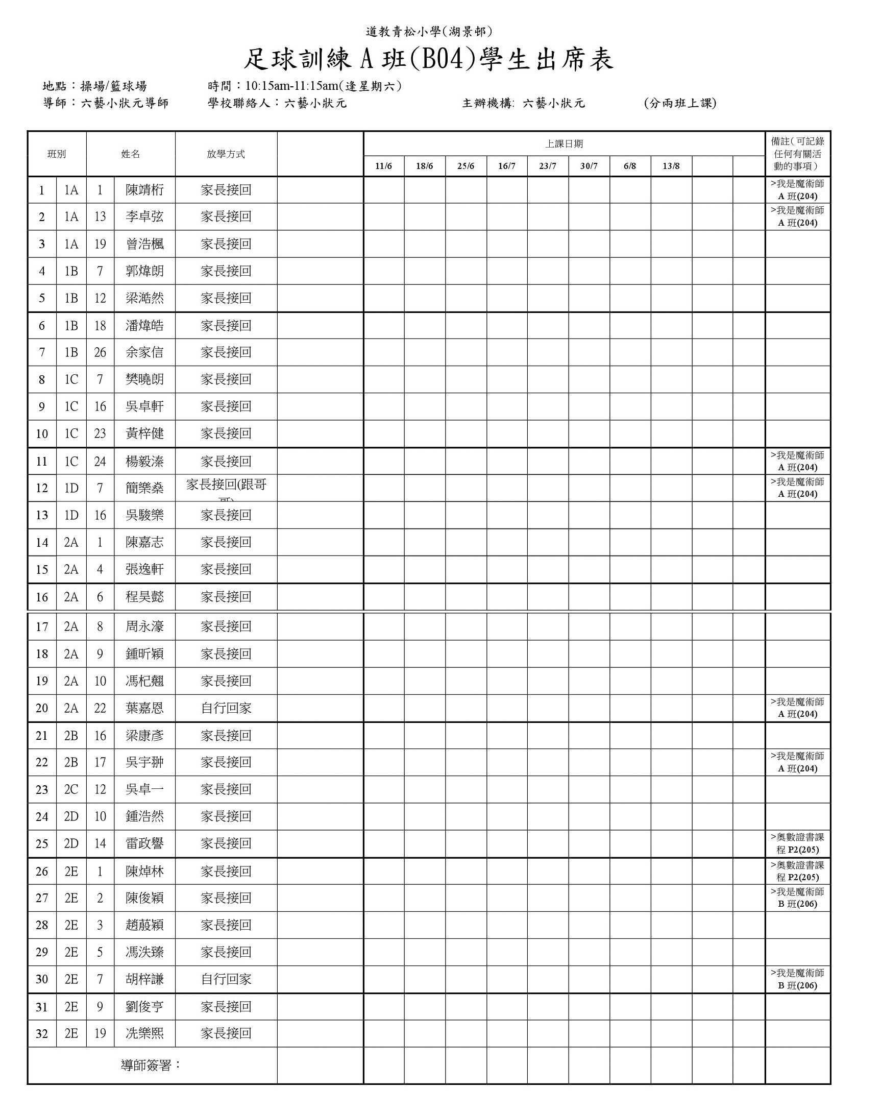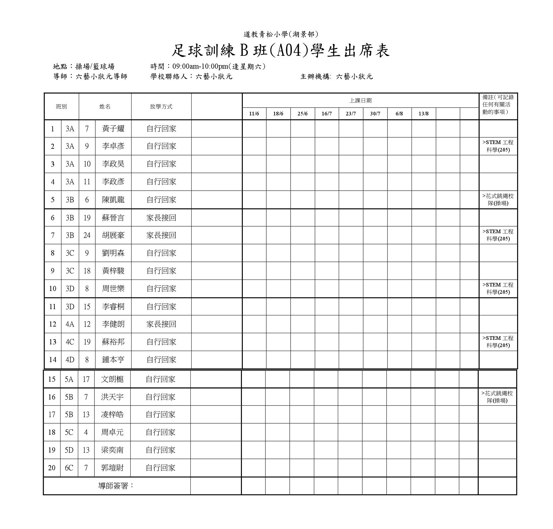 B04足球訓練A班(操場或籃球場)學生名單