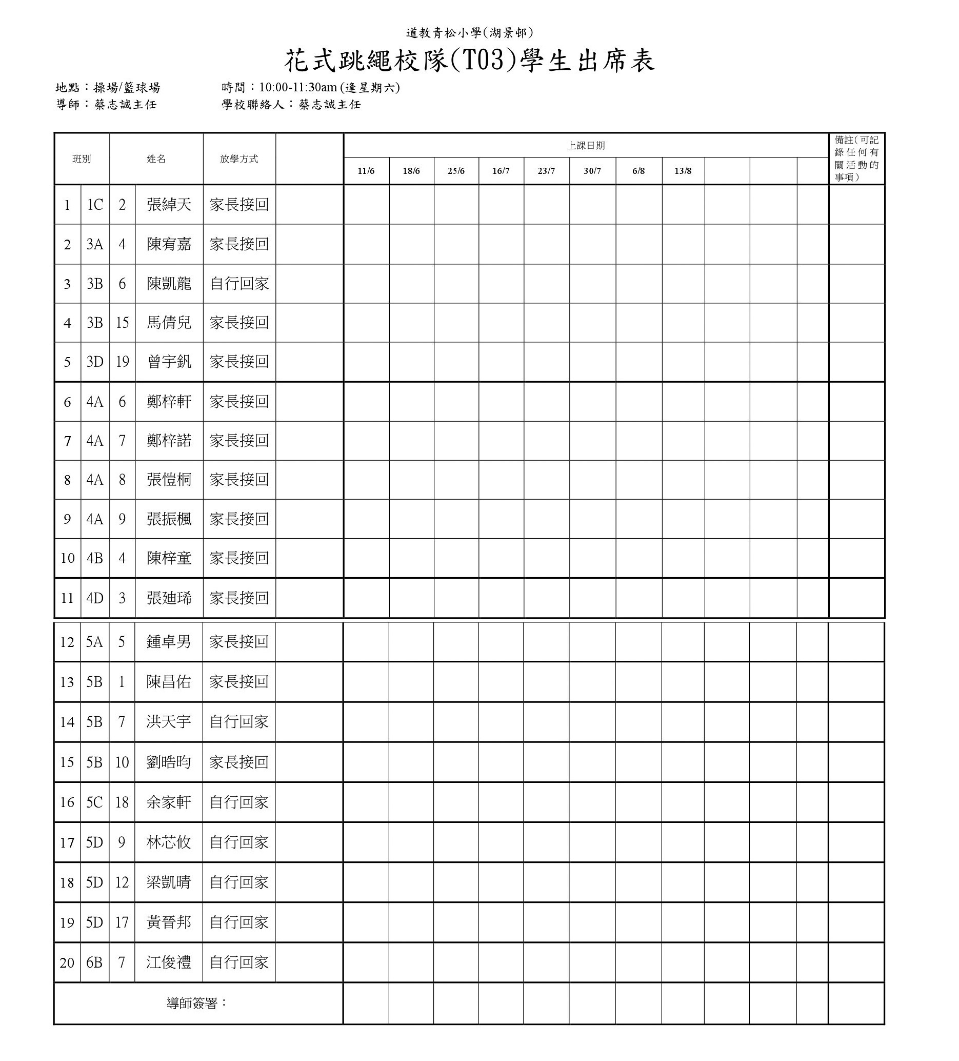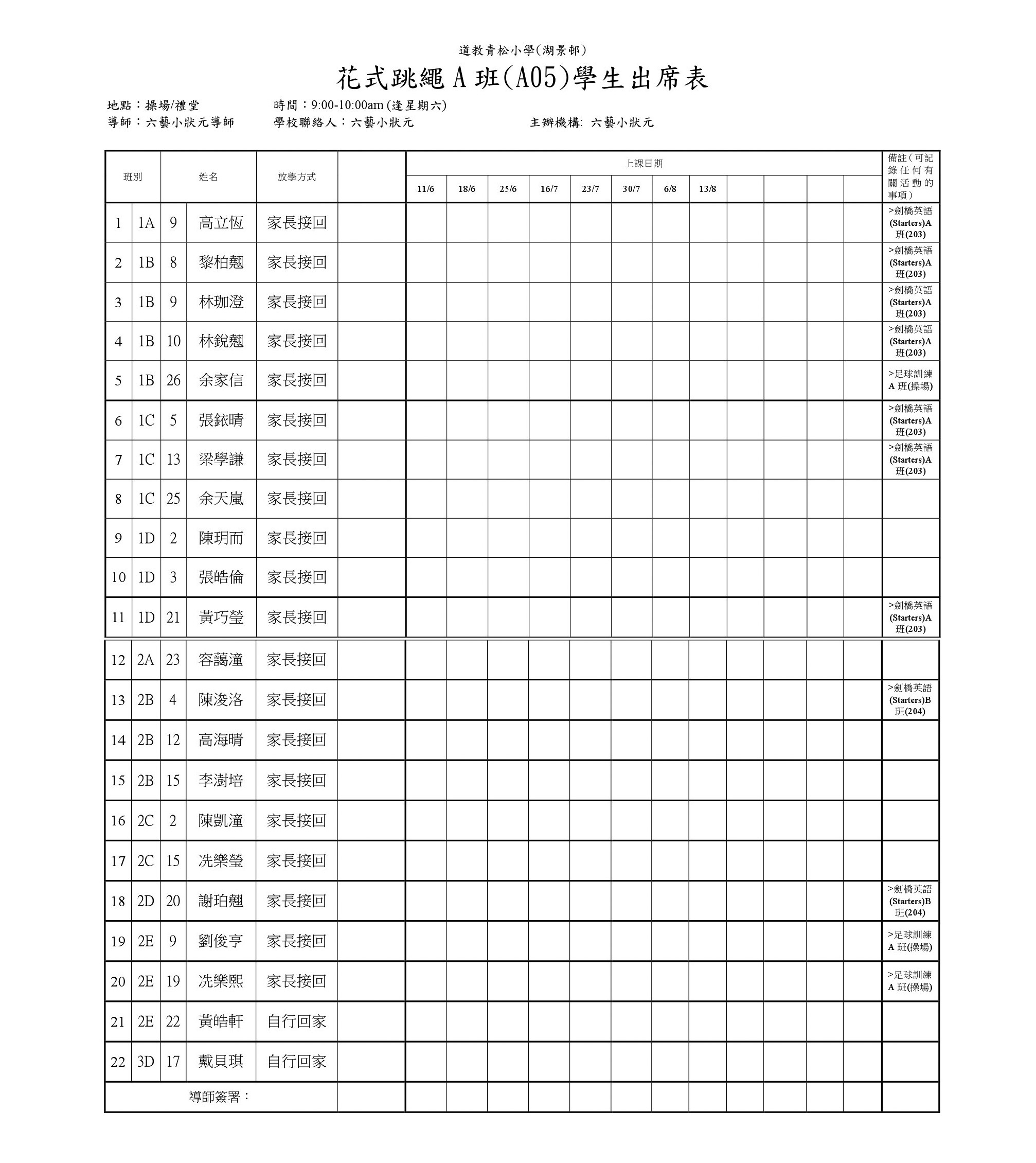 A05花式跳繩A班(操場或禮堂)學生名單