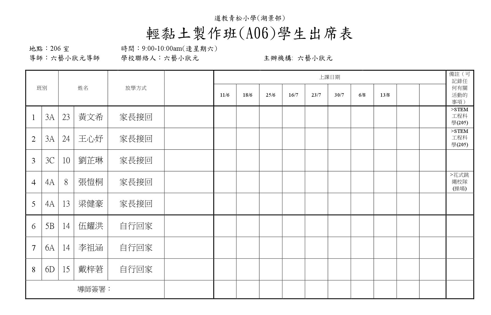 A06輕黏土製作(206)學生名單