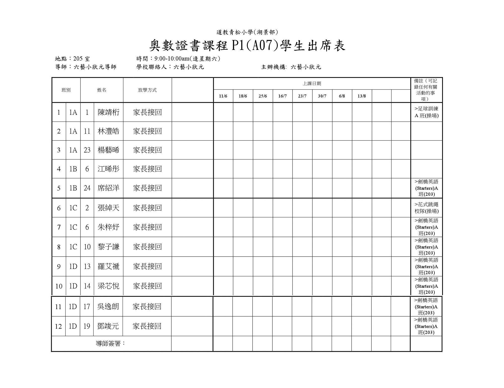 A07奧數證書課程P1(205)學生名單
