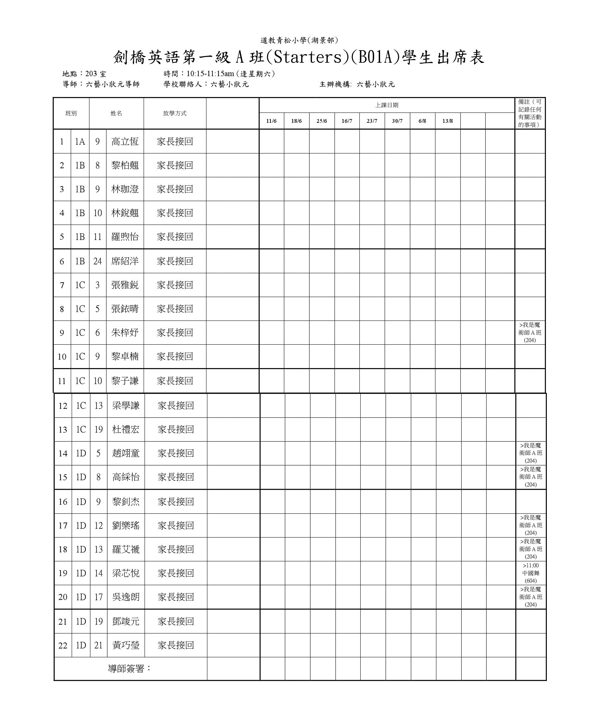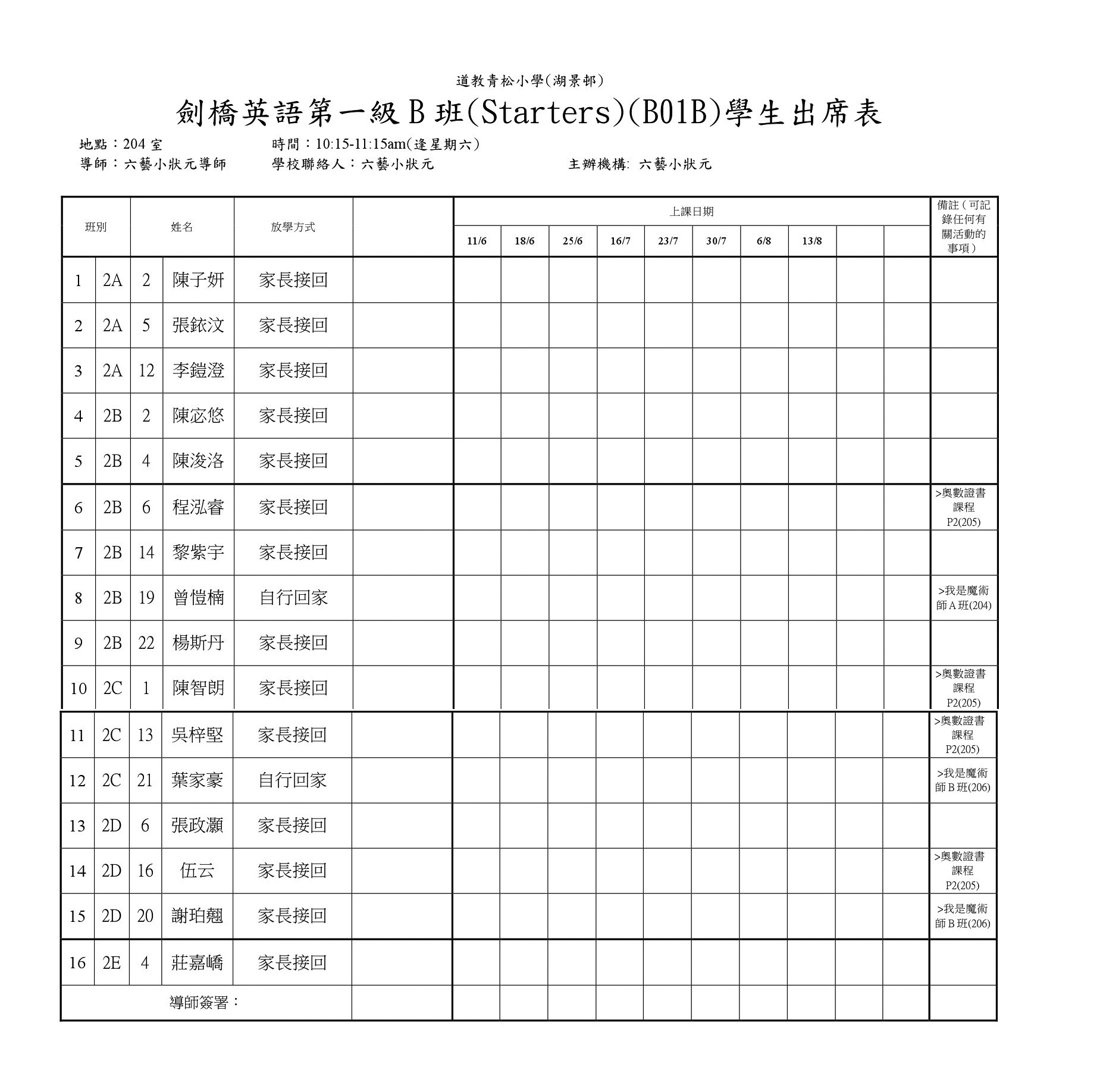 B01B劍橋英語第一級B班(Starters)(204)學生名單