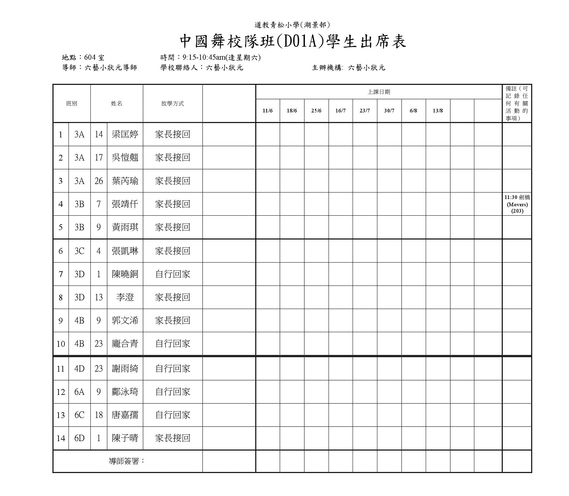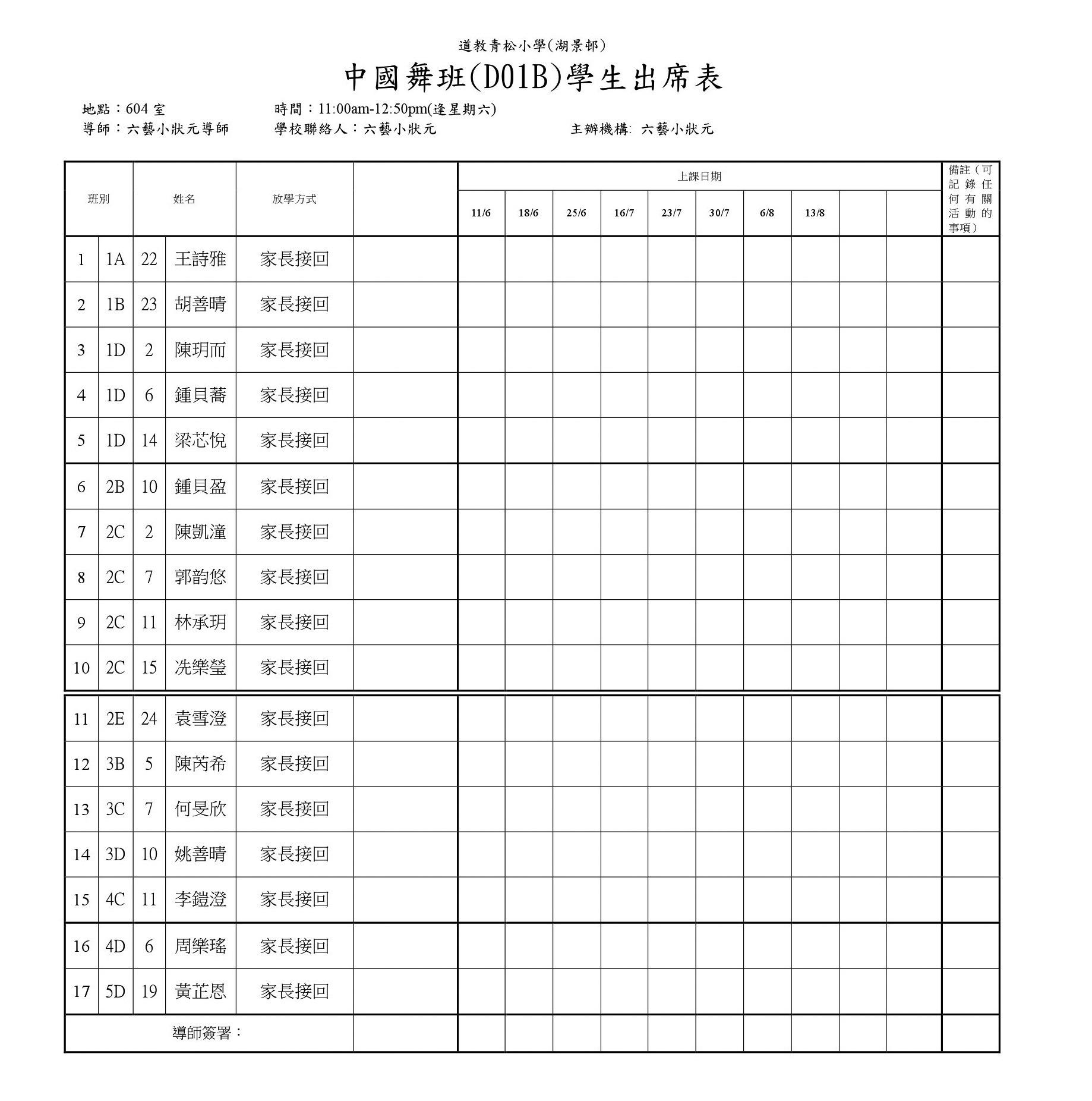 D01B中國舞班(604)學生名單