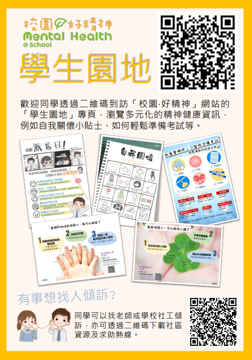 網站提供有關提升學生精神健康的多元化資訊,並新增以下專頁,方便教師、家長及學生獲取預防學童自殺及提升學生抗逆力的資訊
