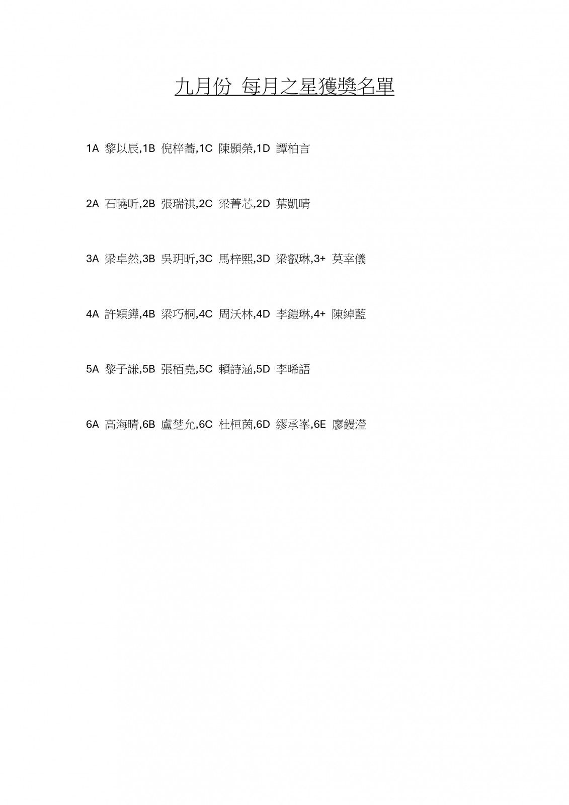 九月份 每月之星獲獎名單