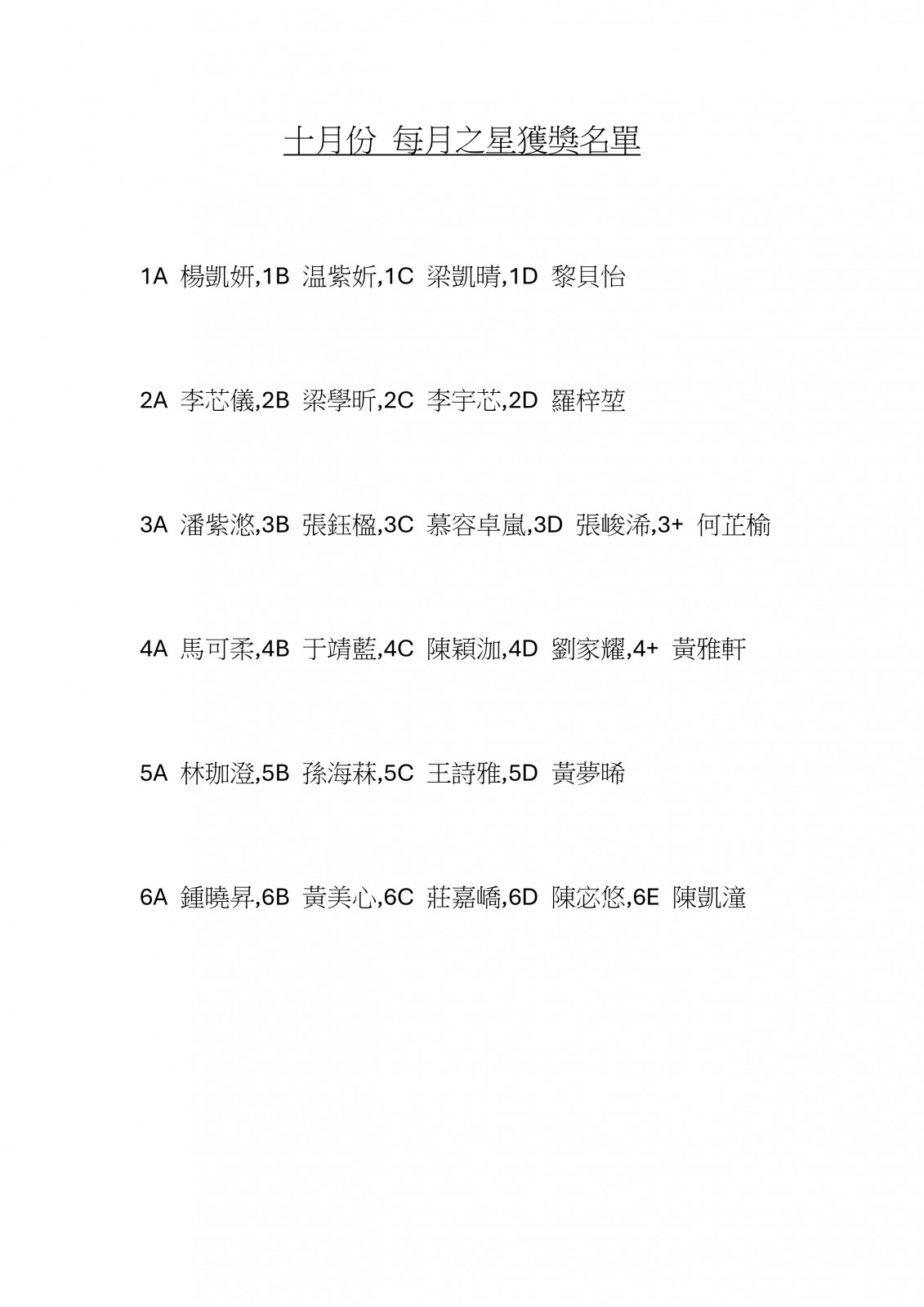 十月份 每月之星獲獎名單